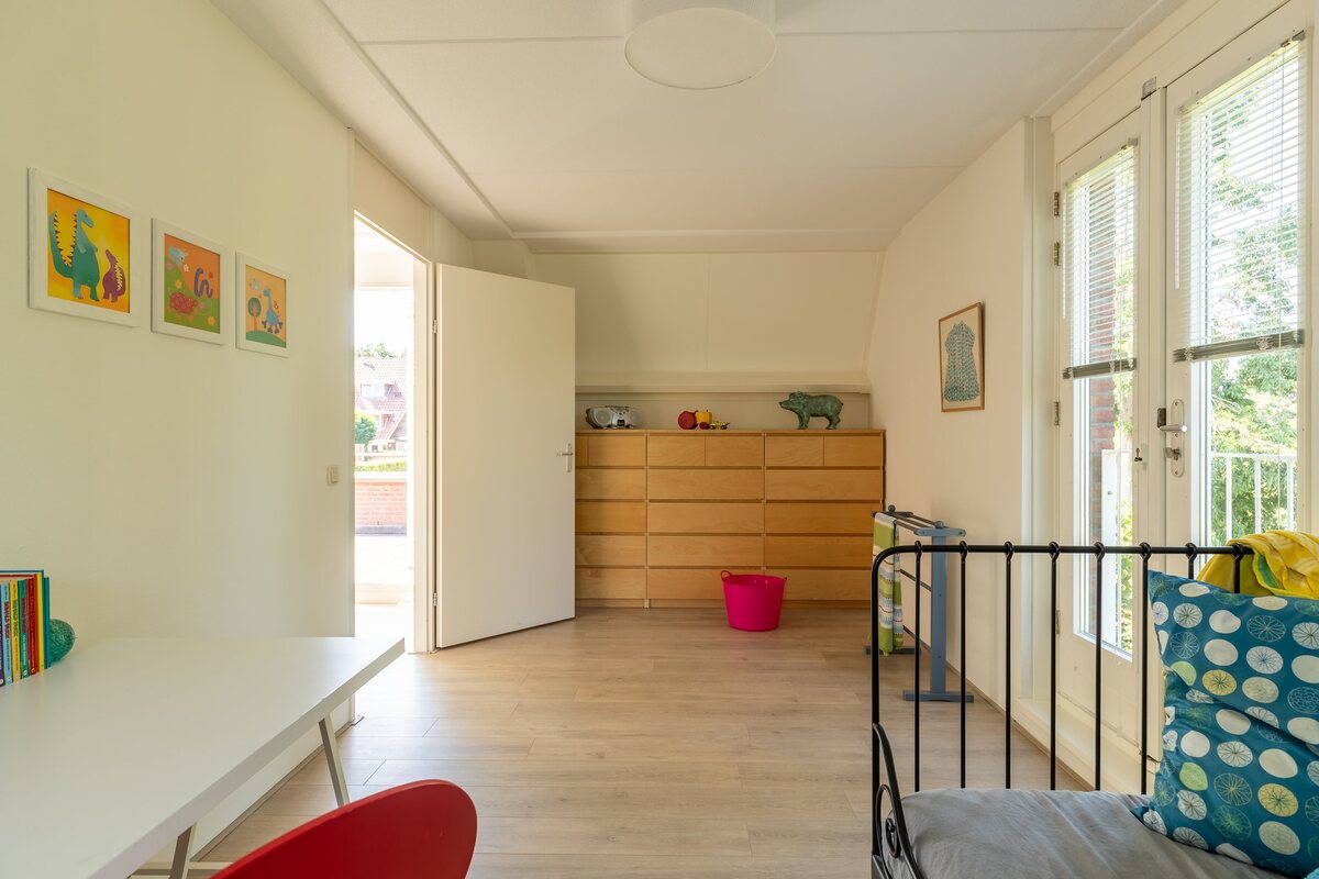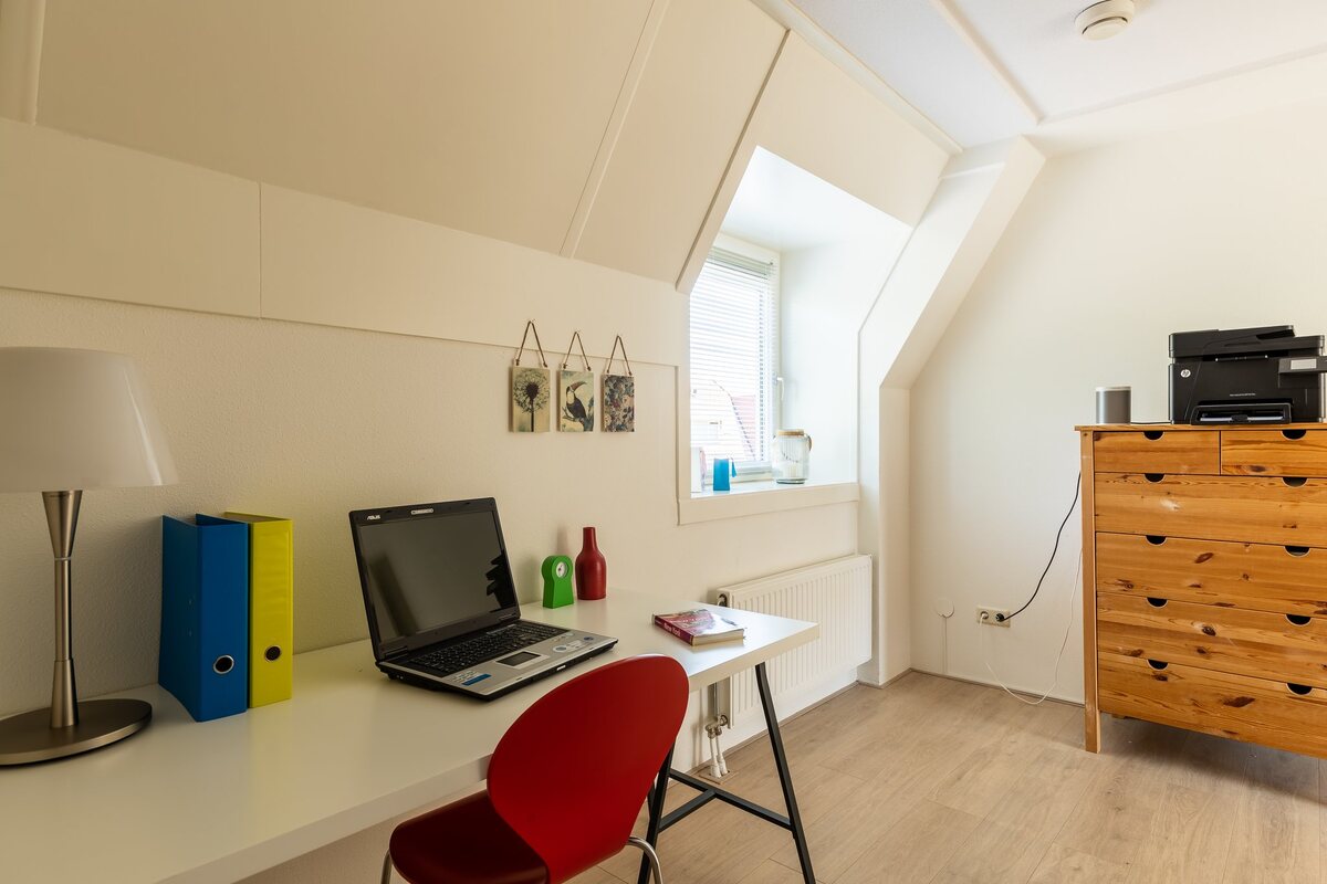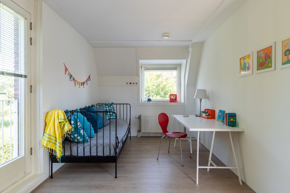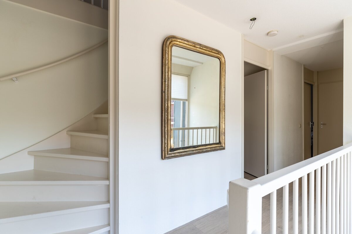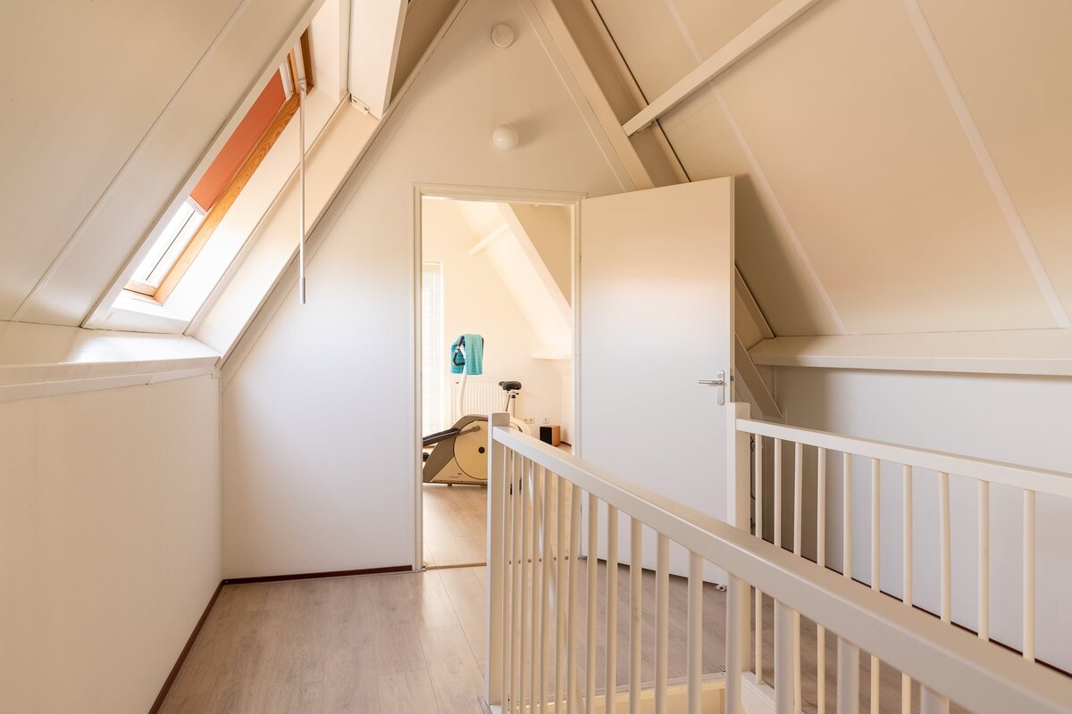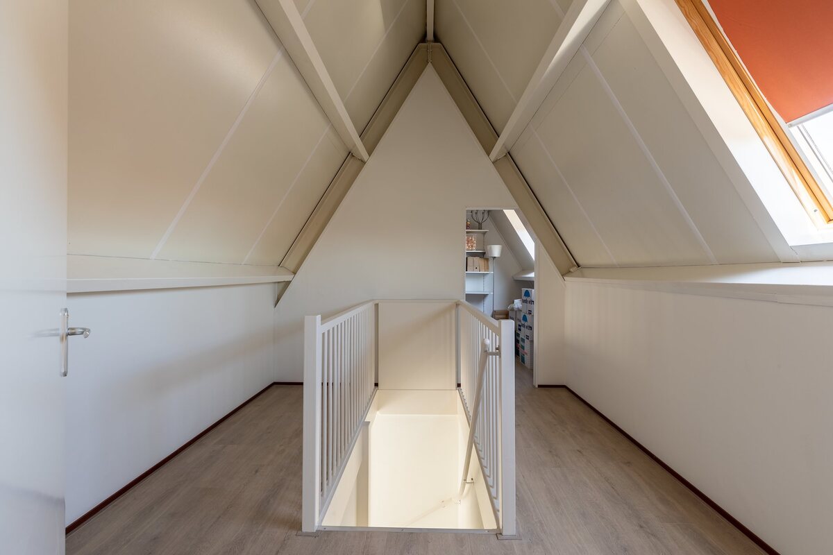 Tweede verdieping: riante overloop, lichte 5e slaapkamer (ca. 17 m2) en een nette afgewerkte zolder-/bergruimte.