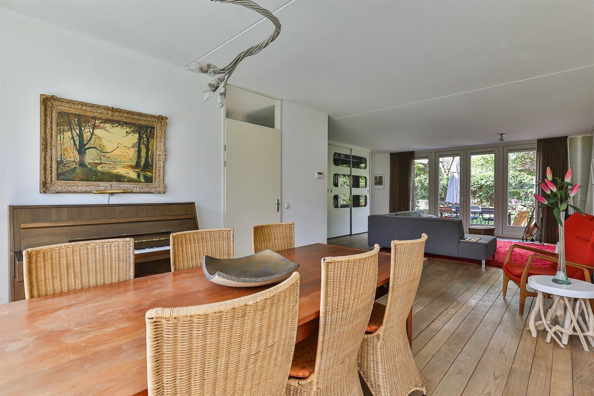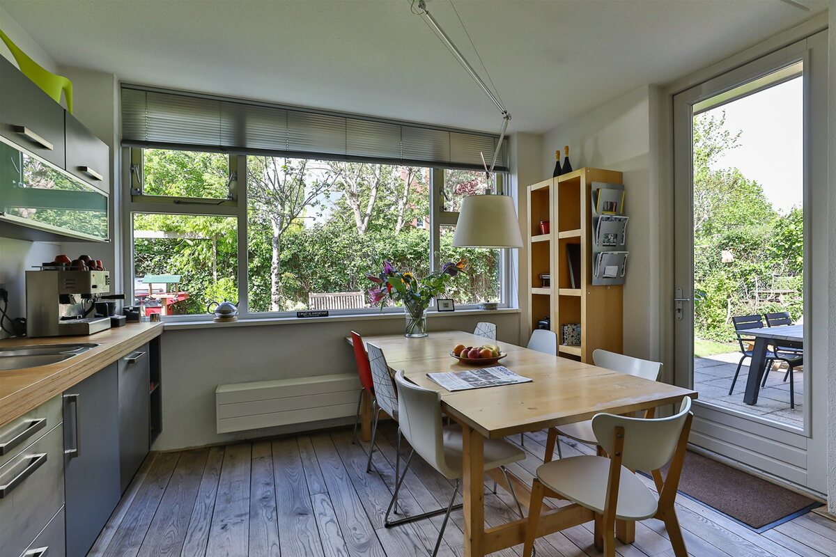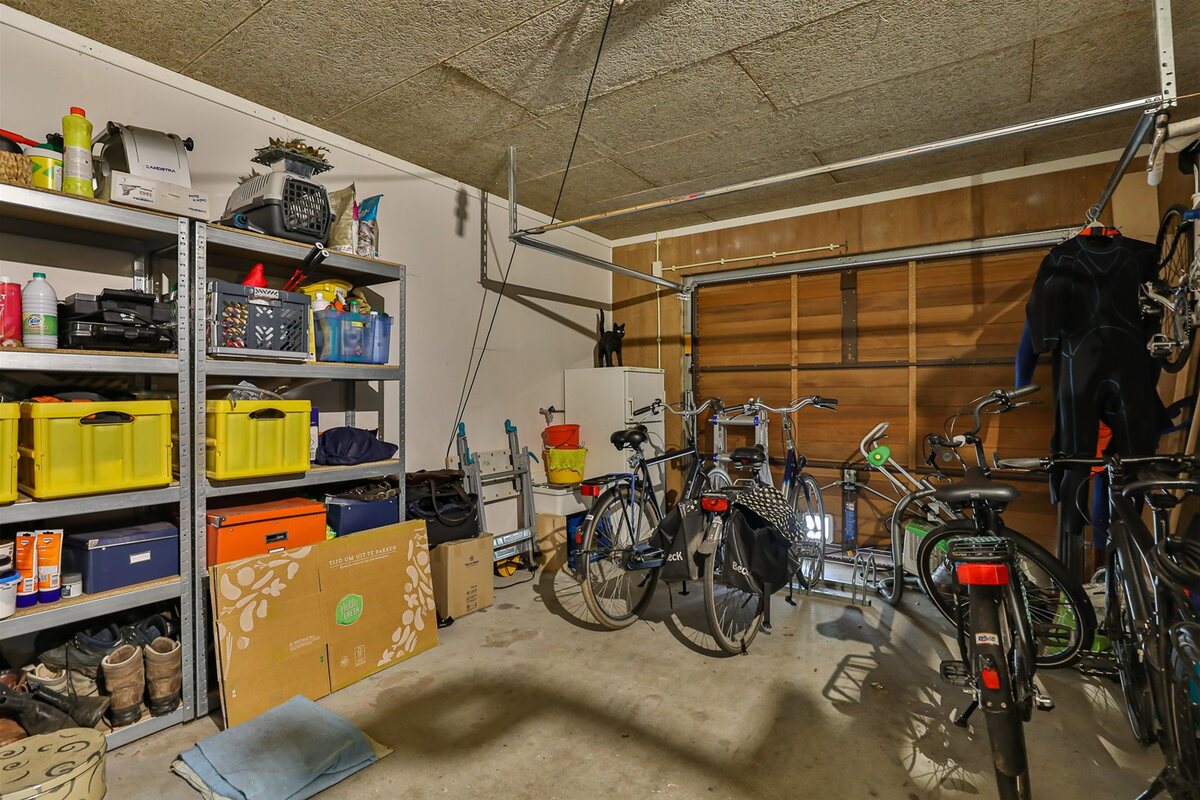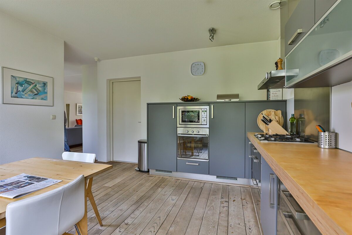 Indeling: hal met meterkast en trapopgang, toilet met fonteintje, ruime L-vormige woonkamer circa 51m² met essenhouten vloer en openslaande deuren naar het terras, halfopen woonkeuken circa 18m² met koelkast, diepvries, vaatwasser, oven, magnetron, kookplaat en afzuigkap, via de keuken toegang tot de tuin en binnendoor naar de garage van circa 22m².