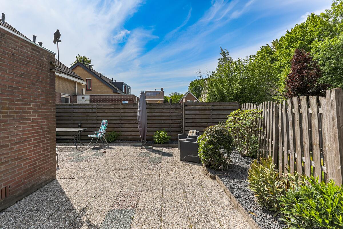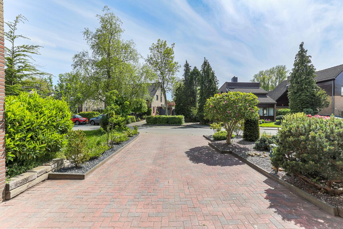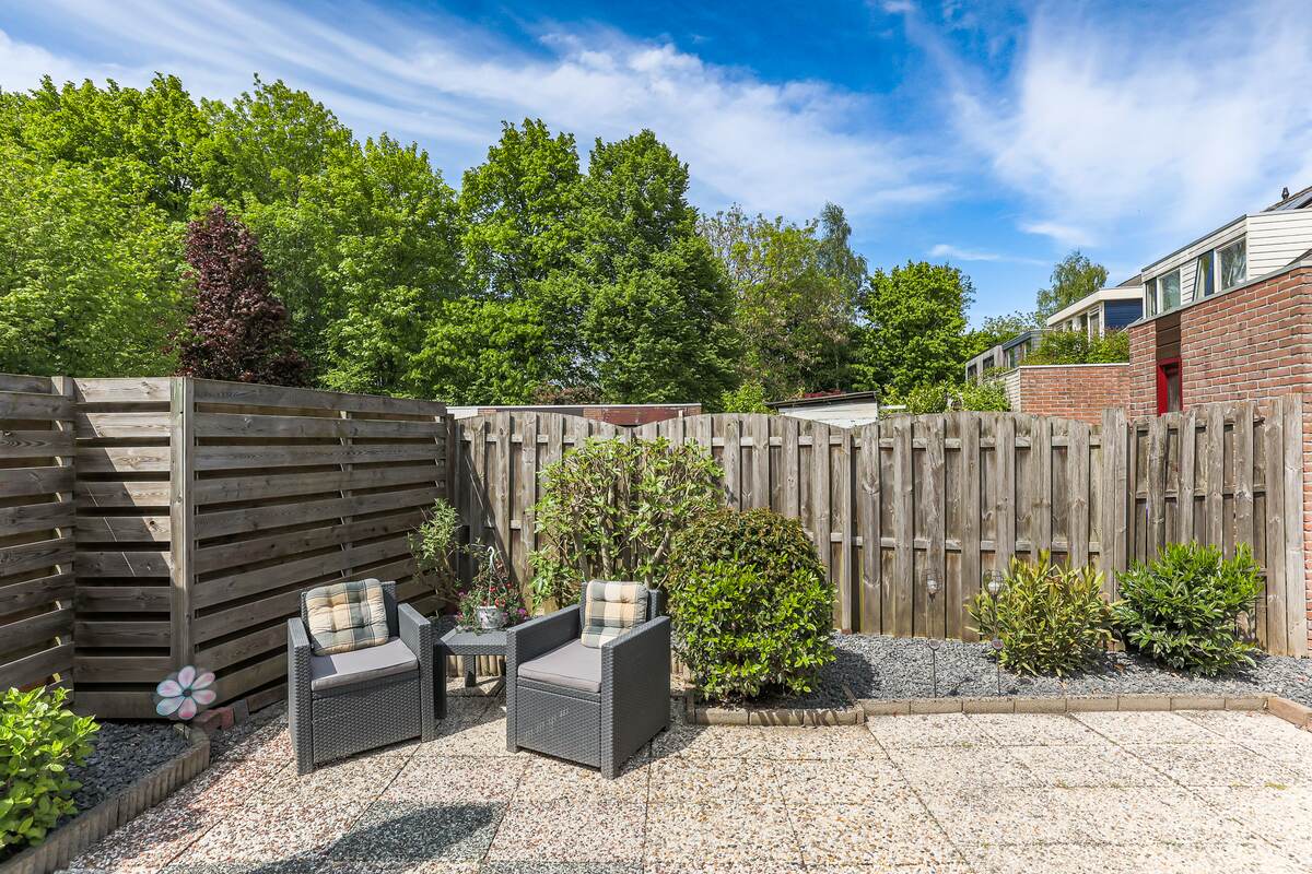 Voortuin: verzorgd en diep, daardoor veel gevoel van privacy. Lange eigen oprit (3 of 4 auto's).Achtertuin: L-vormig en ca. 10 meter diep (vanaf achtergevel woning) en aan de achterzijde ca. 8,5 meter breed. De tuin ligt 's zomers de gehele dag in de zon, inclusief de avond. Achterom is er nu niet, maar eventueel wel mogelijk.