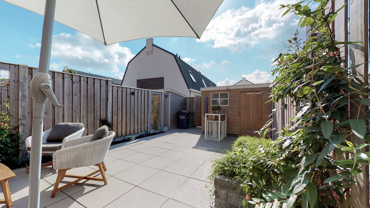 Voortuin met parkeerplaats. Fraaie, verzorgde diepe achtertuin met veel zon, houten berging en achterom.