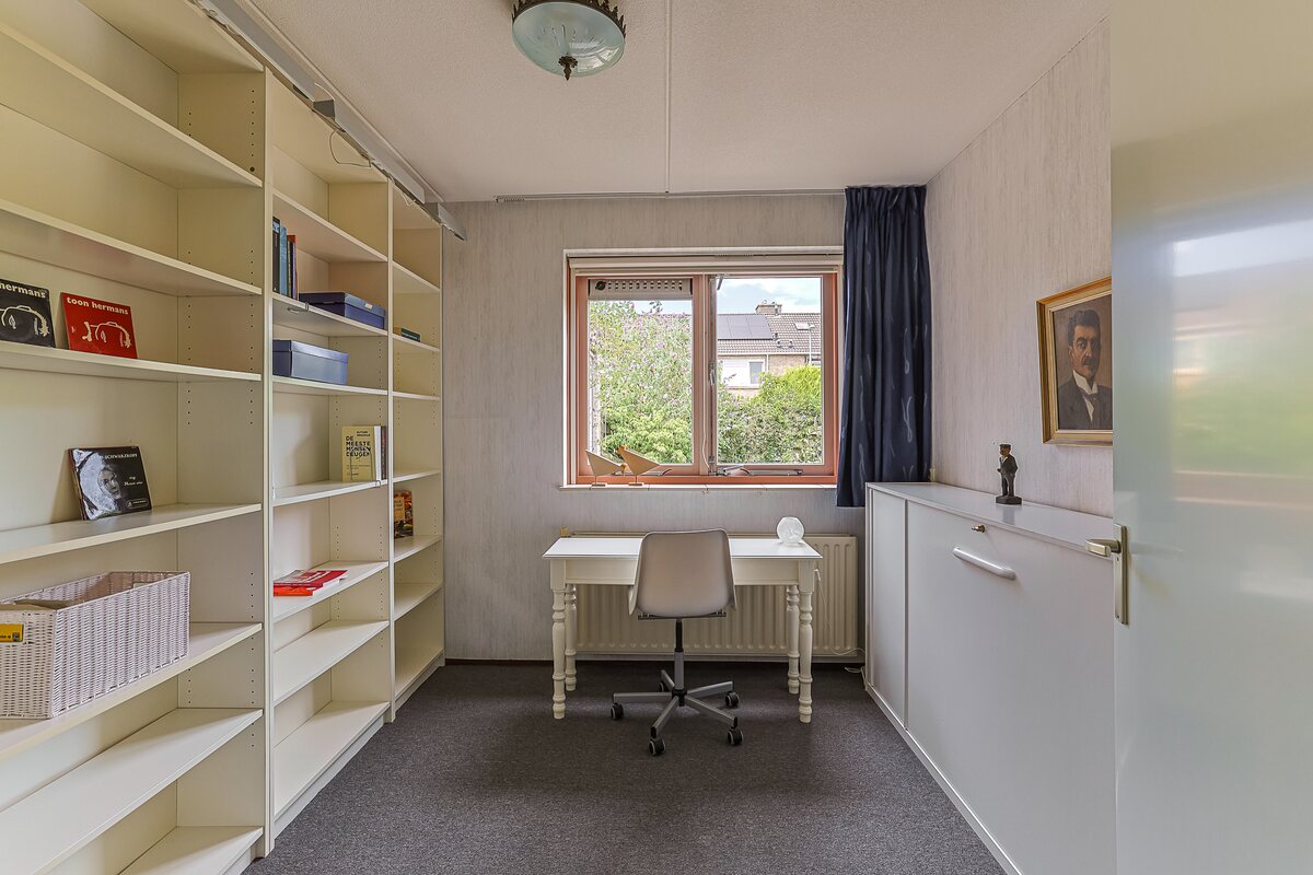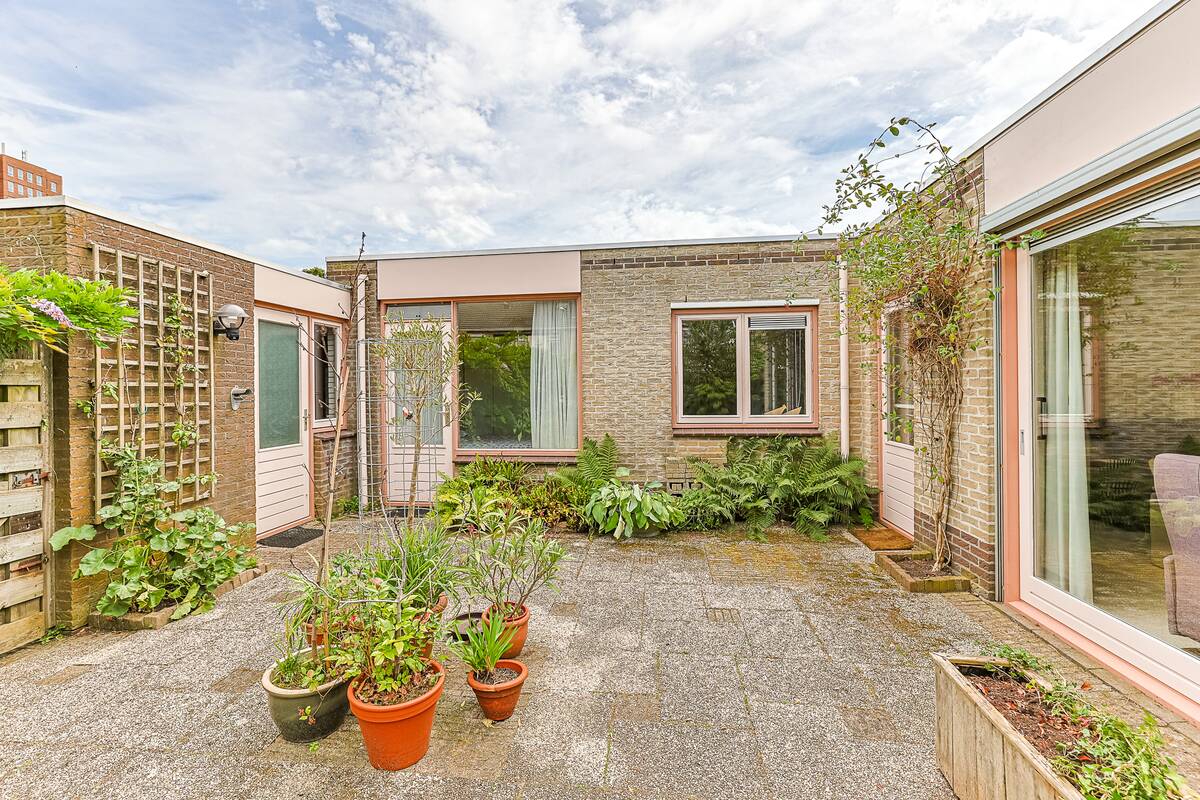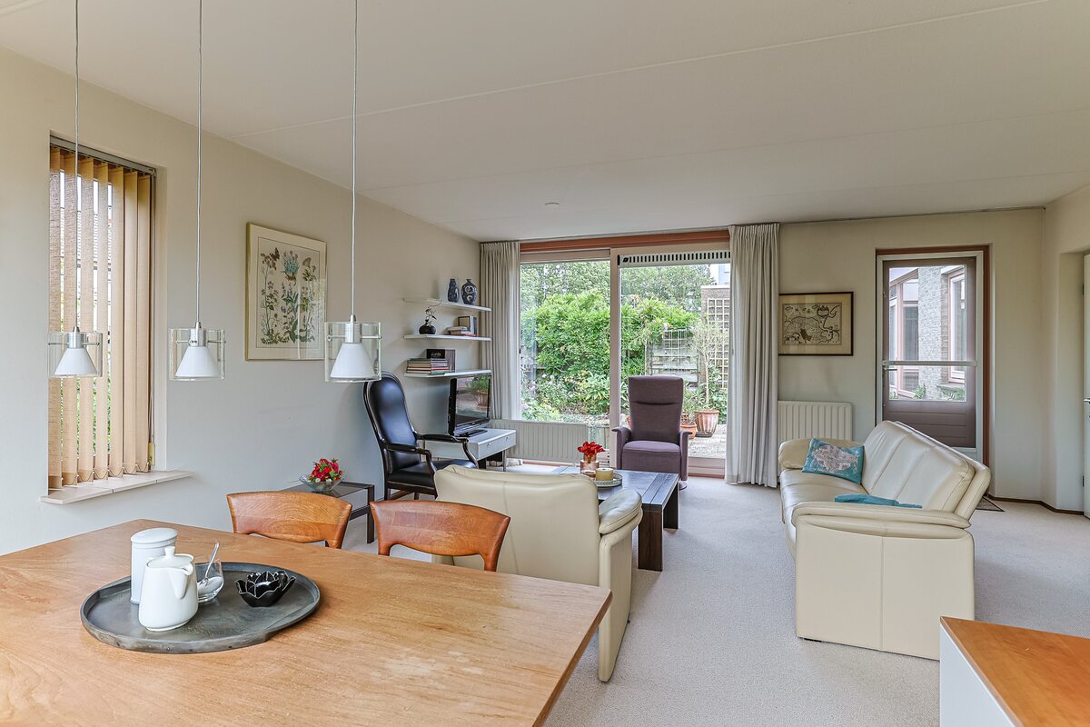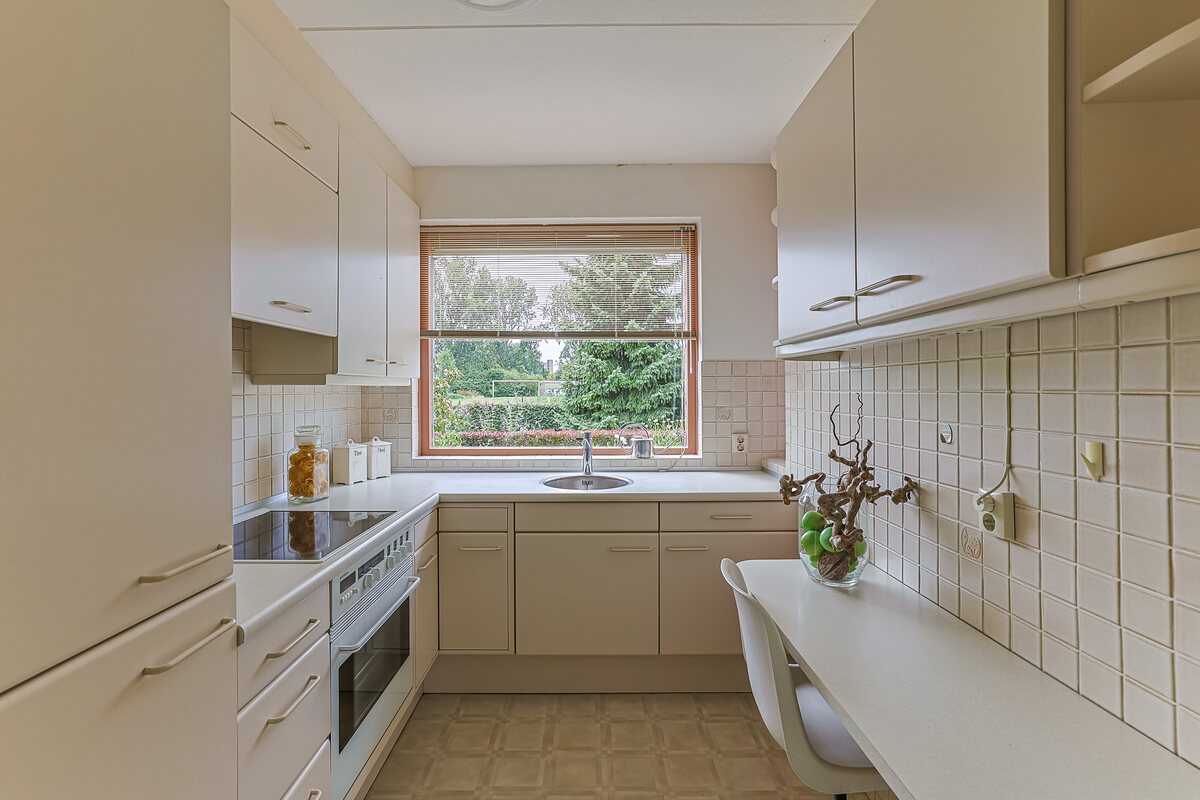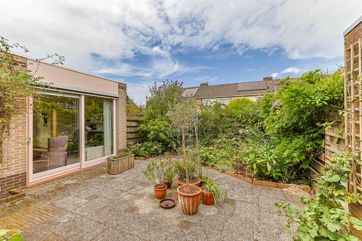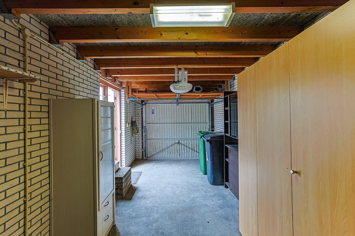 Hal entree met meterkast.L- vormige doorzonwoonkamer (ca. 29 m2) met schuifpui en loopdeur naar de ruime patio en zicht op het voorgelegen groen.Gesloten keuken (ca. 7m2) met eenvoudige doch nette inrichting en een diepe inloopkast. Doorloop naar de praktische bijkeuken (ca. 6 m2) met wasmachineaansluiting, CV ketel (ouder exemplaar) en loopdeur naar de voortuin.Achterhal met toilet en toegang tot de badkamer en de slaapkamers.Eenvoudige doch nette badkamer (ca. 5 m2) met ligbad, douche en vaste wastafel.Twee slaapkamers van ca. 13 m2 en 8 m2, waarvan de laatste met loopdeur naar de patio. Via de patio is ook de garage bereikbaar (ca. 15m2, met spouwmuren) en een elektrische klapdeur.Voor de garage ligt een eigen parkeerplaats. Patio: 5,7 m. bij 8,5 m. Lekker zonnig en besloten.