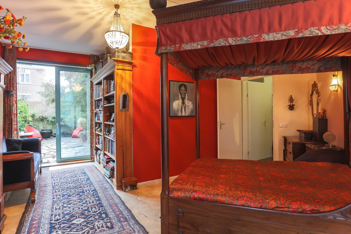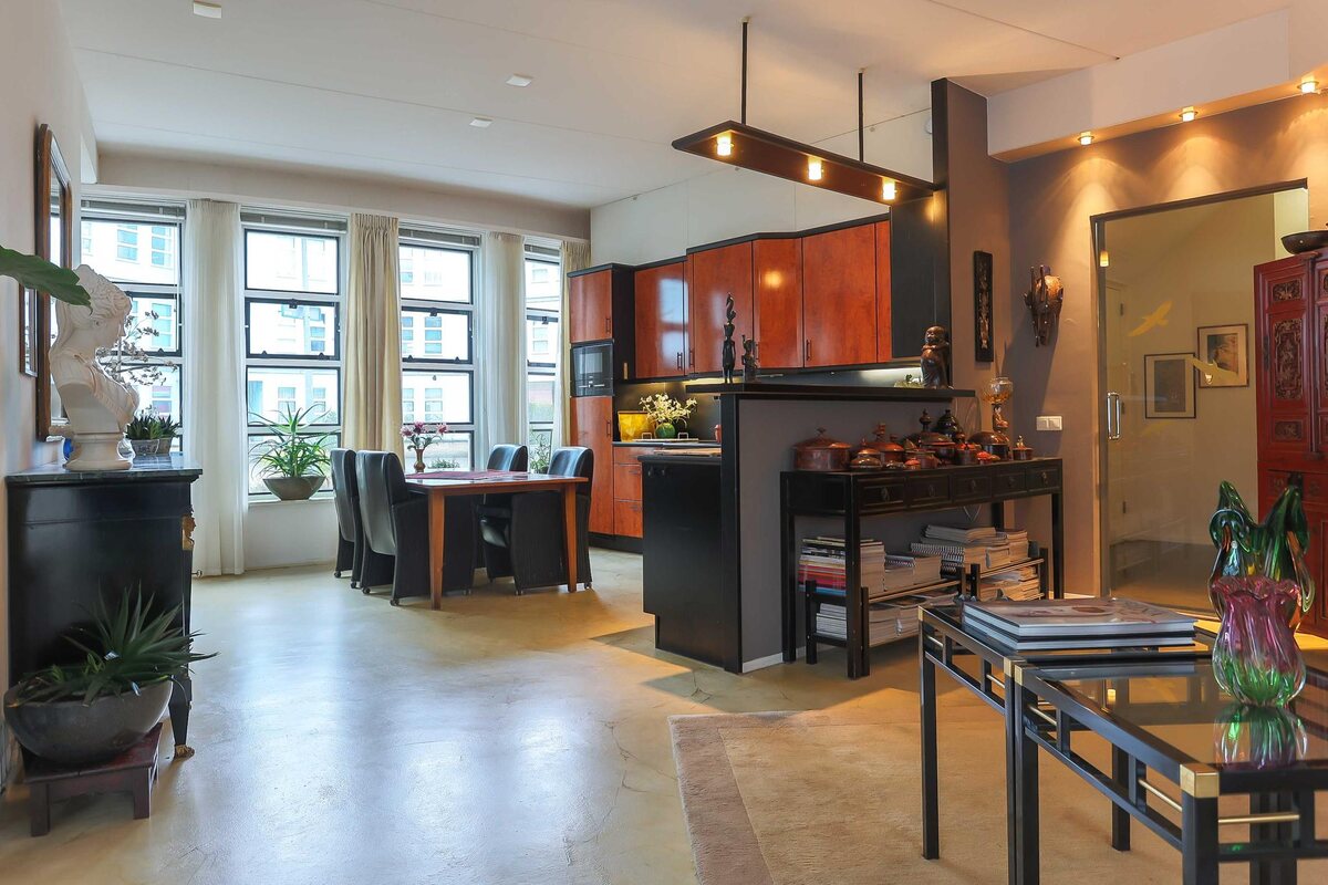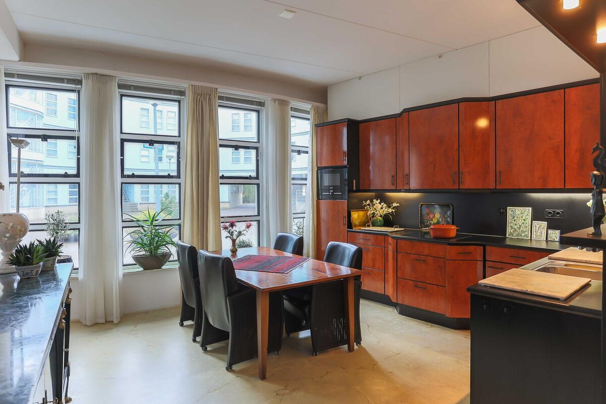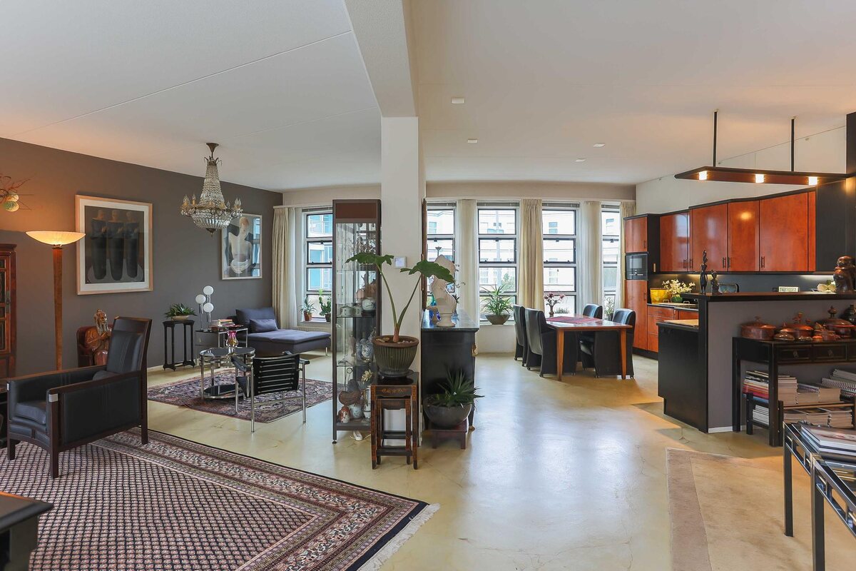Entree/hal met granietvloer, toilet meterkast en toegang tot alle vertrekken.Woonkamer met open woonkeuken (ca 93 m2!) met gashaard, unieke (geschilderde marmer) vloer, veel raamoppervlak en uitkijk op de binnenplaats van het complex en op de Violenstraat. De woonkamer en keuken zijn gescheiden middels een room-divider. Deur naar het inpandige balkon aan de voorzijde.De keukeninrichting is wat gedateerd, maar wel voorzien van alle gemakken: koel-vriescombi, vaatwasser, oven, inductiekookplaat en heel veel bergruimte in onder- en bovenkastjes.Het atelier (ca. 38 m2) is bereikbaar via fraaie karakteristieke openslaande deuren vanuit de woonkamer en vanuit de hal. Deze prachtige multifunctionele ruimte heeft eveneens een deur naar het voorgelegen balkon.De L-vormige slaapkamer (ca. 28 m2) heeft een eigen balkon, walk-in-closet en een schuifpui naar de stadstuin.Badkamer (ca. 10 m2) met ligbad, wastafelmeubel, douche en toilet.Stadtuin: op de middag- en avondzon, ca. 8,5 m. diep bij 3,5 m breed.Ruime bijkeuken (ca. 9 m2) met CV ketel en wasm. aansluiting.