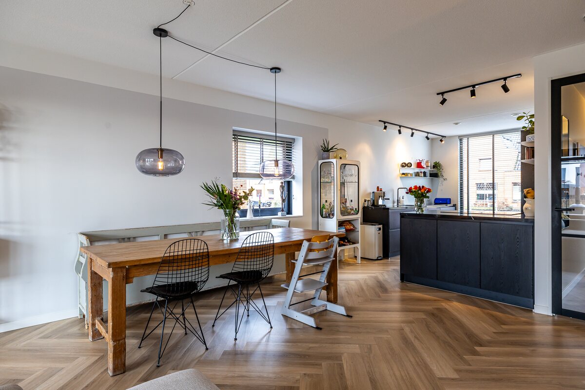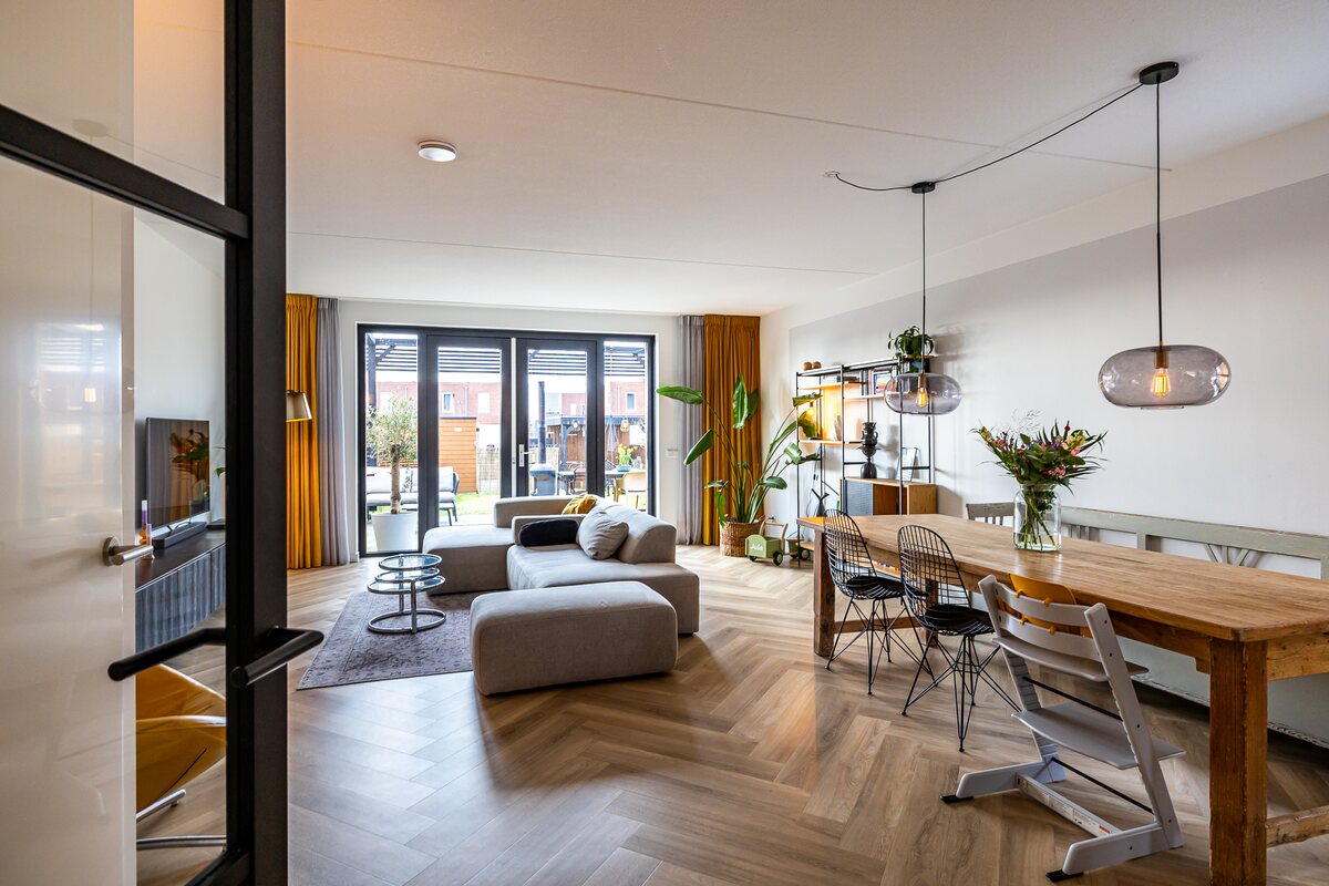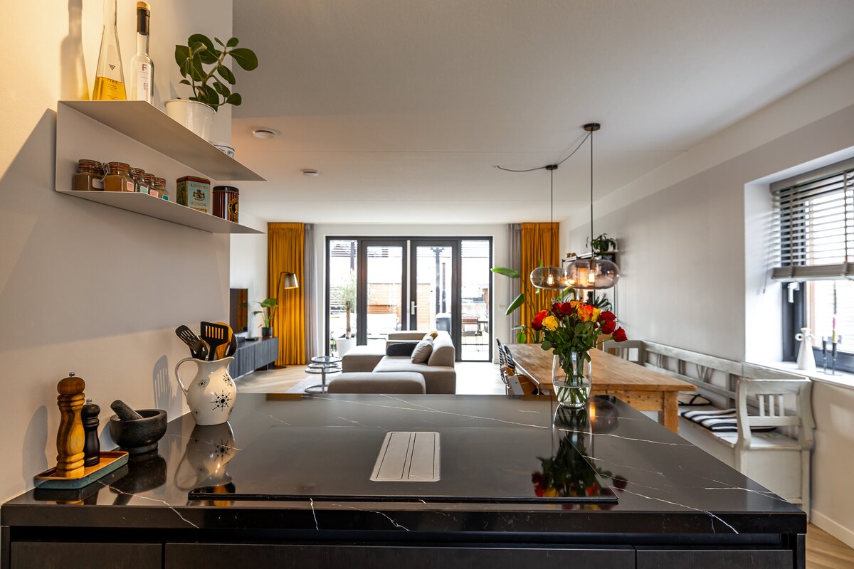 Entree/hal het toilet, trapopgang en doorloop door een glazendeur naar de riante panoramische woonkamer met fraaie visgraat pvc-vloer. Deze tuingerichte kamer biedt veel natuurlijk daglicht door zowel glas aan de achterzijde, een raam in de zijgevel en in de voorgevel bij de keuken. Onder de trap bevindt zich een vaste kast met de warmtepomp installatie.Middels de openslaande deuren staat u zo op het buitenterras in de tuin. De moderne open keuken heeft een luxe uitstraling. Het kook-/spoel(schier)eiland is voorzien van een inductieplaat met geïntegreerd afzuigsysteeem en veel bergruimte in lades. Vanachter het eiland kijkt u in de prachtige woonkamer en over de tuin. Wandmeubel met koel-/vriescombi, combimagnetron en een wandmeubel met de gootsteen, vaatwasser, daarnaast veel bergruimte in onder- en bovenkasten.