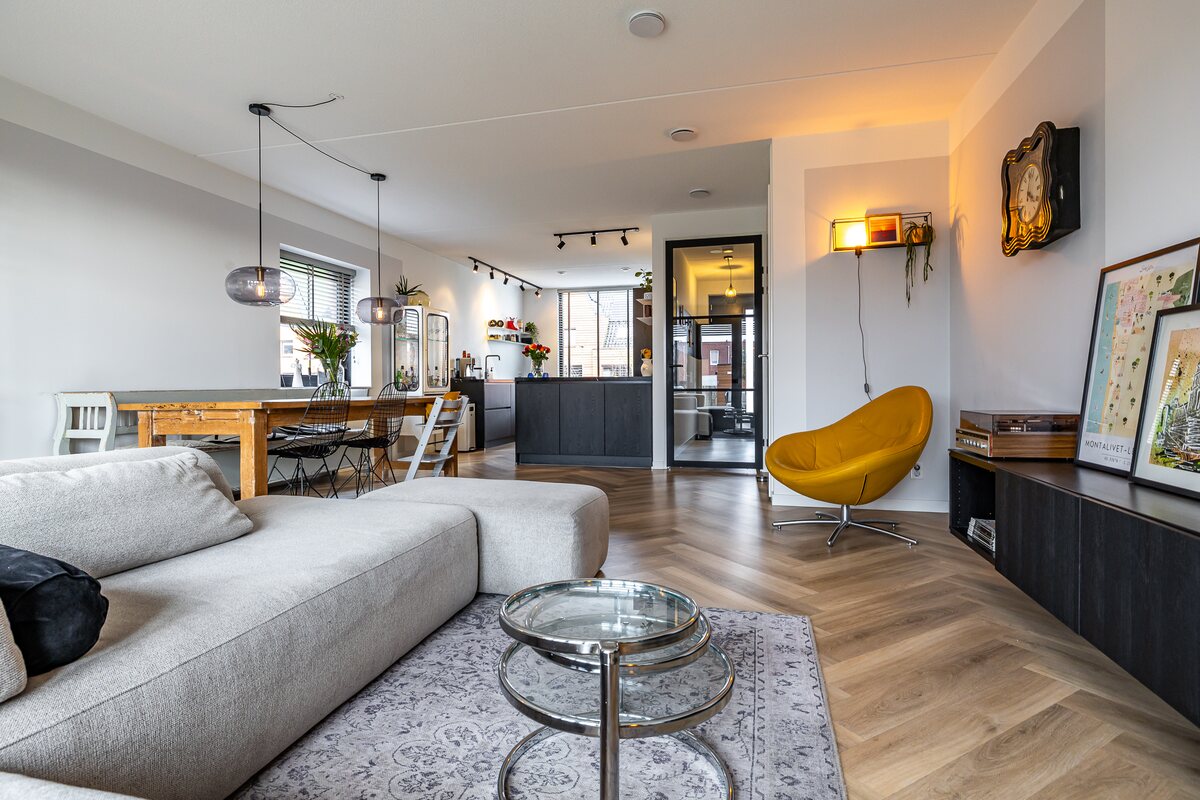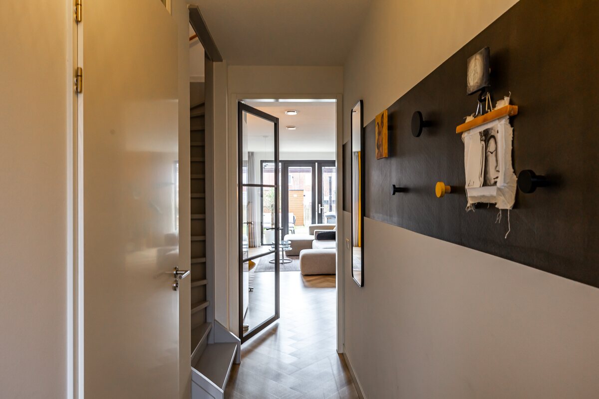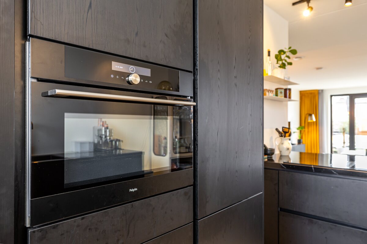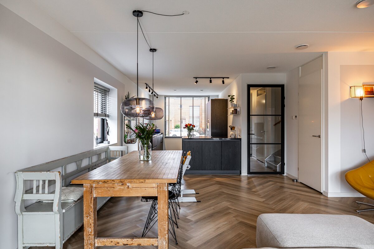 Entree/hal het toilet, trapopgang en doorloop door een glazendeur naar de riante panoramische woonkamer met fraaie visgraat pvc-vloer. Deze tuingerichte kamer biedt veel natuurlijk daglicht door zowel glas aan de achterzijde, een raam in de zijgevel en in de voorgevel bij de keuken. Onder de trap bevindt zich een vaste kast met de warmtepomp installatie.Middels de openslaande deuren staat u zo op het buitenterras in de tuin. De moderne open keuken heeft een luxe uitstraling. Het kook-/spoel(schier)eiland is voorzien van een inductieplaat met geïntegreerd afzuigsysteeem en veel bergruimte in lades. Vanachter het eiland kijkt u in de prachtige woonkamer en over de tuin. Wandmeubel met koel-/vriescombi, combimagnetron en een wandmeubel met de gootsteen, vaatwasser, daarnaast veel bergruimte in onder- en bovenkasten.