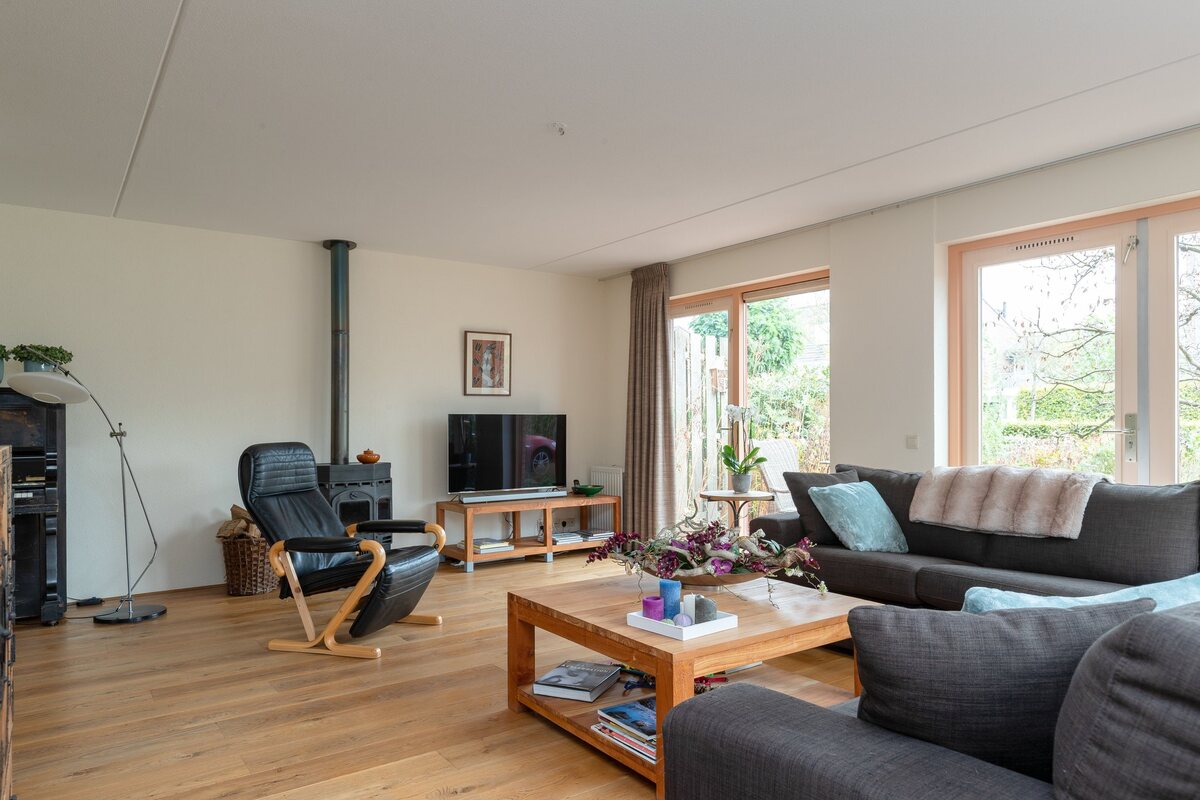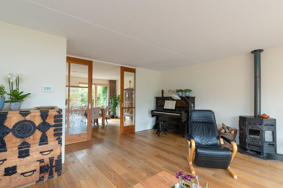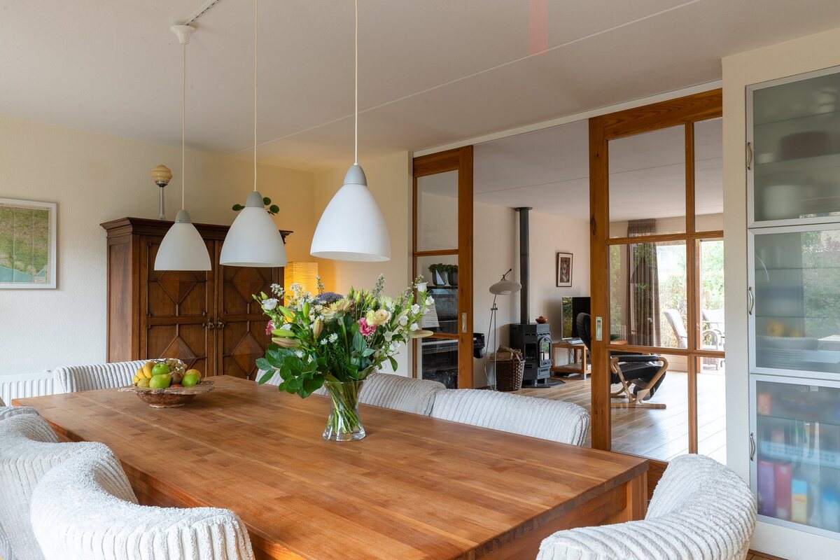 Begane grond: ruime hal met garderobe, trapopgang, toiletruimte, meterkast, deur naar riante garage van circa 22 m2. Vanuit de hal nog toegang tot de bijkeuken van circa 5 m2. De woonkamer (32 m2) en de woonkeuken (23 m2) zijn middels suitedeuren van elkaar gescheiden, met een prachtig eindresultaat als gevolg. In de woonkamer is een houtkachel, een ruime trapkast en zijn er openslaande deuren naar de voortuin. De lichte en praktische woonkeuken heeft een smaakvol keukenblok v.v. inbouwapparatuur en een fraaie keukenkast.