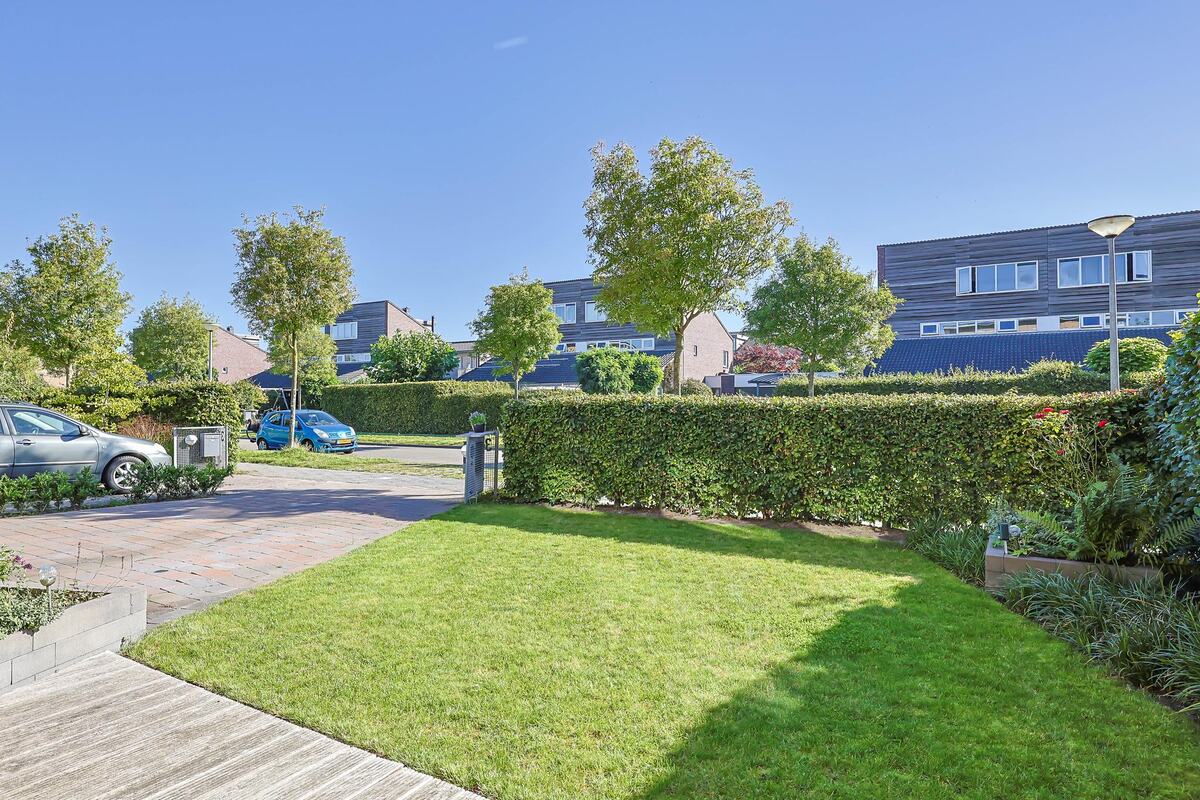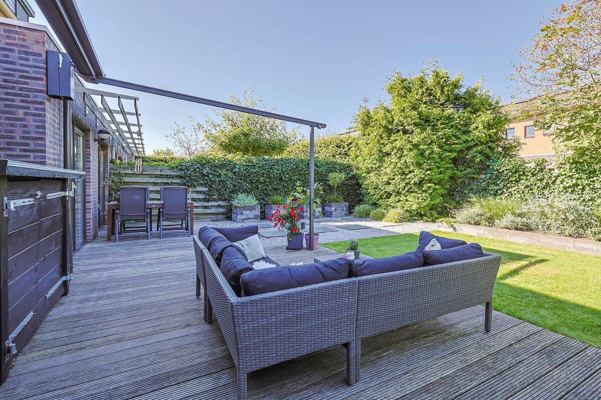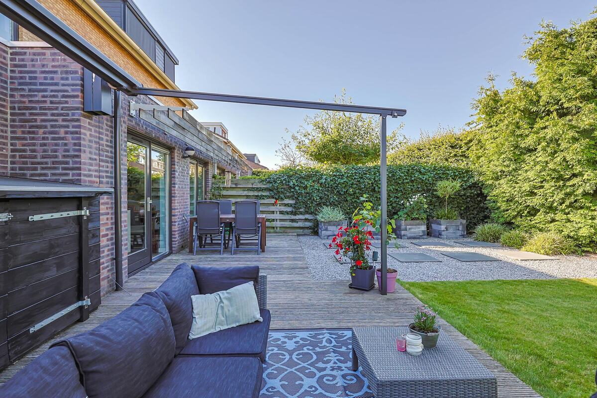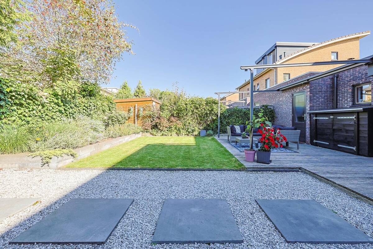 Heerlijk zonovergoten en besloten achtertuin (ca. 10 bij 10 m.) op het westen met groot elektrisch zonnescherm, buitenkraan, terras, borders en gazon.Grote eigen oprit voor drie auto's.Ruime voortuin op de ochtendzon.