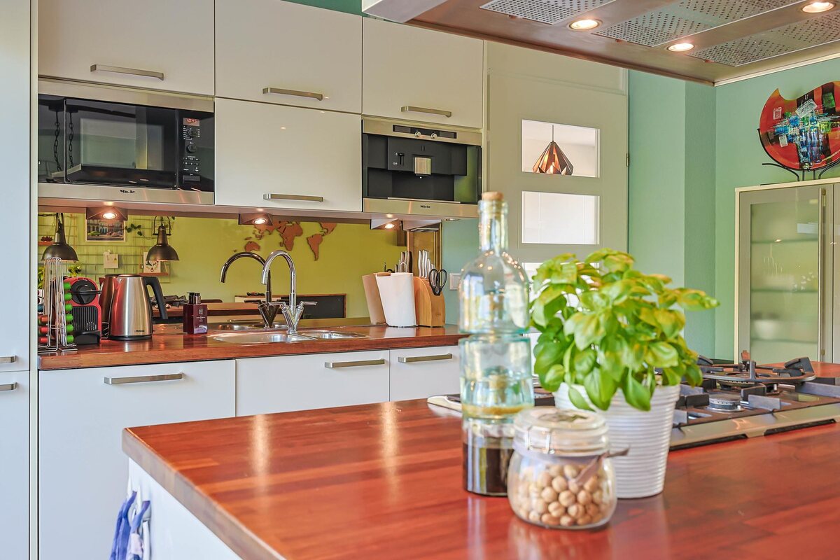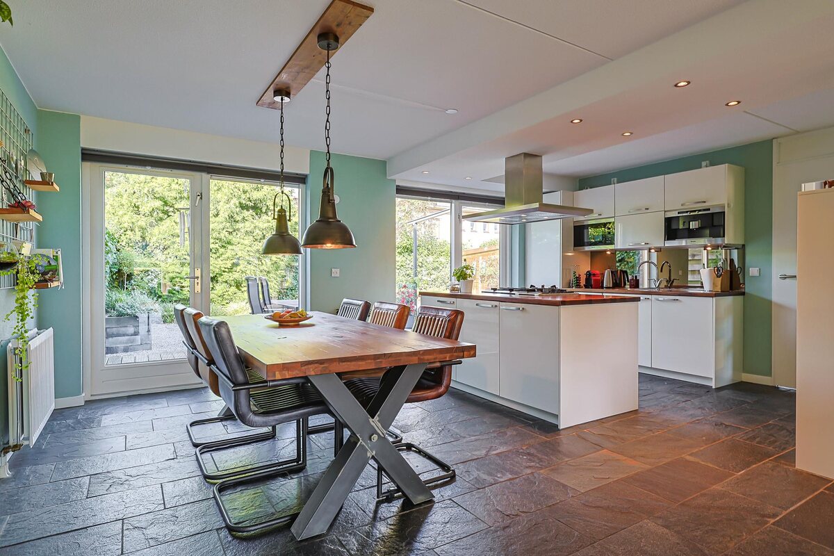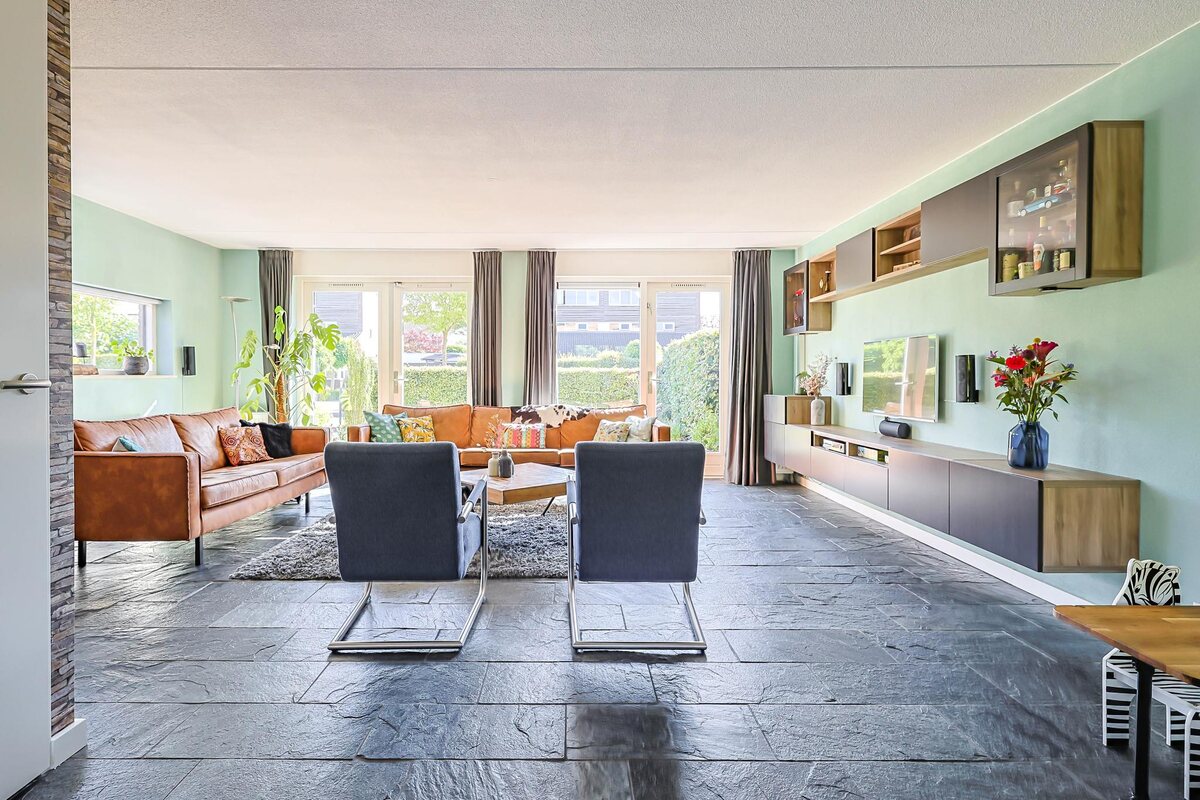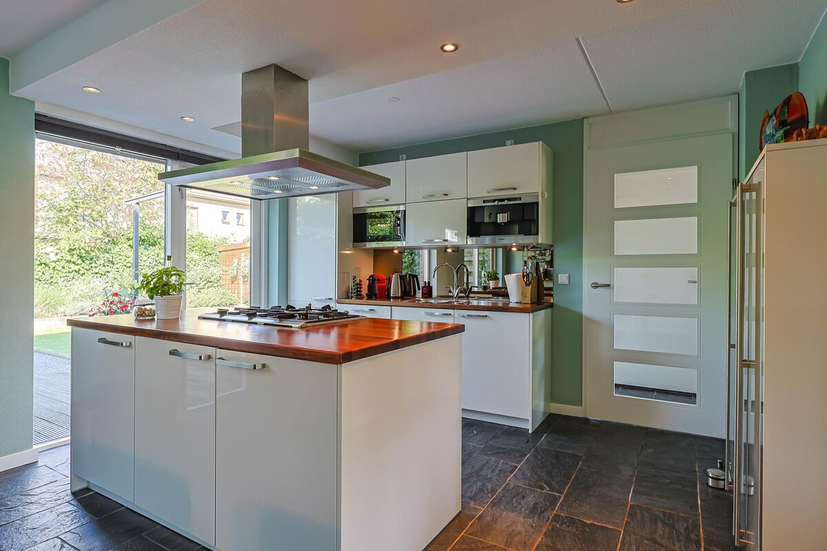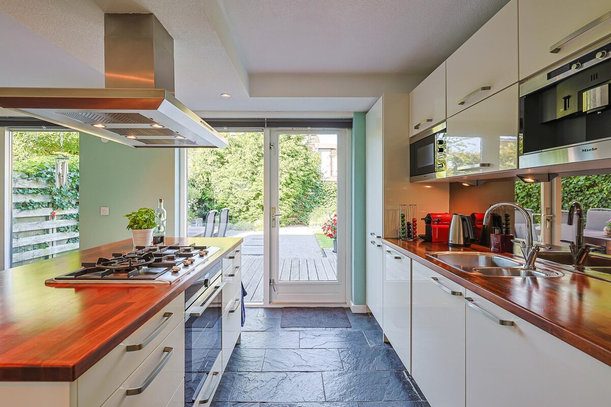 Entree in ruime hal met modern toilet (2018) en toegang tot de woonkamer, bijkeuken, garage en trap naar de verdieping.Royale woonkamer met open keuken (tezamen groot ca. 56m2), voorzien van plavuizenvloer met vloerverwarming. De keuken is voorzien van een kookeiland en separaat wandmeubel, uiteraard met alle gemakken ingebouwd: vaatwasser, koelkast, oven, magnetron, gaskookplaat met afzuigschouw. Aan de voorzijde een loopdeur en openslaande deuren naar de voortuin en aan de achterzijde twee loopdeuren naar de besloten en verzorgde achtertuin.Door de diepe voortuin is een veel gevoel van privacy.