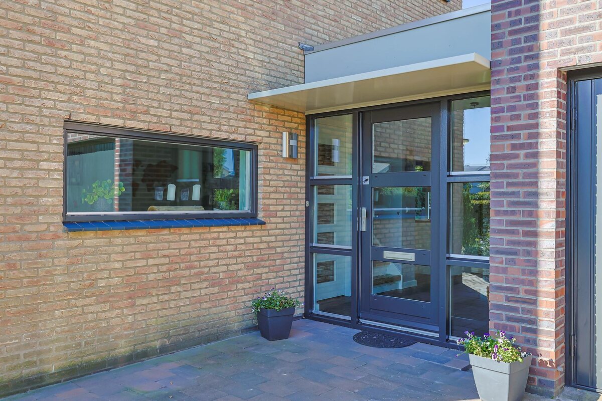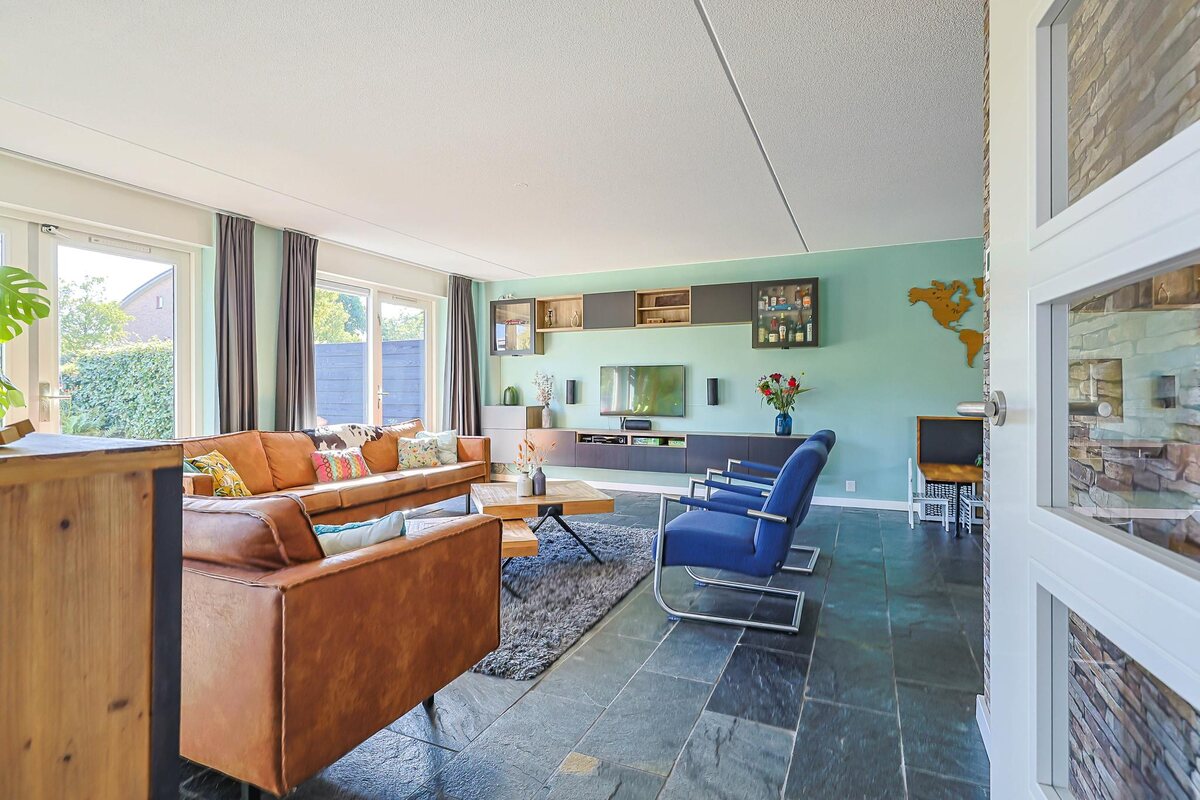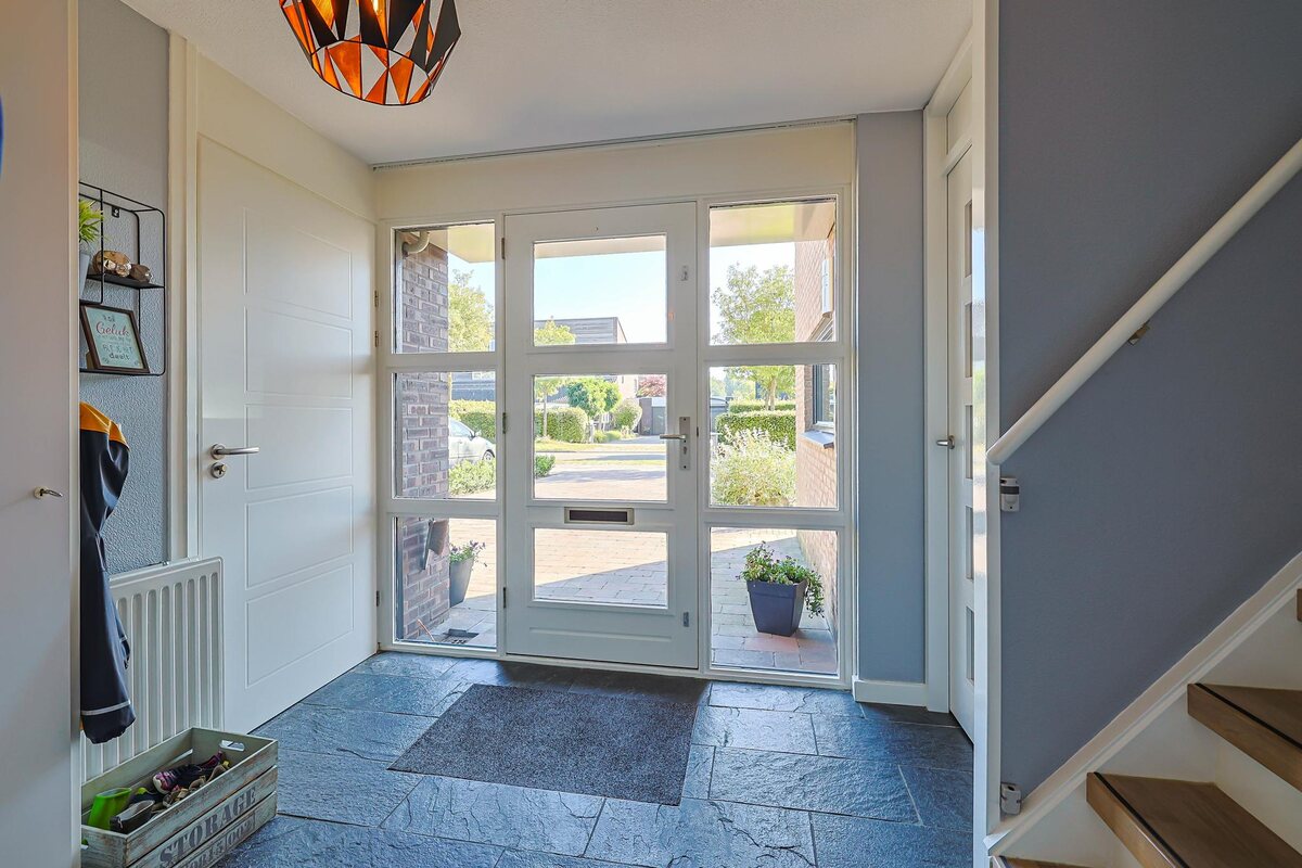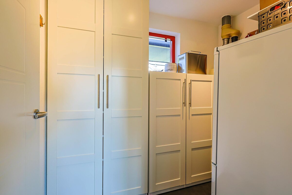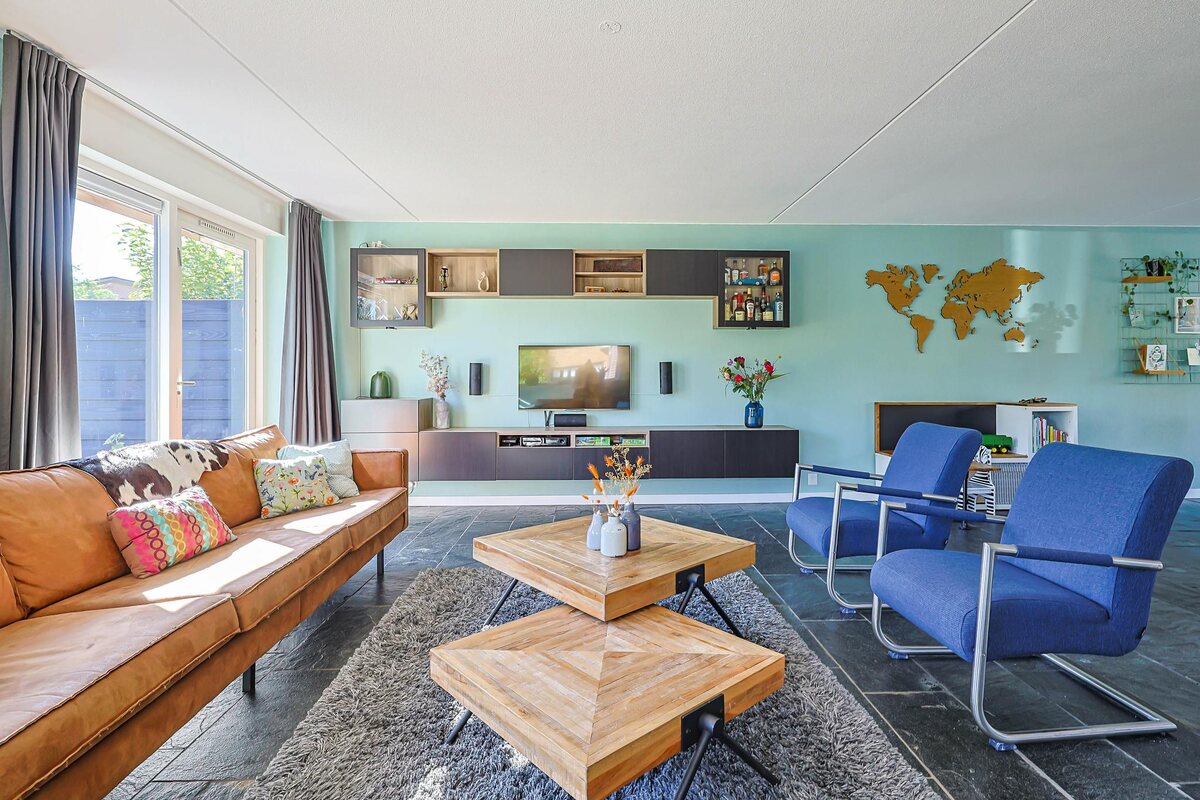 Entree in ruime hal met modern toilet (2018) en toegang tot de woonkamer, bijkeuken, garage en trap naar de verdieping.Royale woonkamer met open keuken (tezamen groot ca. 56m2), voorzien van plavuizenvloer met vloerverwarming. De keuken is voorzien van een kookeiland en separaat wandmeubel, uiteraard met alle gemakken ingebouwd: vaatwasser, koelkast, oven, magnetron, gaskookplaat met afzuigschouw. Aan de voorzijde een loopdeur en openslaande deuren naar de voortuin en aan de achterzijde twee loopdeuren naar de besloten en verzorgde achtertuin.Door de diepe voortuin is een veel gevoel van privacy.