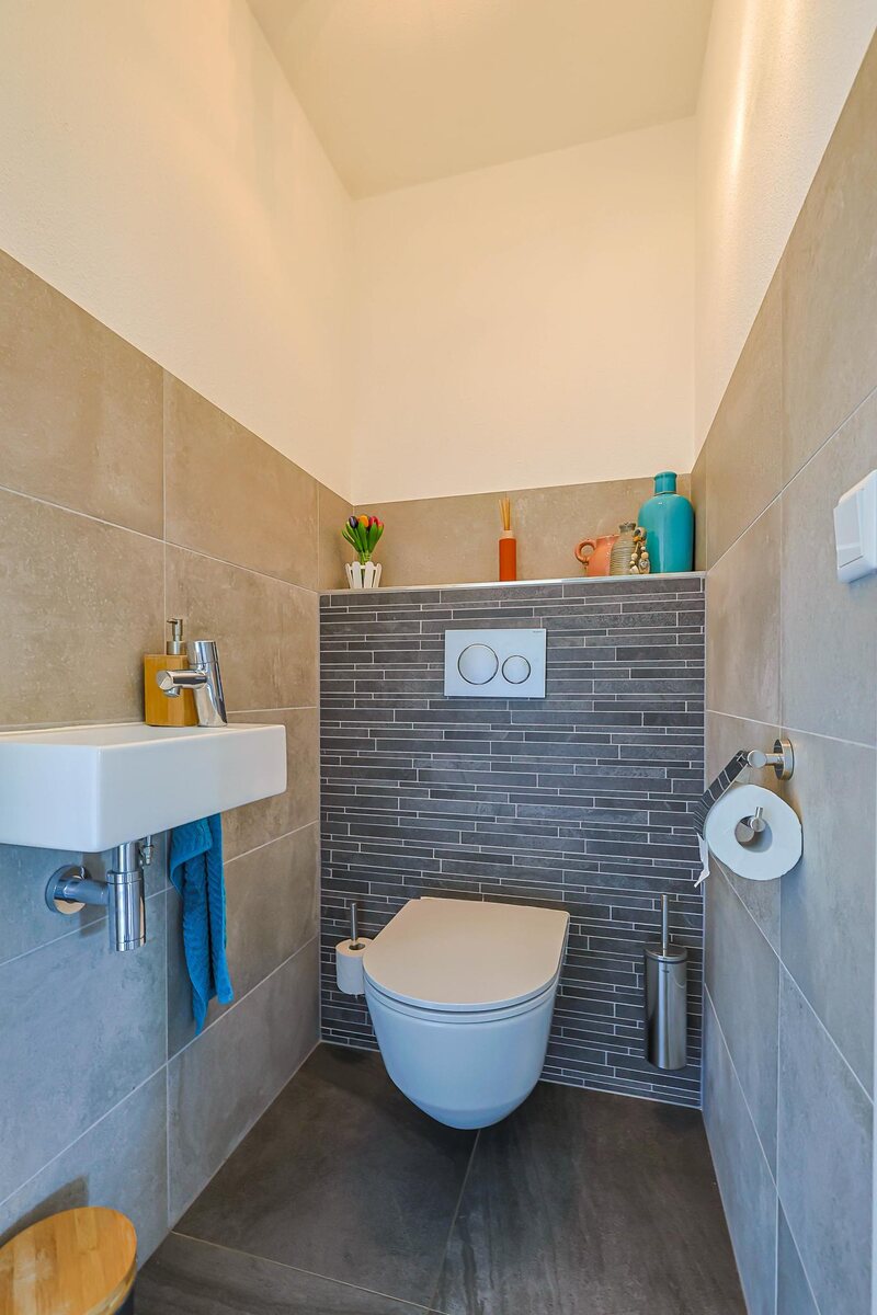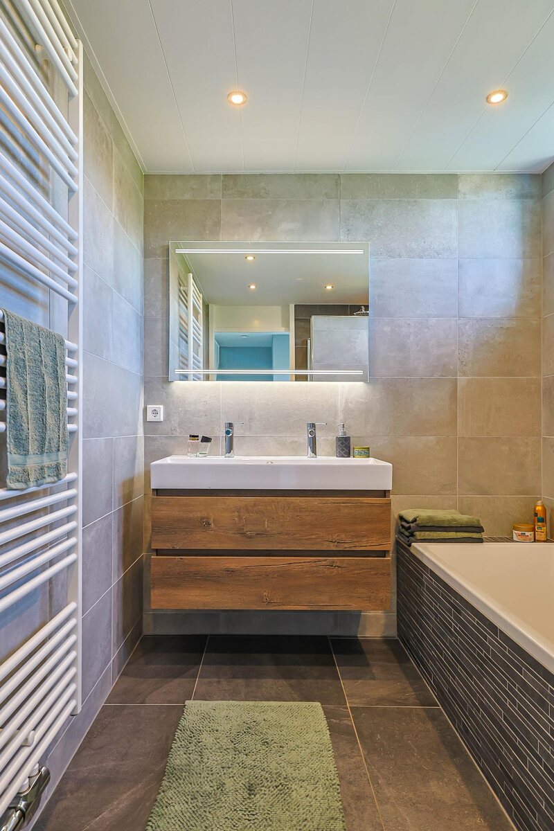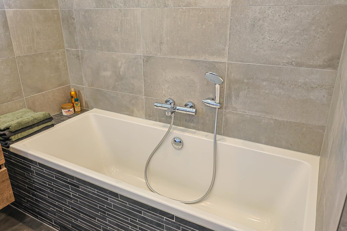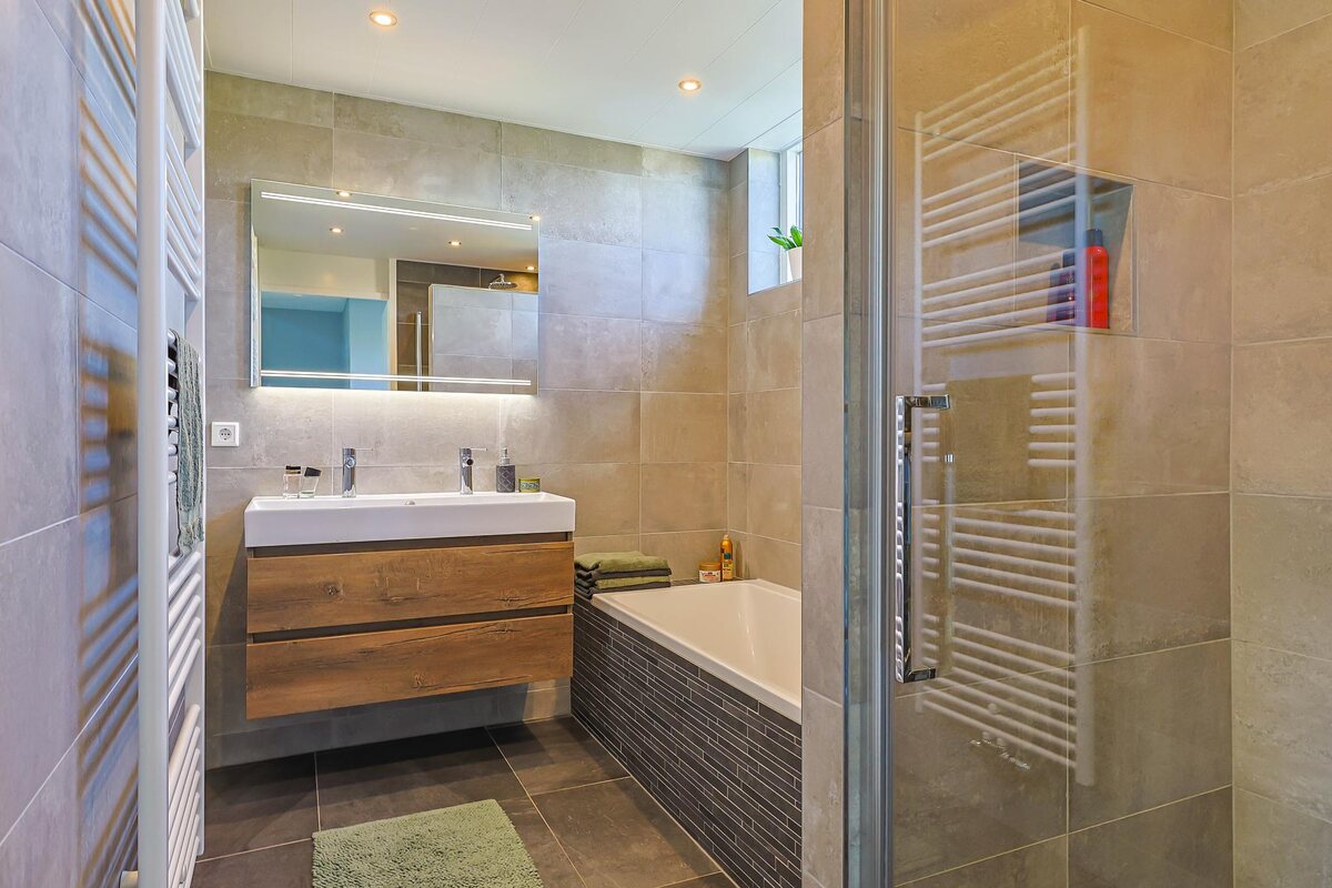 1e verdieping: overloop met modern toilet.Twee ruime slaapkamers van ca. 14 en 11 m2, beide met frans balkon . Moderne badkamer (ca. 6 m2, 2018) voorzien van inloopdouche, ligbad en wastafelmeubel en vloerverwarming.