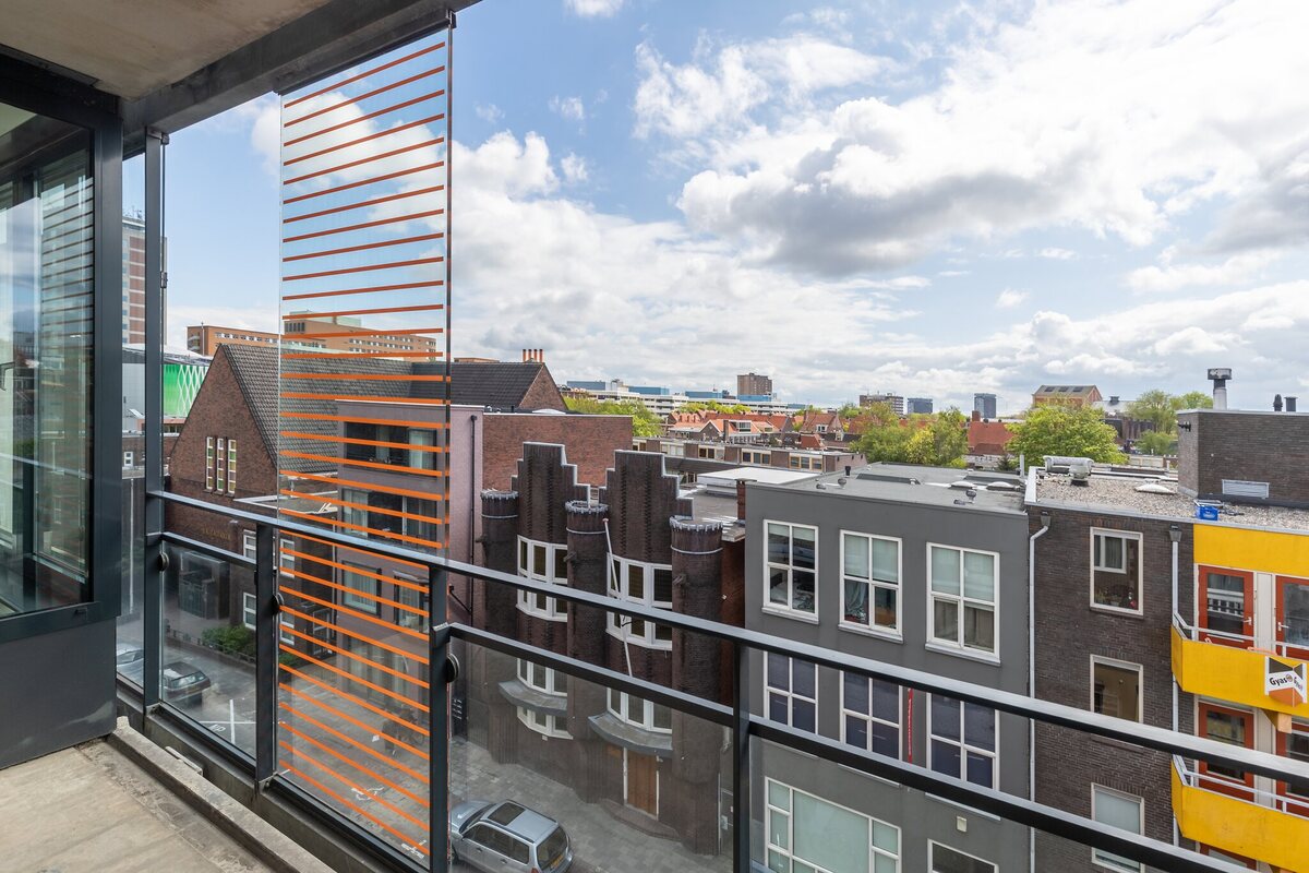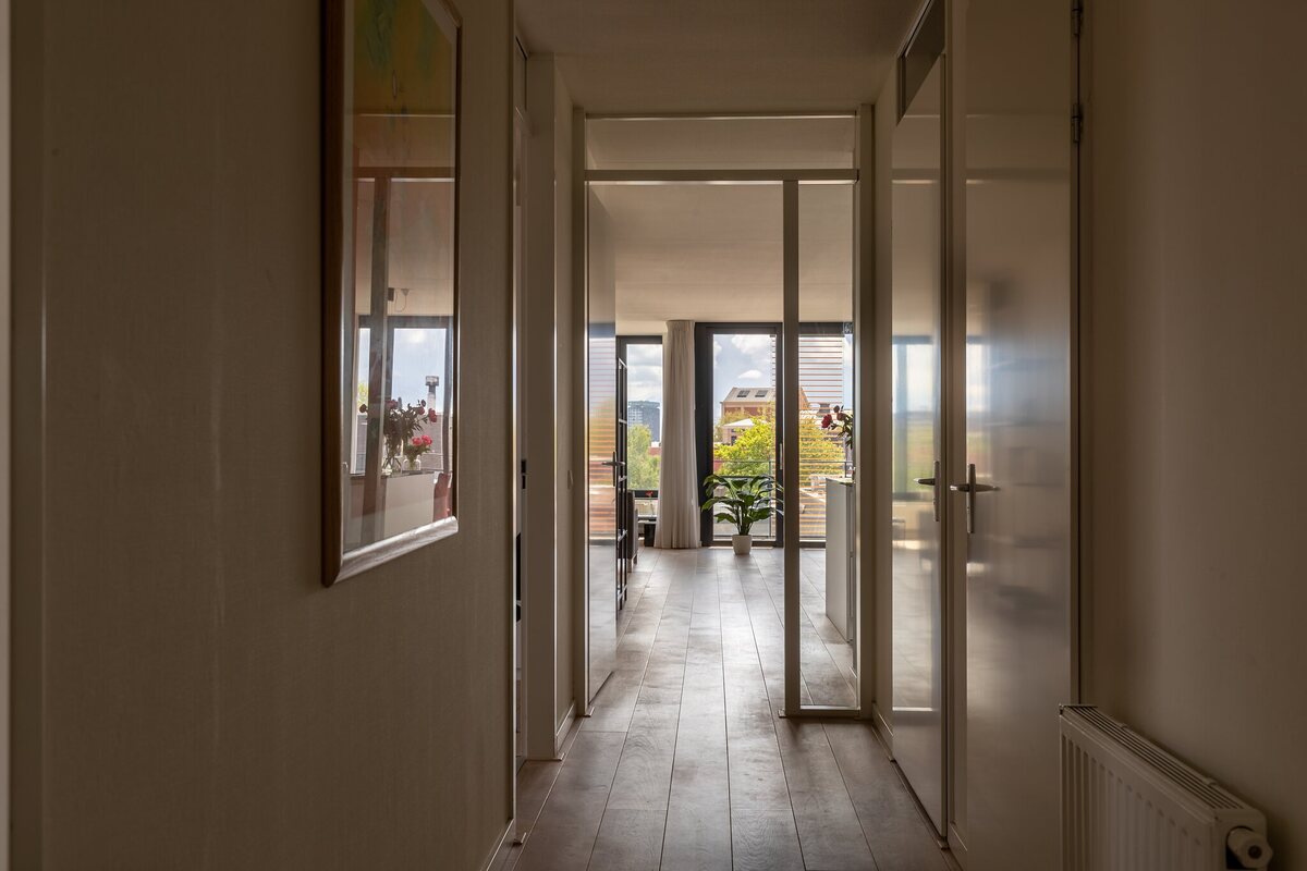 Begane grond: centrale hal, intercom, lift.Appartement: ruime entree met video intercom, hal, handige berging/bijkeuken (5 m2) met wasmachineaansluiting, hangend toilet v.v. fonteintje, drie slaapkamers van 14, 12 en 10 m2. Strakke 'grijze' badkamer waarin een separate douche, ligbad, wastafelmeubel en handdoekradiator. Ruime Z-vormige, lichte woonkamer ca. 54 m2 met open moderne keuken (incl. kookeiland) met inbouwapparatuur. Het zonnige en inpandige balkon is ca. 8 m2. Fraai uitzicht!