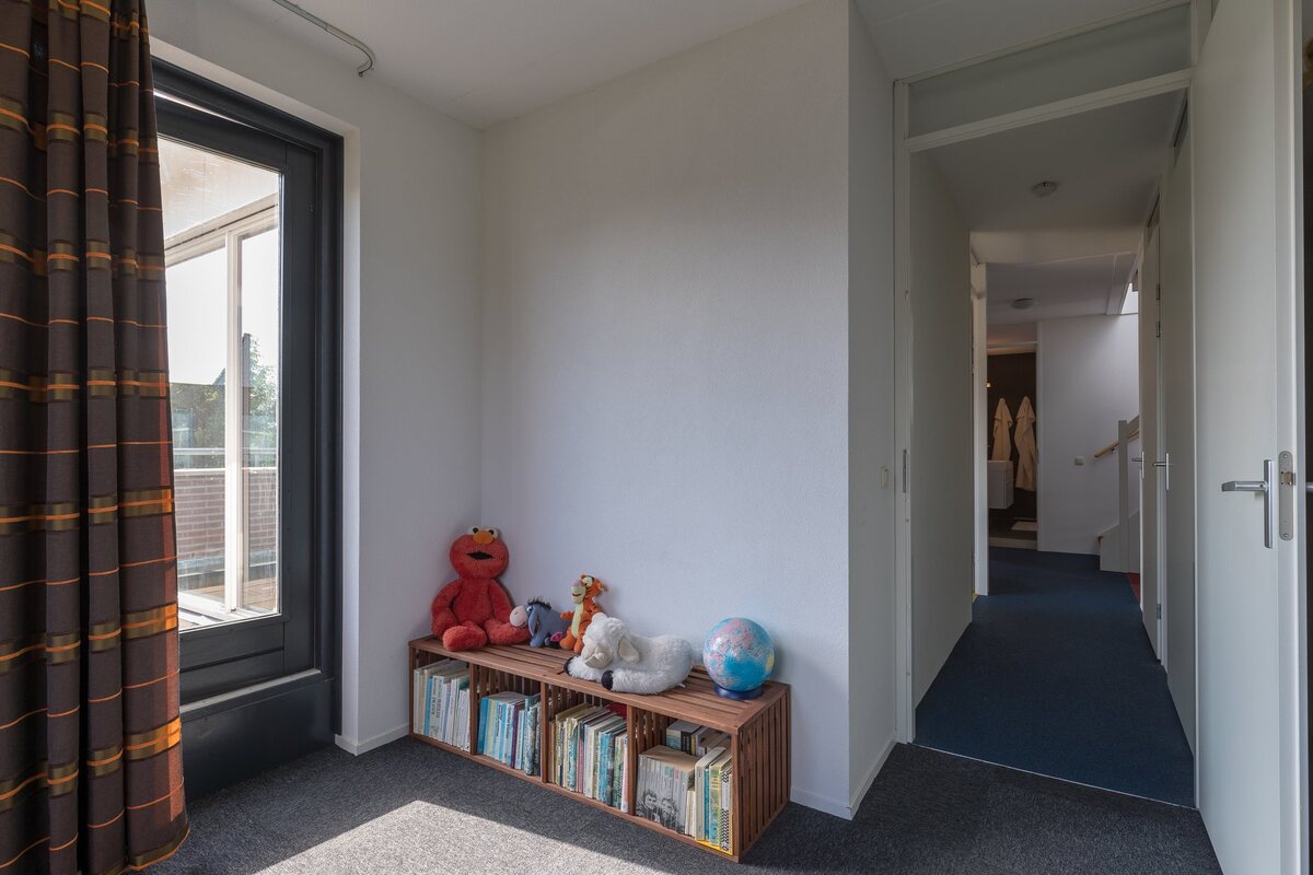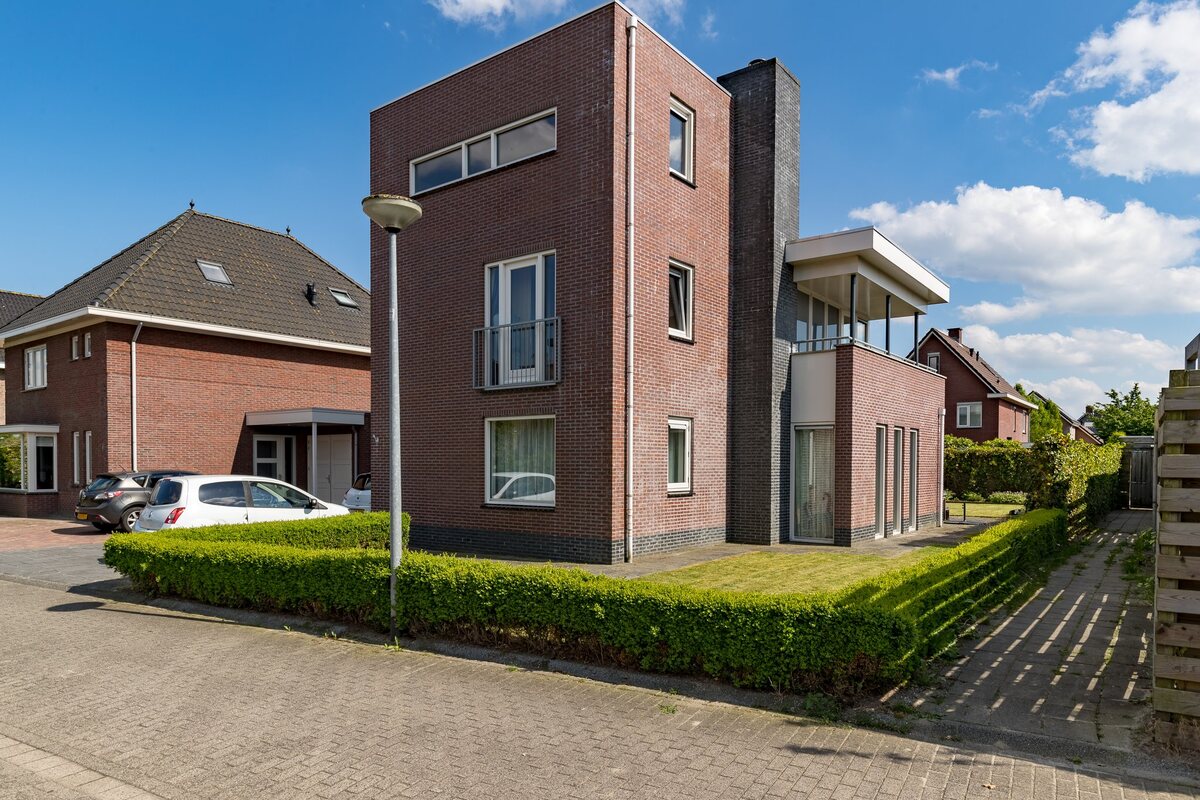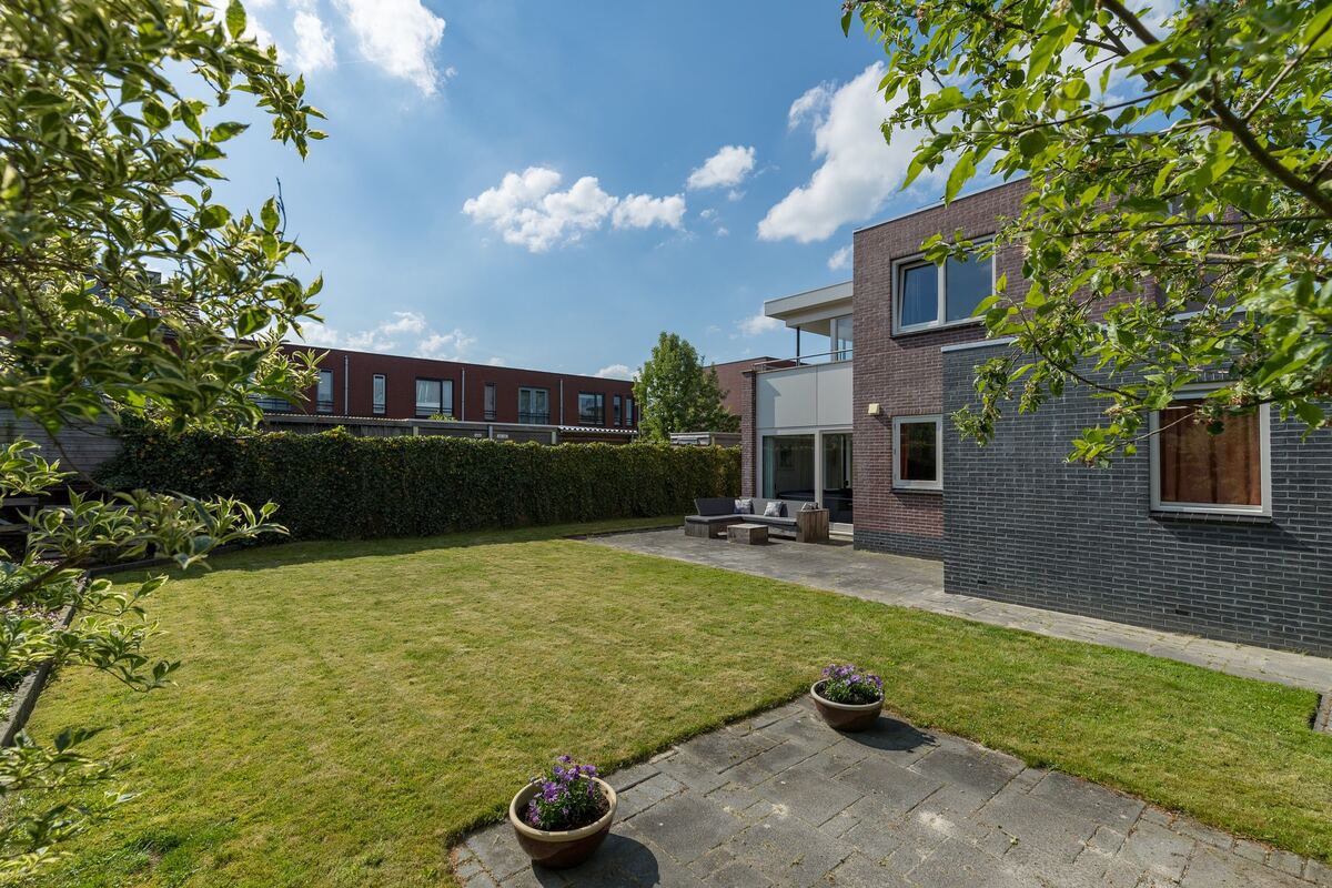 Begane grond: entree, royale hal , trapopgang met trapkast, meterkast, toilet, ruime living (ca. 56 m2) met half open keuken en grote schuifpui. De Gaggenau-keuken is 12 m2 groot, voorzien van de benodigde inbouwapparatuur en een granieten werkblad. De woonkamer van 44 m2 is bijzonder licht en speels ingedeeld. Vanuit de woonkamer is een handige speel-, werk- of slaapkamer gesitueerd. Verder een forse bijkeuken met toegang tot de geïsoleerde garage (17 m2).Eerste verdieping: overloop, kast, apart toilet, 3 ruime slaapkamers (18, 14 en 13 m2), waarvan 2 met inloopkast en deur naar zonnig balkon, keurige badkamer (8 m2) voorzien van een douchecabine, tweede toilet, dubbele wastafel en designradiator. Tweede verdieping: via een vaste trap te bereiken overloop, flinke 5e slaapkamer (ca. 24 m2) met ruime kledingkast en met deur naar royaal dakterras van 14 m2.