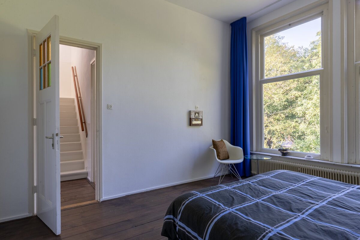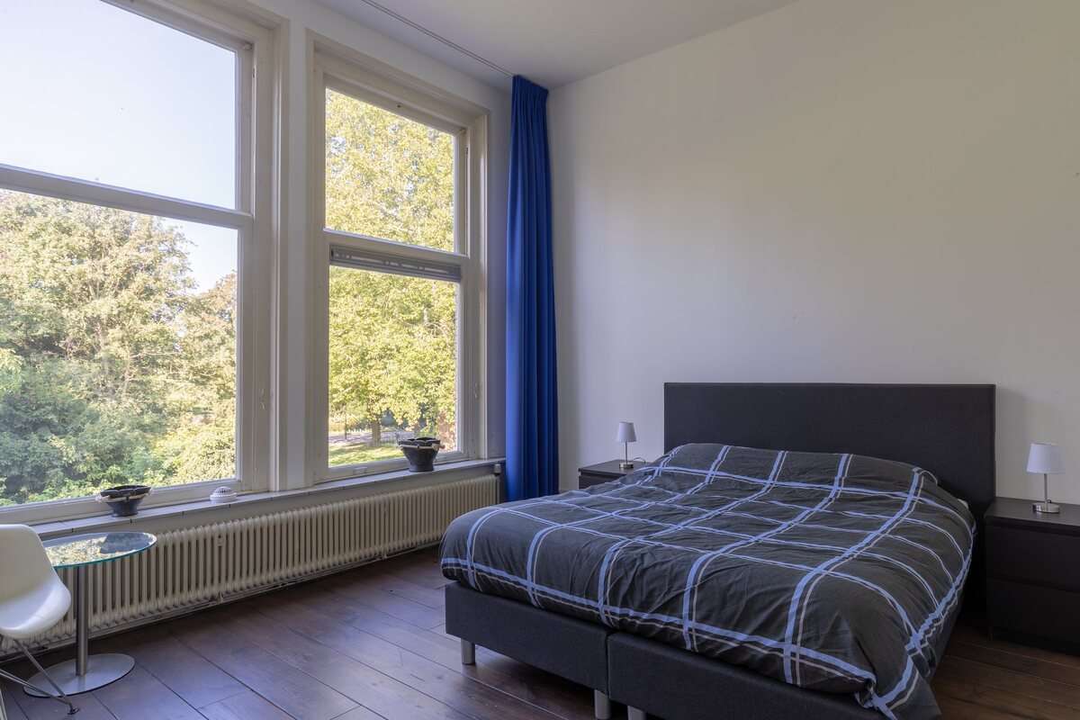 Leuke hal/entree met toegang tot de woonkamer, toilet en trapopgang.Heerlijke doorzon woonkamer (ca. 40 m2) met open keuken (ca. 13 m2). Beide met fraaie houten vloer, hoog plafond en een onovertroffen uitzicht op het plantsoen. De keuken (2005) is volledig op maat gebouwd en voorzien van een kookeiland met wandmeubel en inbouwapparatuur. Openslaande deuren naar de tuin en toegang tot een ruime kelder (eveneens opstelplaats van de nieuwe CV ketel).Verdieping: overloop met toilet.Slaapkamer 1 voorzijde (ca. 18 m2), hoog plafond, houten vloer, prachtig uitzicht.Slaapkamer 2 voorzijde (ca. 12 m2), hoog plafond, houten vloer, prachtig uitzicht.Slaapkamer 3 achterzijde (ca. 17 m2), hoog plafond, houten vloer.Ruime badkamer (2005 - ca. 13 m2) met dubbele wastafel, inloopdouche en een hoekbad (bubbels).Tweede verdieping: overloopje.Royale slaapkamer voorzijde (ca. 24 m2) voorzien van dakkapel, vaste kasten en een dakkoepel.Slaapkamer 5 achterzijde (ca. 10 m2), eenvoudig ingericht en aangekleed.Waskamer (ca. 8 m2) met dakraam, pantry en CV ketel (verwarmd alleen de tweede verdieping). Vlizoluik naar de zolder.Kleine eenvoudige badkamer (ca. 3 m2) met vaste wastafel, derde toilet en douche.