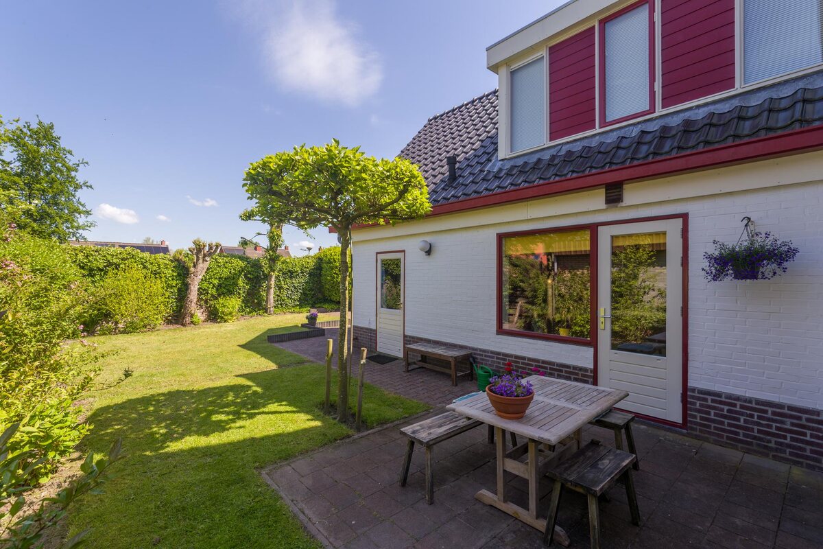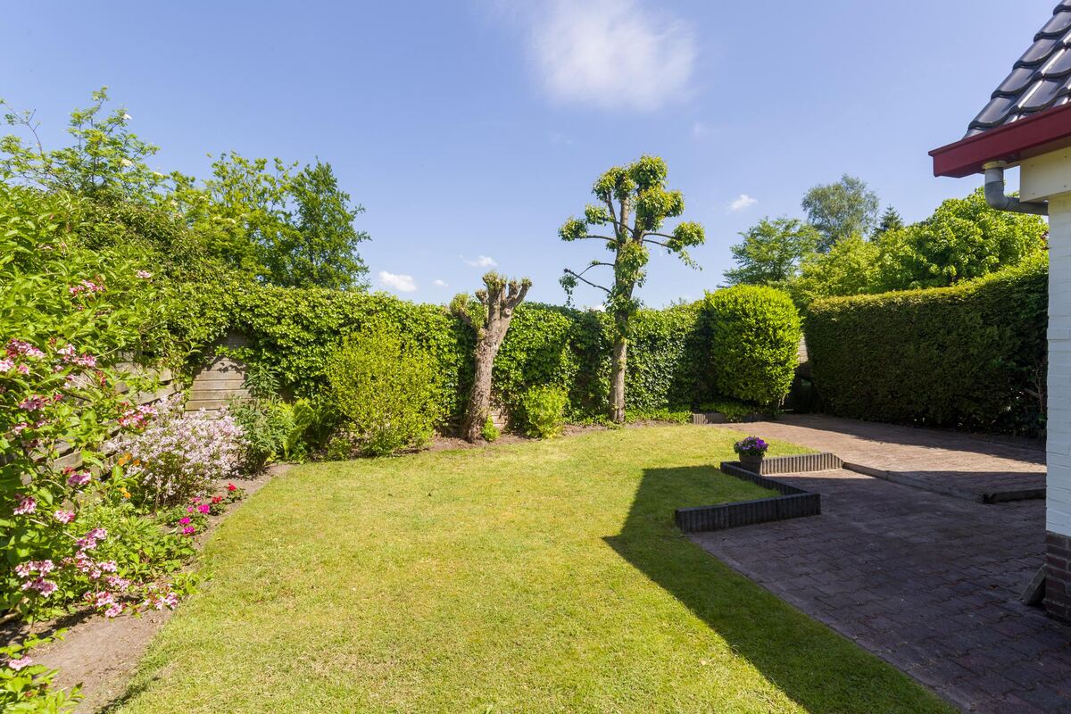 Voor-, zij- en achtertuin, keurig aangelegd met gazon, borders en terras.