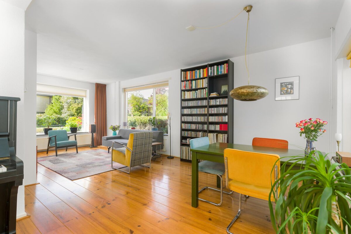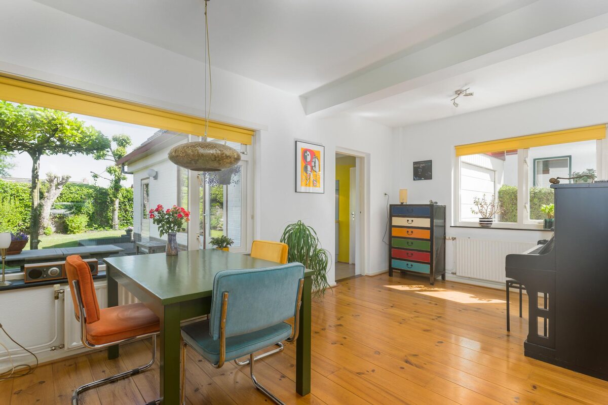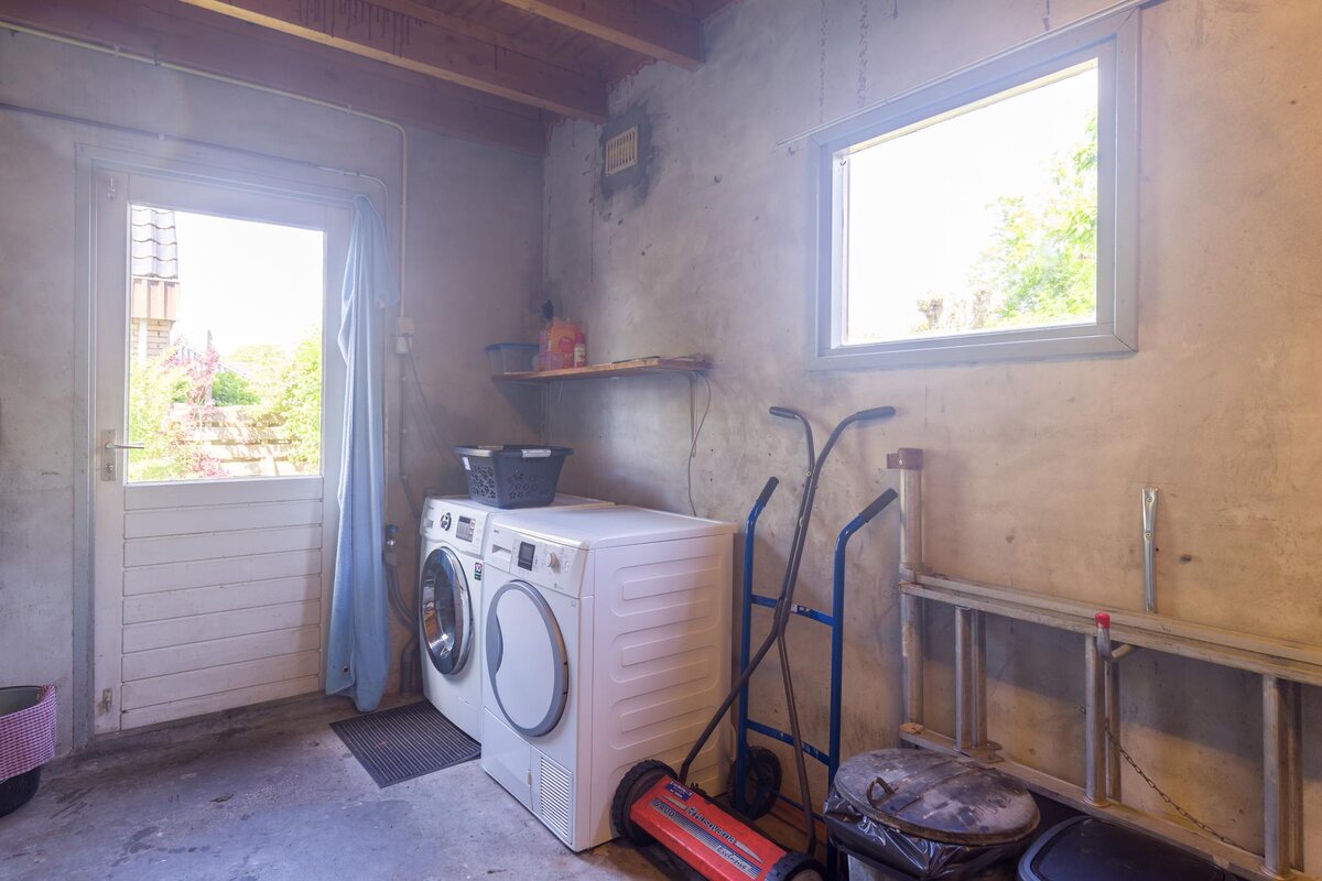 Begane grond: Entree, hal met toilet, kelderkast, trapopgang en doorloop naar de woonkamer. L-vormige woonkamer (ca. 33 m2) met aan alle zijden zicht op de tuin een leuke hoek voor een piano of werkplek, op de vloer ligt een mooie houten vloer. Leuke woonkeuken (ca. 12 m2) in hoekopstelling v.v. inbouwapparatuur (gaskookplaat, afzuigkap, oven, magnetron, vaatwasser, koelkast en vrieskast). De keuken is al wat ouder, maar keurig netjes. Loopdeur naar de tuin en doorloop naar de garage. De garage is thans opgedeeld in twee delen; de voorzijde (ca. 15 m2) met close-in boiler (voor de keuken) en een automatische kanteldeur, achterzijde (via binnendoor) een berging (ca. 15 m2) met opstelplaats voor wasmachine en loopdeur naar de tuin.