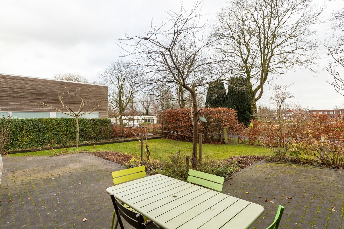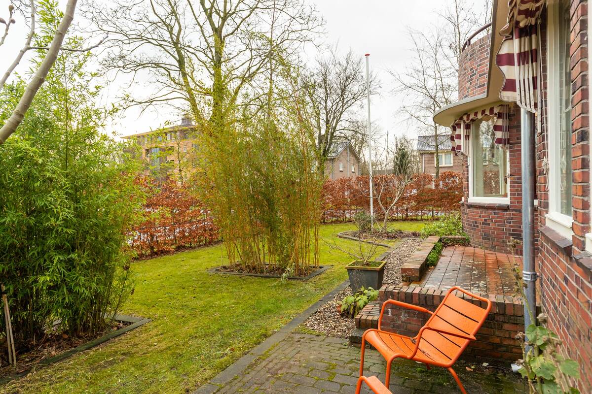 Prachtige tuin met borders, bomen, terrassen, een broeikas en een achterom. Vanuit de tuin en het balkon zicht op het voorgelegen plantsoen.