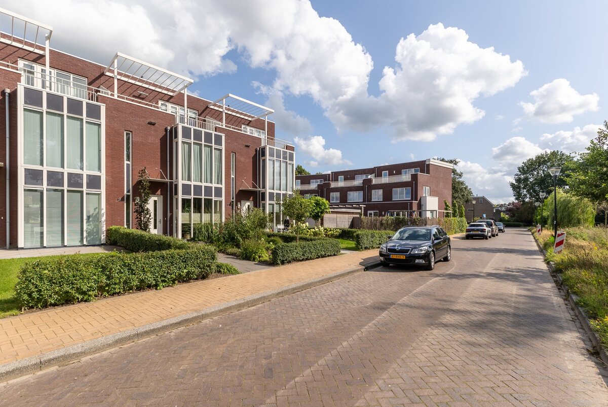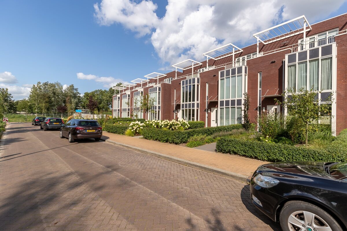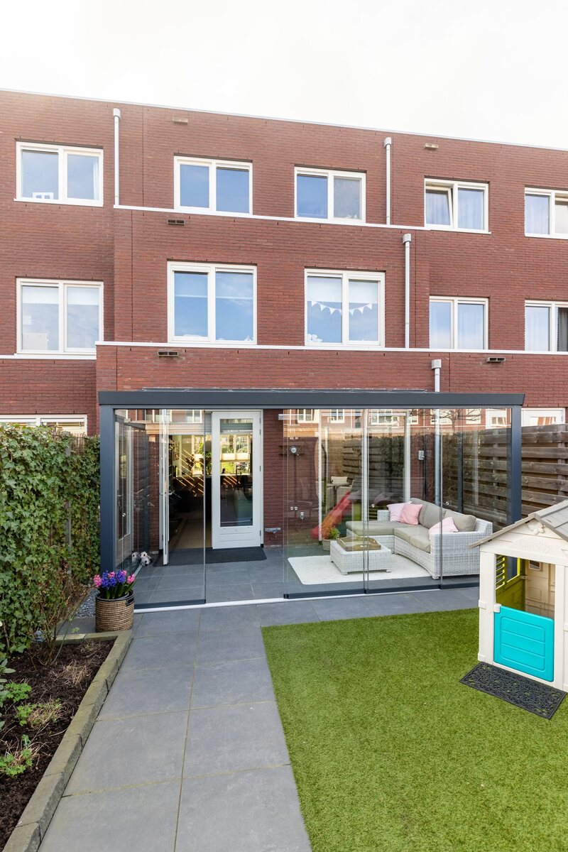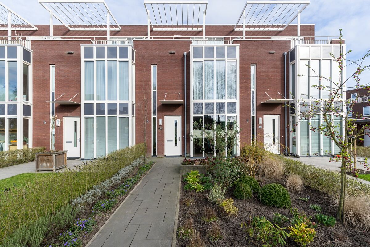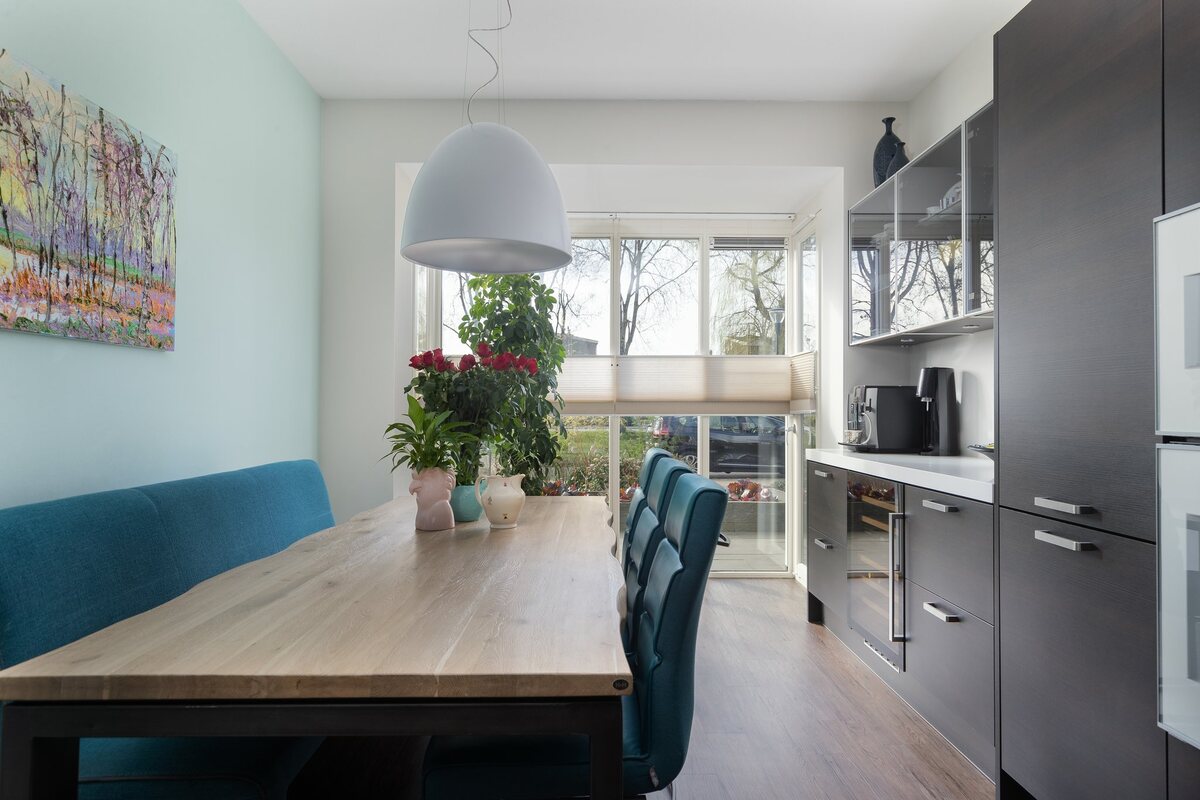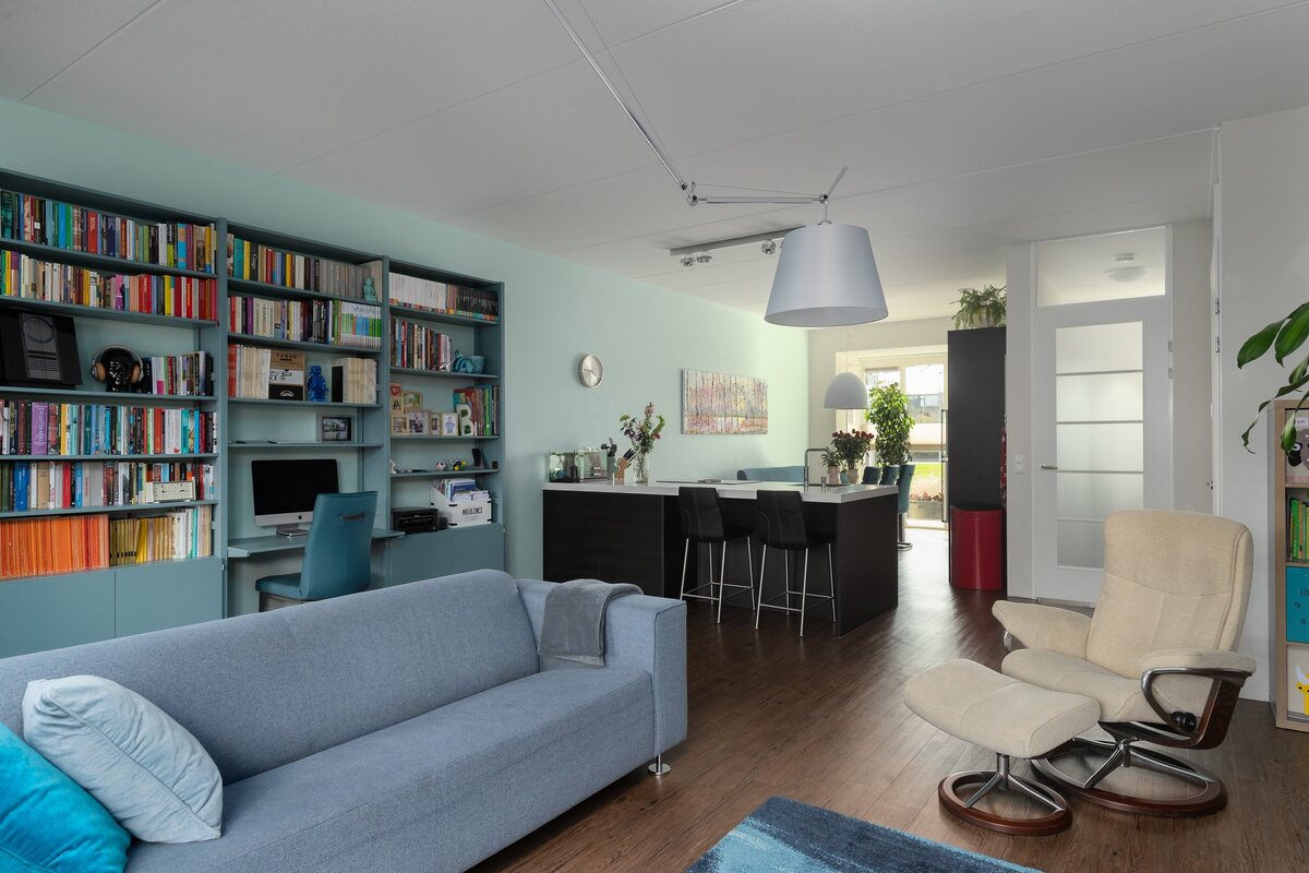Begane grond: Entree met hal, trapopgang en toilet. Royale living van ca. 54 m² met pvc vloer en openslaande deuren naar de serre en achtertuin. De luxe keuken is deels als schiereiland met bar centraal in de living geplaatst (v.v. inductie kookplaat, spoelbak en vriezer) en een deel aan de wand aan de voorzijde (v.v. koelkast, vaatwasser, stoomoven, oven en wijnkoelkast). Een ruime trapkast biedt voldoende opbergmogelijkheden. Aan de voorzijde geeft de glazen erker veel licht en een prachtig vrij uitzicht.