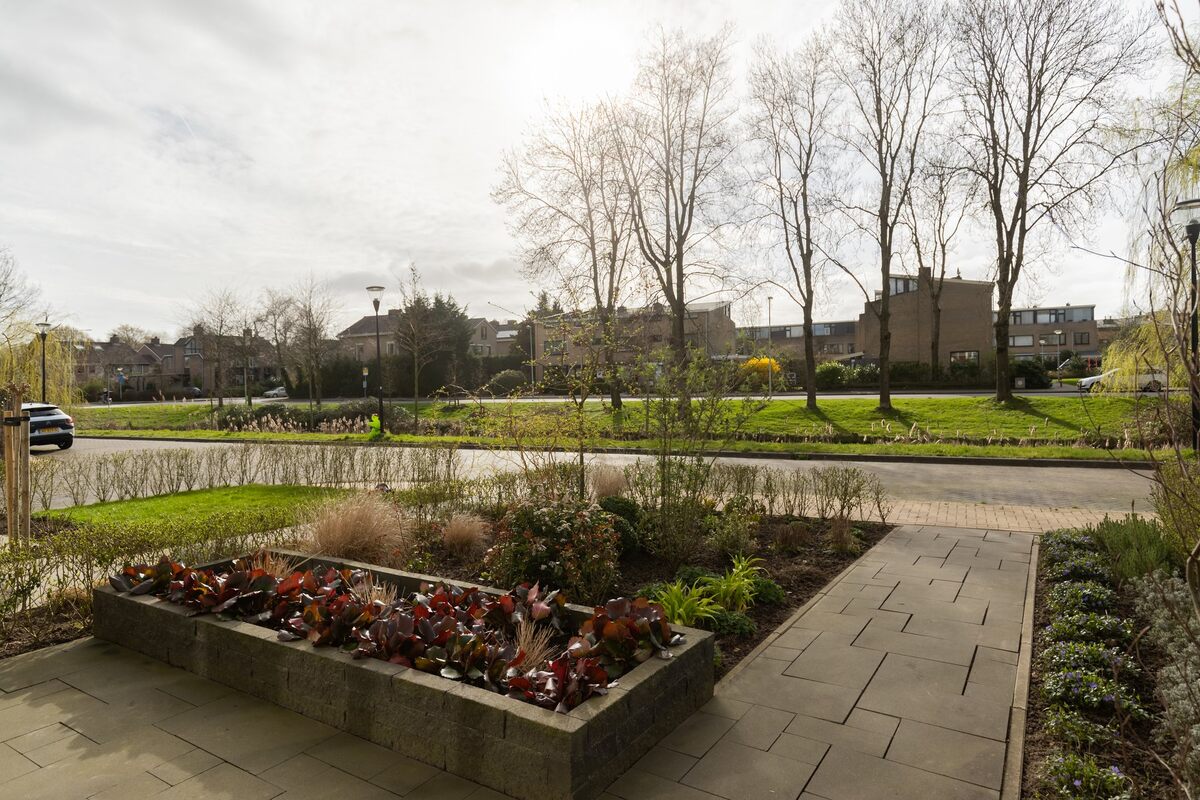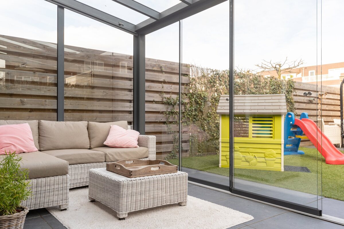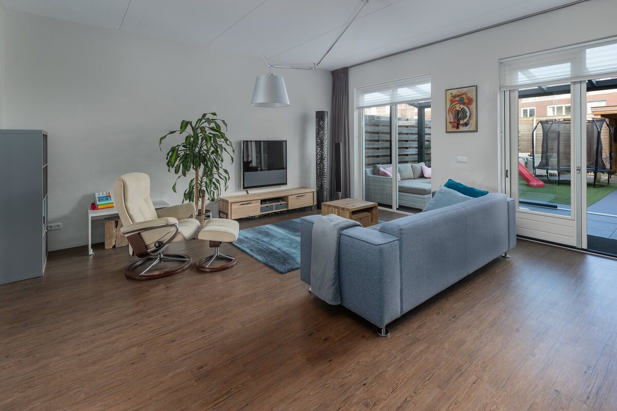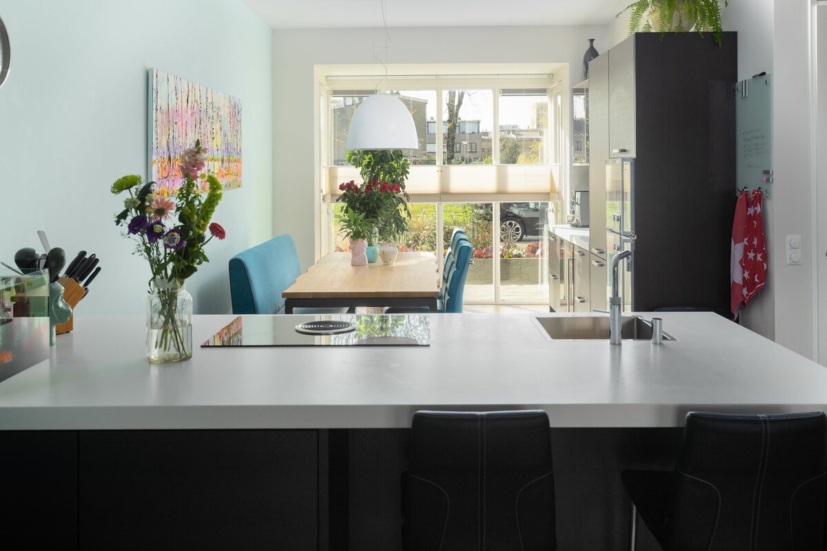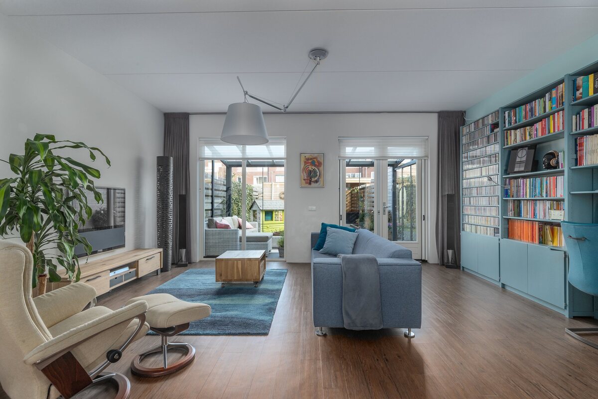 Begane grond: Entree met hal, trapopgang en toilet. Royale living van ca. 54 m² met pvc vloer en openslaande deuren naar de serre en achtertuin. De luxe keuken is deels als schiereiland met bar centraal in de living geplaatst (v.v. inductie kookplaat, spoelbak en vriezer) en een deel aan de wand aan de voorzijde (v.v. koelkast, vaatwasser, stoomoven, oven en wijnkoelkast). Een ruime trapkast biedt voldoende opbergmogelijkheden. Aan de voorzijde geeft de glazen erker veel licht en een prachtig vrij uitzicht.