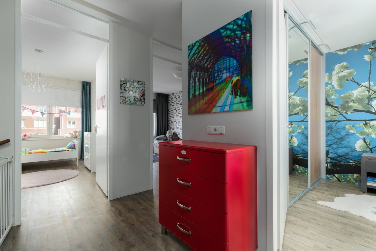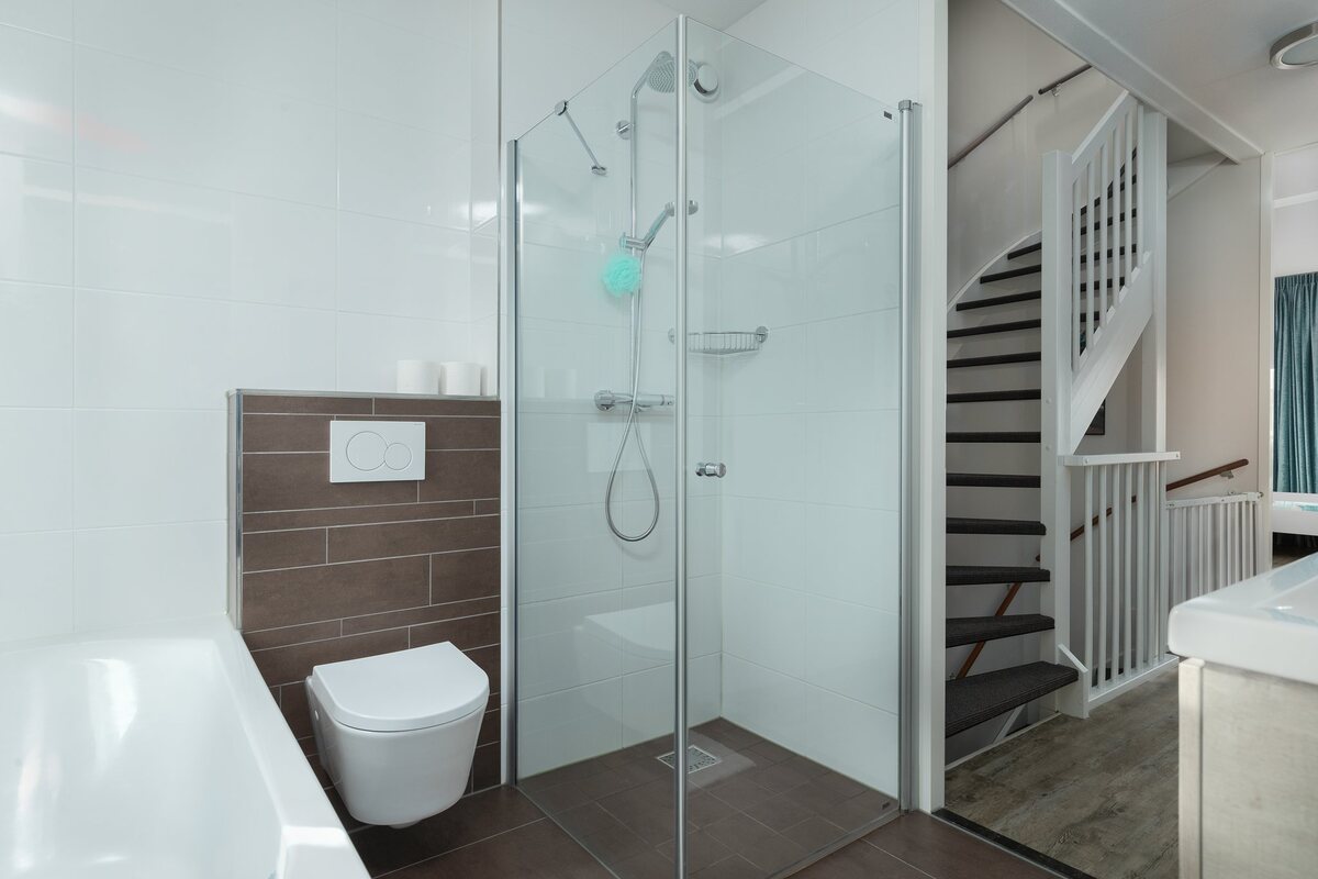 Overloop. twee slaapkamers van ca. 10 en 12 m². waarvan één met toegang tot het dakterras van ca. 12 m² op het westen. Tweede badkamer met wastafel, douche en toilet. Berging met CV- en wasmachine opstelling.