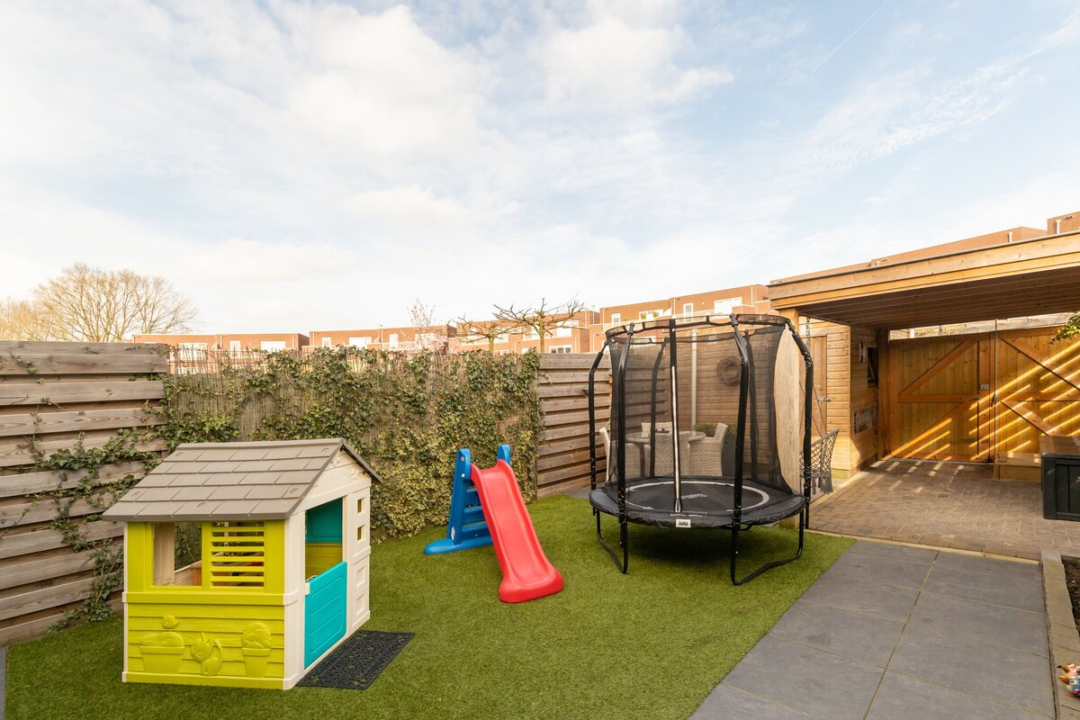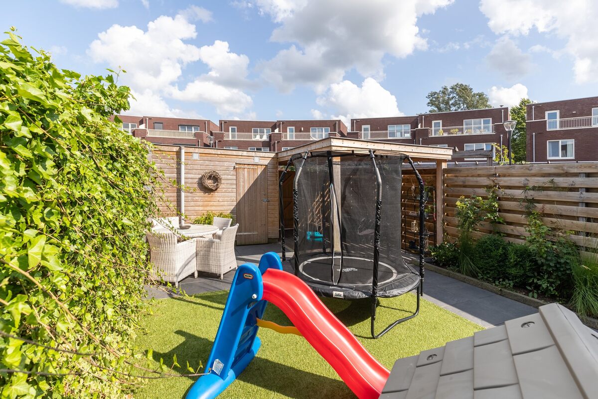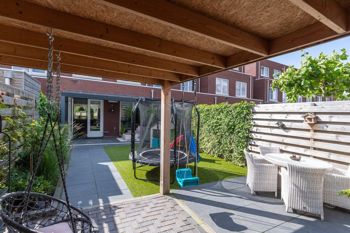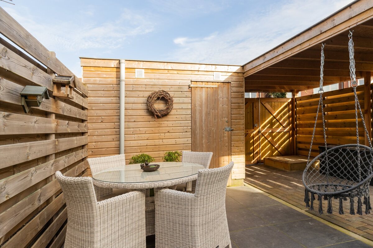 Achtertuin op het oosten gelegen met goede achterom, parkeren op eigen grond. Houten berging van ca. 3x5 meter met openslaande deuren voor eventueel een auto of motor.