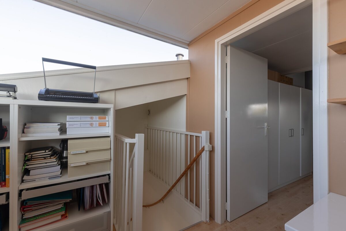 Begane grond: entree met toegang tot de hal en tot de bijkeuken. Hal, toilet en trapopgang en dan de fraaie riante woonkamer (54 m2) met aan de voorzijde een moderne open woonkeuken met keukeneiland (2013) en een tuingerichte woonkamer. Voorzien van een houten vloer. De bijkeuken is ruim (9 m2) en deze geeft wer toegang tot de berging (10 m2, wederom een mooi formaat).Eerste verdieping: overloop, drie ruime slaapkamers van respectievelijk ca. 11, 11 en 12 m2 en een prachtige badkamer (2016) met een ligbad, separate douche, 2e toilet en dubbel wastafelmeubel. Tweede verdieping: via vaste trap te bereiken. Een ruime werkplek (9 m2) en een vierde slaapkamer (14 m2), berging met opstelling voor wasmachine en c.v. ketel, tevens bergruimte.