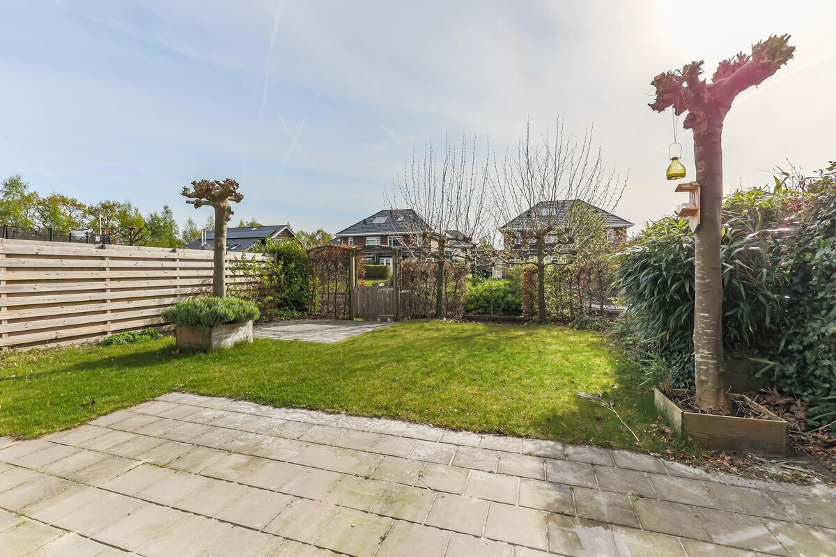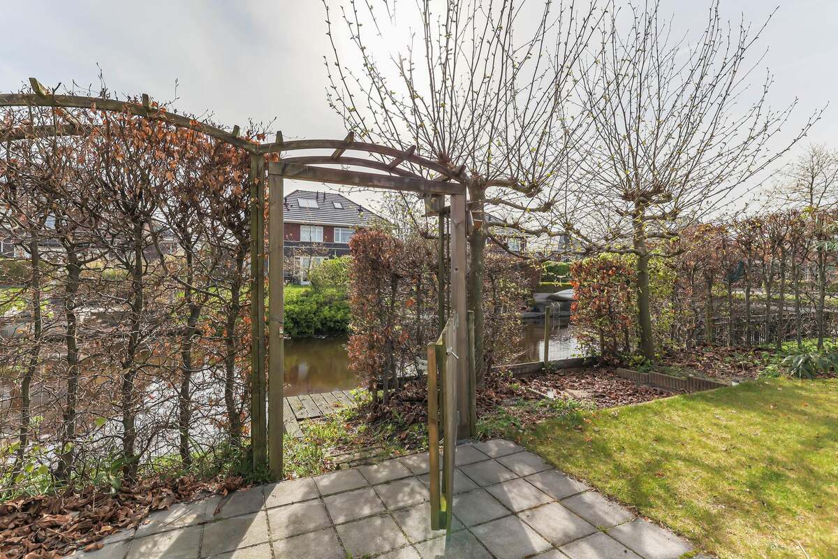Voortuin met oprit. De ruim bemeten achtertuin (ca. 220 m2) is op het oosten gelegen en sluit direct aan op het vaarwater. De tuin heeft een ruim terras direct achter de woning en aan het water een goede aanlegplaats voor de eigen boot en een tweede terrasje. Perceeloppervlakte ca. 410 m2.