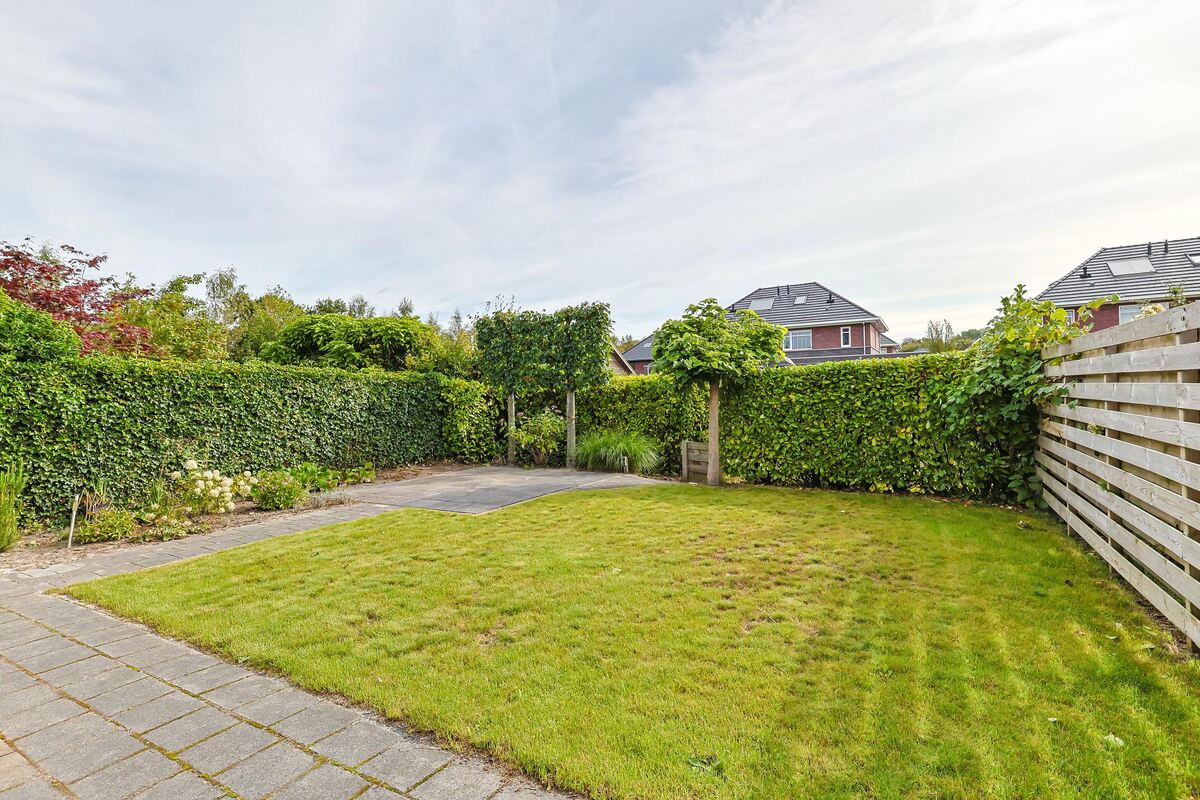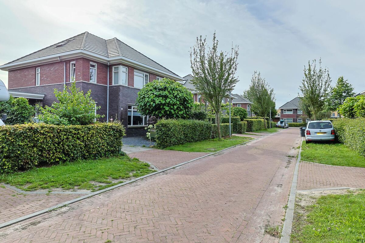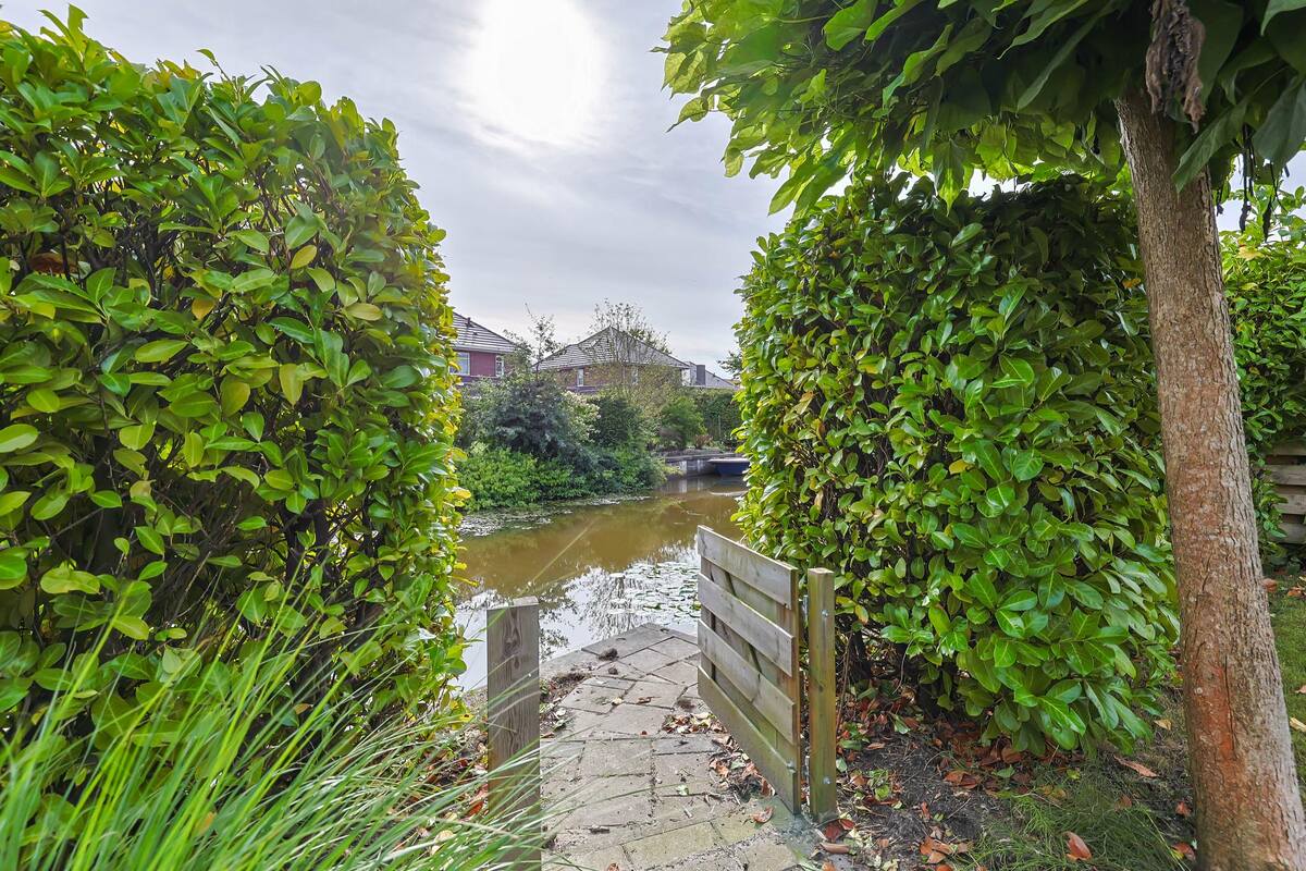 Voortuin met oprit. De ruim bemeten achtertuin (ca. 220 m2) is op het oosten gelegen en sluit direct aan op het vaarwater. De tuin heeft een ruim terras direct achter de woning en aan het water een goede aanlegplaats voor de eigen boot en een tweede terrasje. Perceeloppervlakte ca. 410 m2.