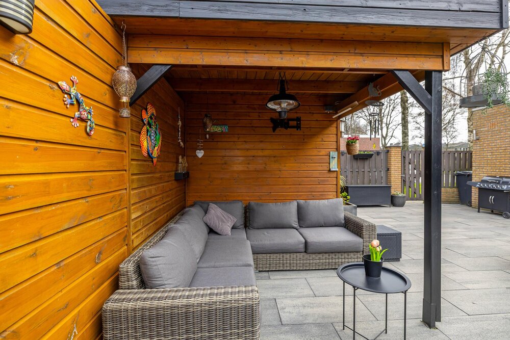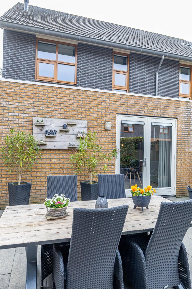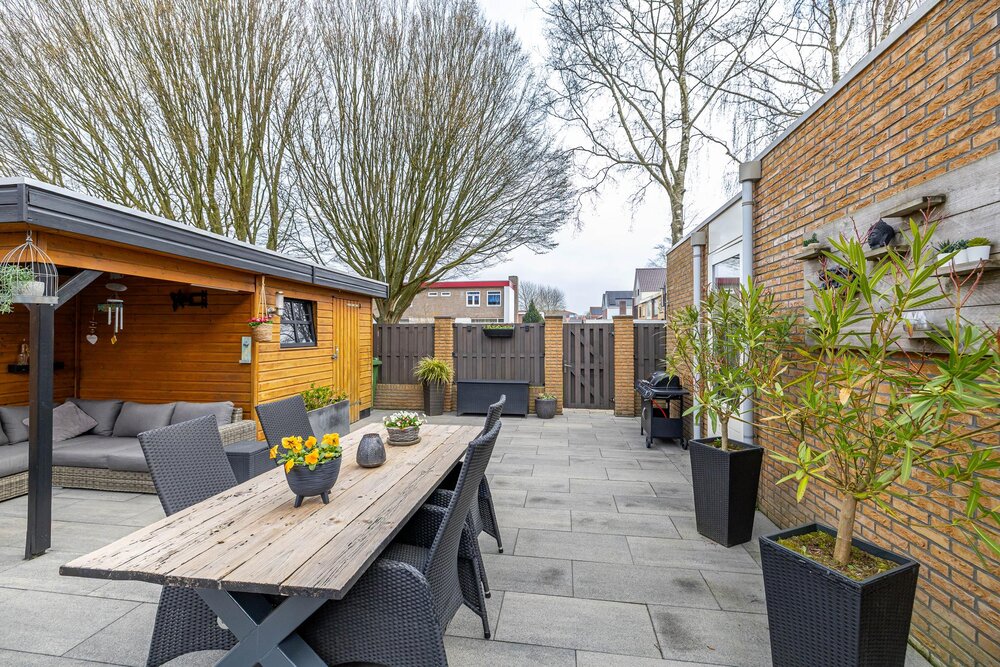 Het woonhuis heeft een voortuin, een royale oprit en een geheel omsloten achtertuin. De achtertuin is onderhoudsarm aangelegd en is bereikbaar langs de buitenzijde van het huis en heeft ook een achterom. De tuin ligt op het noordwesten (middag-avondzon). Verder een berging (7 m2) in de tuin met een fijne overkapping. Perceeloppervlakte is met 269 m2 lekker royaal te noemen.