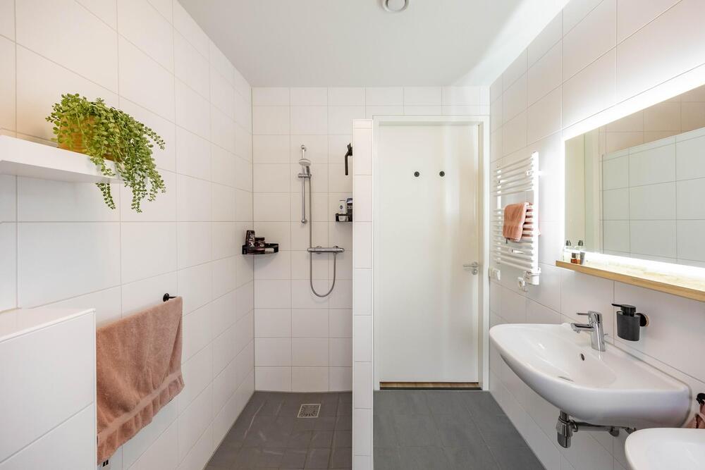Eerste verdieping: overloop, 3 slaapkamers (16, 11 en 7 m2). Tevens de frisse en neutrale badkamer met ligbad, douche, dubbele wastafel, tweede toilet en vloerverwarming.