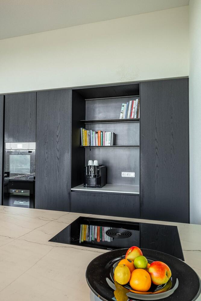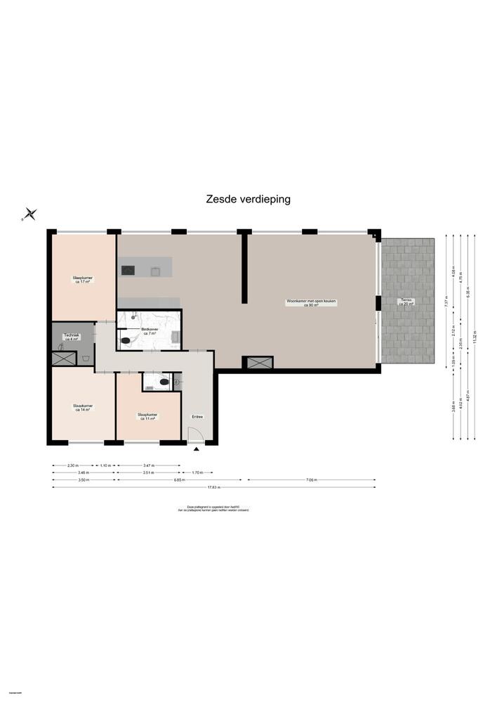 Entree/hal, meterkast en toilet. De living (90 m2!) met fraai uitzicht is voorzien van een woonkeuken met schiereiland. De Italiaanse designkeuken is luxe en van alle gemakken voorzien. Vanuit het zitgedeelte is via een schuifpui het terras van 20 m2 te bereiken. Heerlijk in de zon van verre uitzichten genieten. Verder 3 slaapkamers (17, 14 en 11 m2) en een chique badkamer van 7 m2.