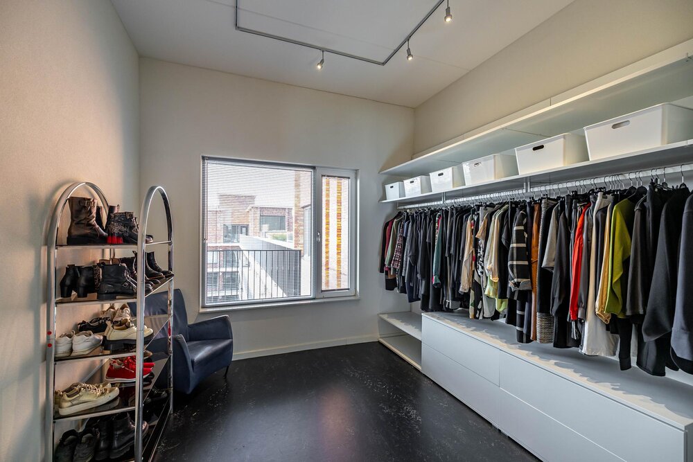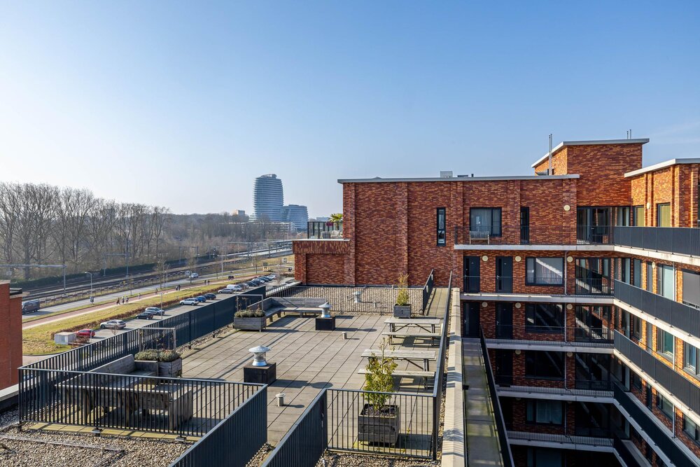 Dit bijzondere appartement beschikt over twee parkeerplaatsen in eigendom in de parkeerkelder, een eigen grote berging, er is een gezamenlijke fietsenberging en een gezamenlijk dakterras.