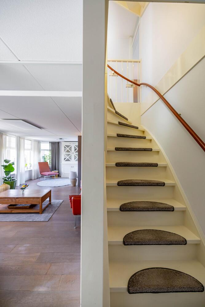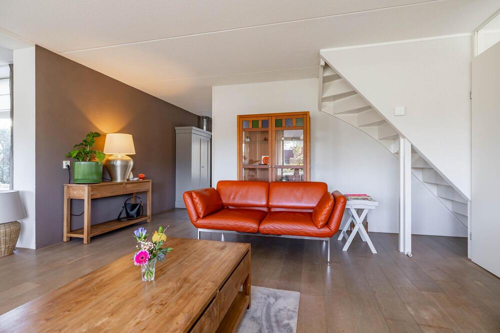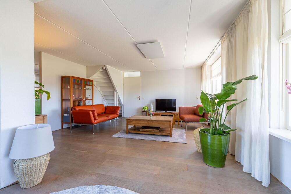 Lichte en ruim bemeten woonkamer met aparte zit-/werkhoek, eiken vloerdelen, open trap naar de verdieping en doorloop naar de keuken.