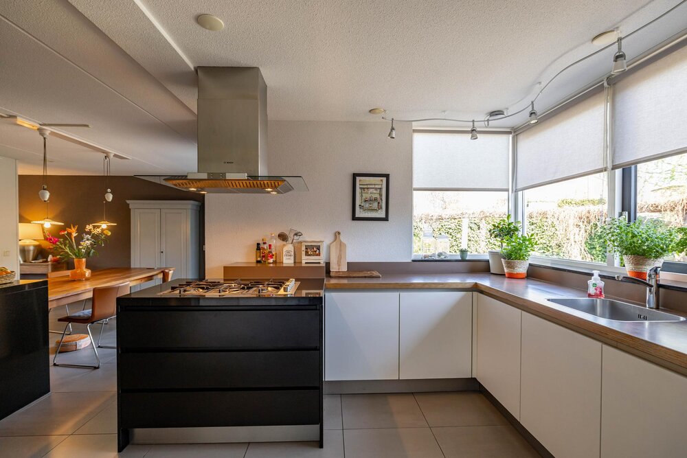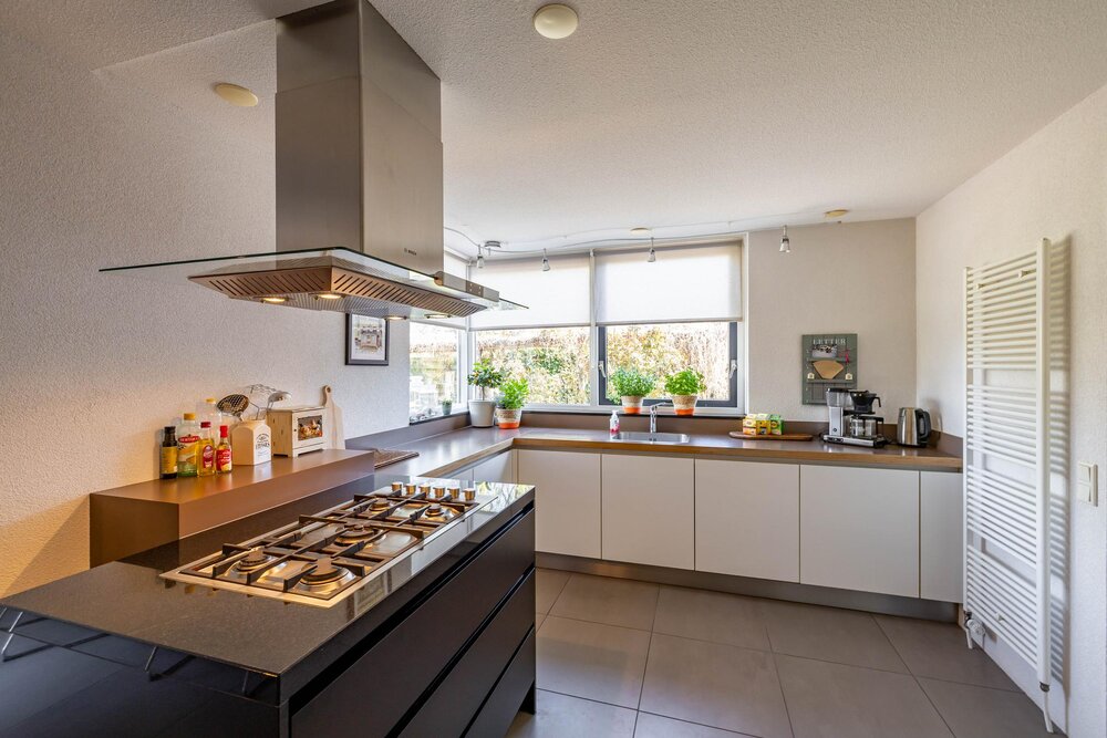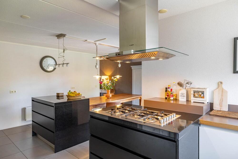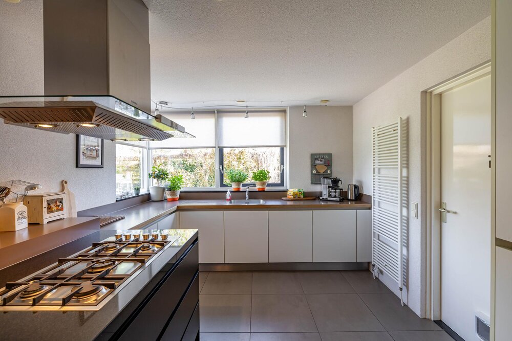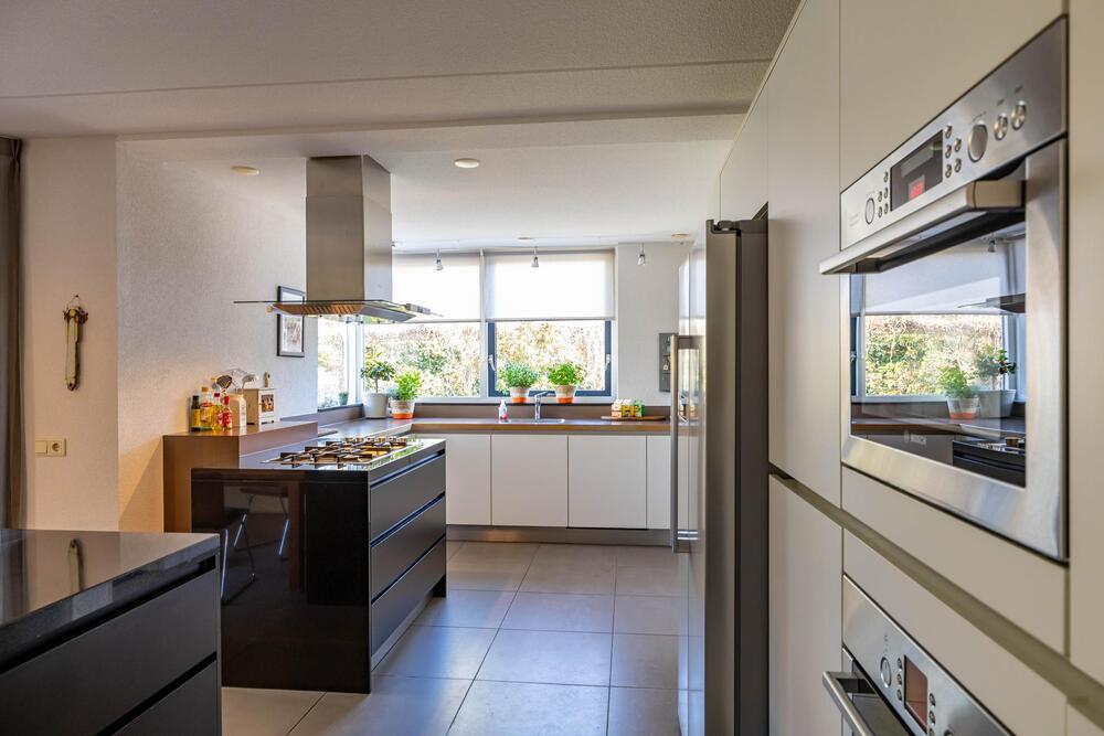 Heerlijke woonkeuken welke is voorzien van openslaande deuren naar de tuin en uiteraard ook van alle gemakken: kookeiland (2008) met grote gaskookplaat en rvs afzuigkap. Wandmeubel met oven, combimagnetron en grote Amerikaanse koelkast en onder het raam een meubel met de spoelbak en de vaatwasser. Veel bergruimte in boven- en onderkasten. Op de vloer liggen mooie plavuizen.
