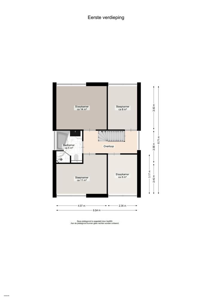 Vier praktische slaapkamers van 14, 11, 8 en 8 m2, allen voorzien van laminaatvloer.