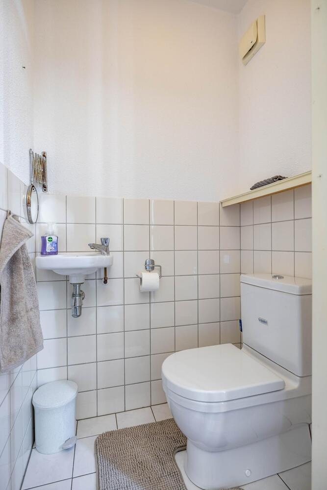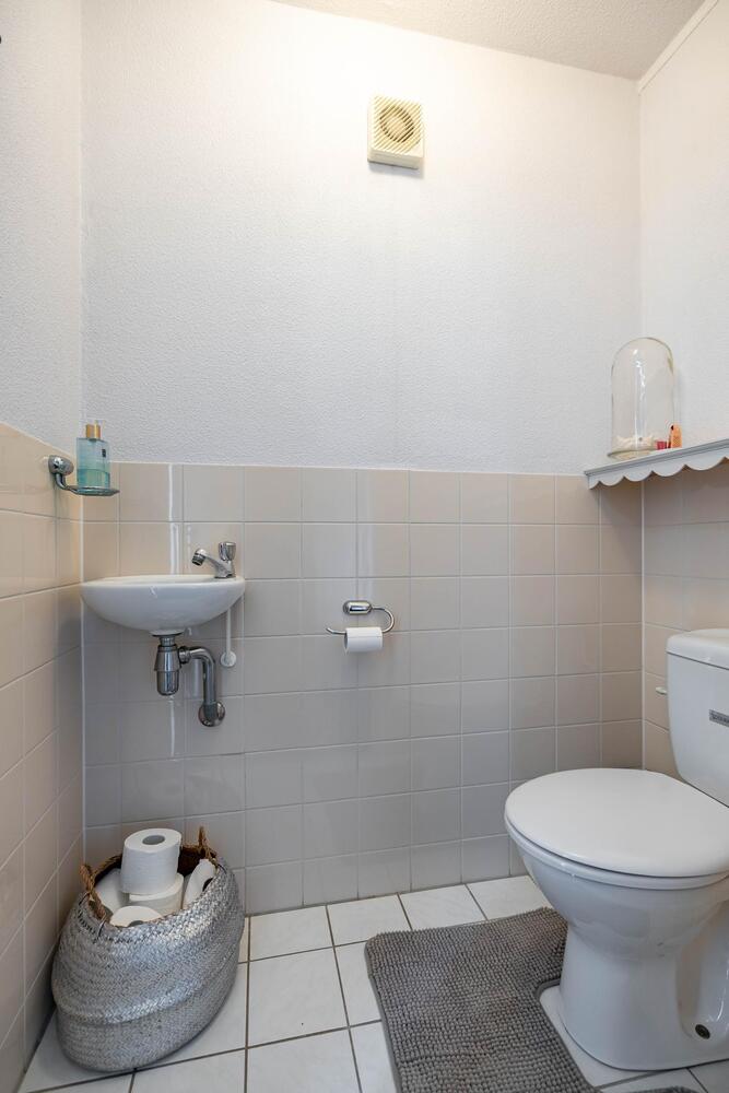 Doorloop naar de bijkeuken (ca. 7 m2) met tweede toilet, wasmachine- en drogeraansluiting en loopdeur naar de tuin.