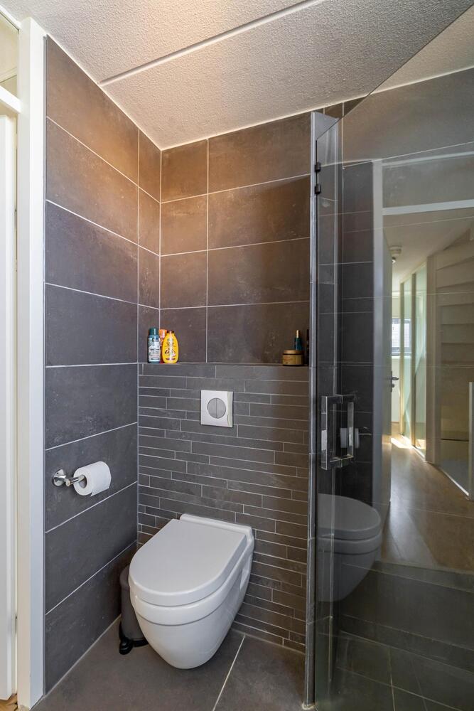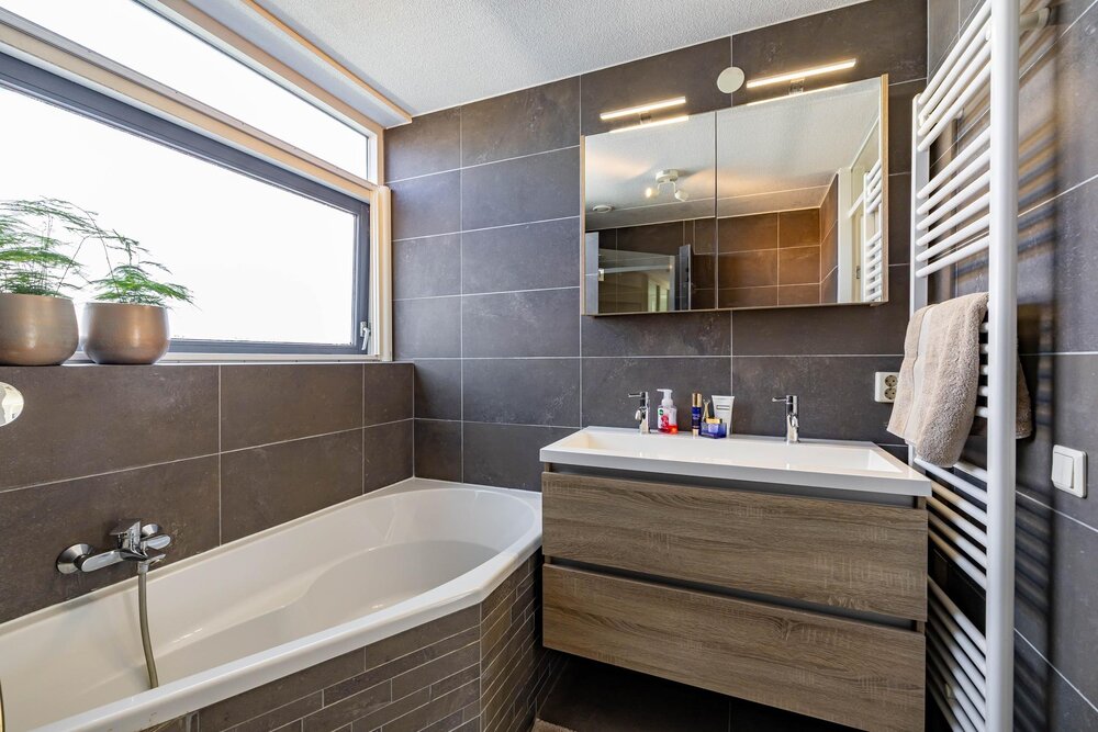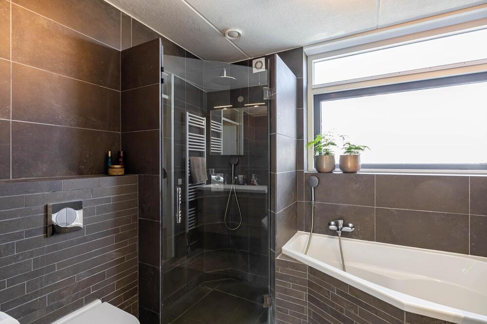 Comfortabele en moderne badkamer (ca. 5 m2, 2017, ontwerp Adrianne van Dijken) met ligbad, wastafelmeubel, douche en derde toilet.