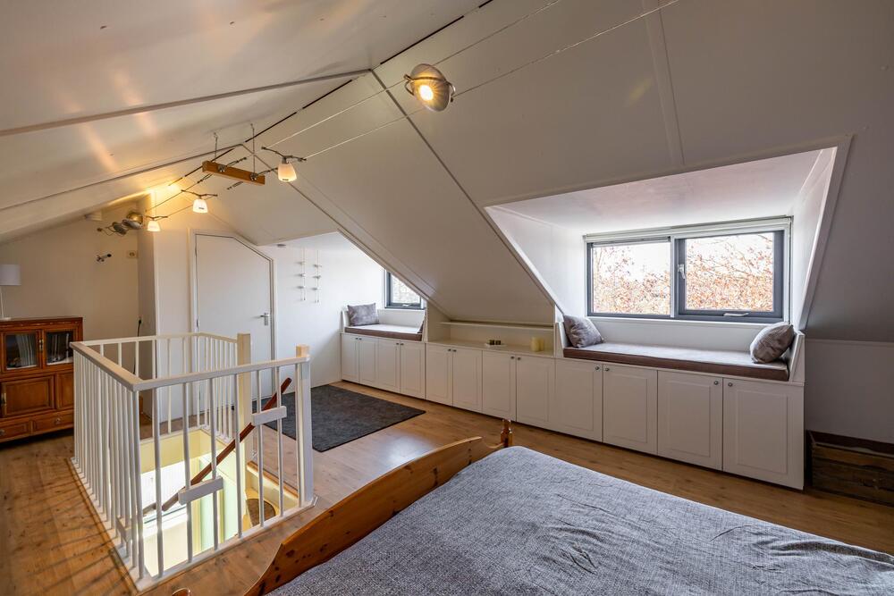 Prachtige open zolderslaapkamer (ca. 30 m2) met fraaie aftimmering, dubbele dakkapel, inbouwkasten en de stookruimte (CV ketel 2024, eigendom). Veel bergruimte achter de knieschotten.