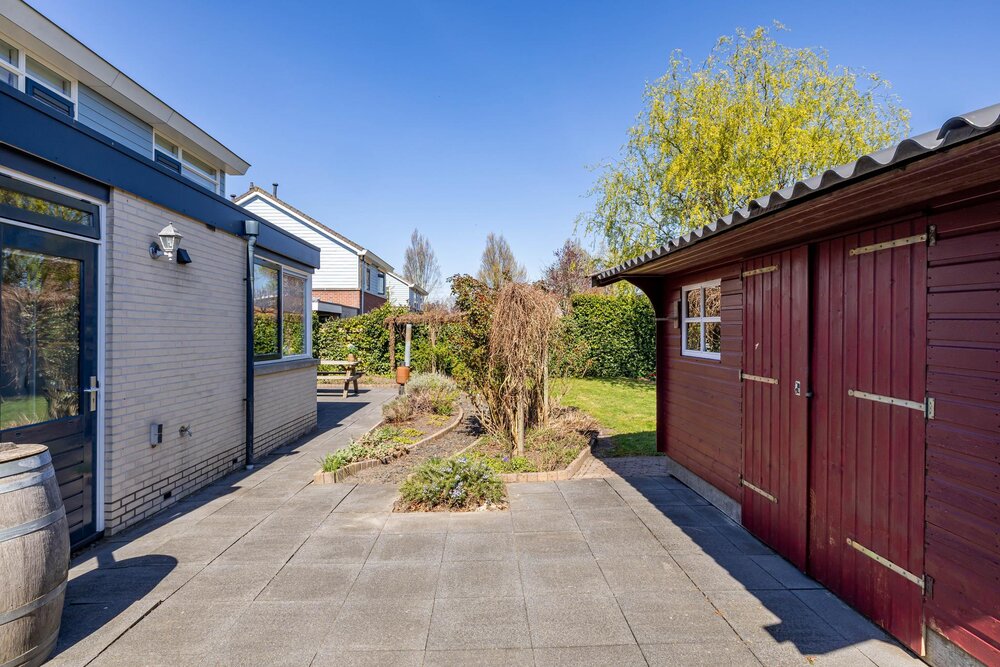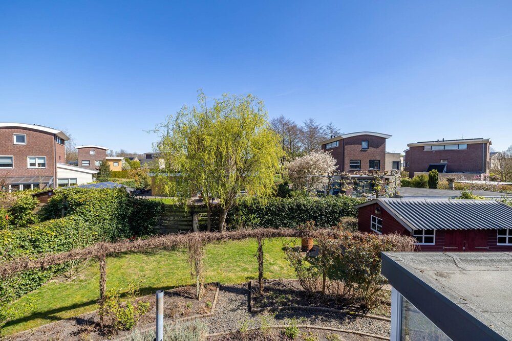 Rondom gelegen tuin met terrassen, gazon, borders, houten tuinchalet (5 x 3 meter) met zon- en schaduwplekjes. De tuin is onder architectuur aangelegd.