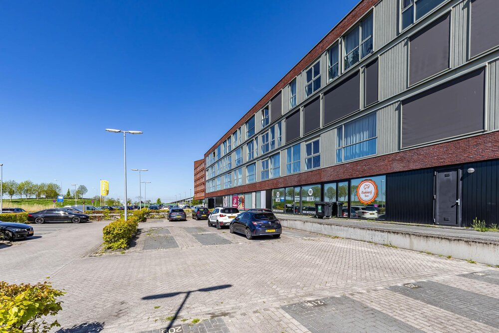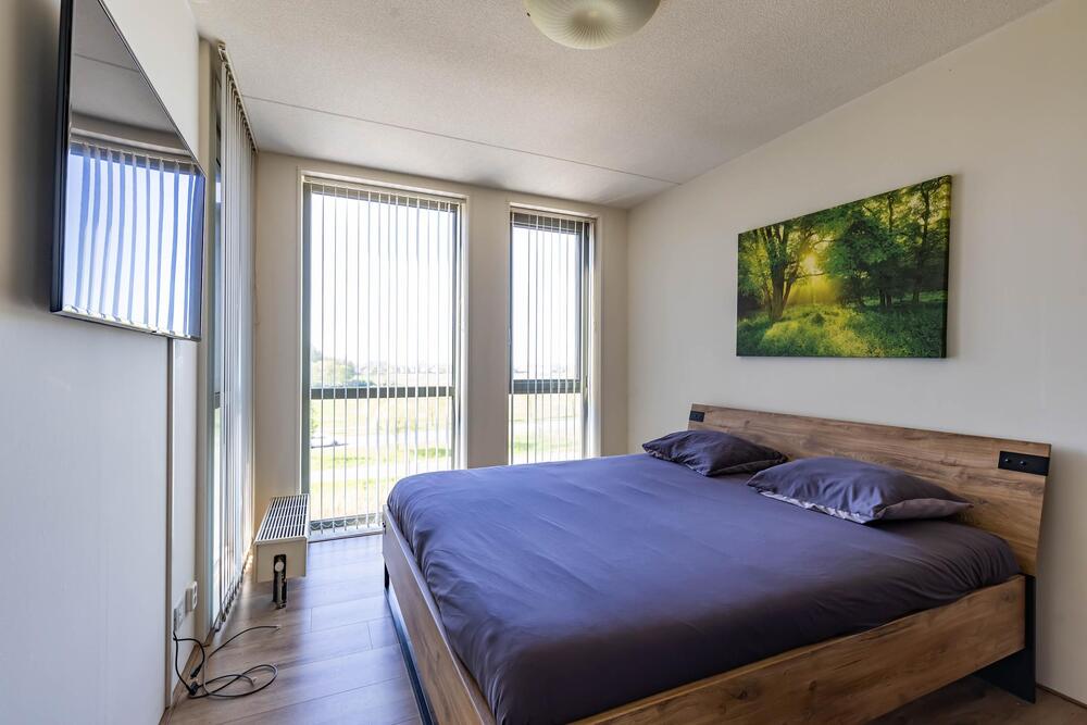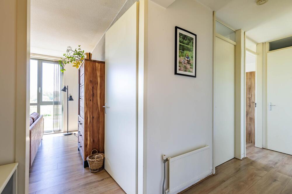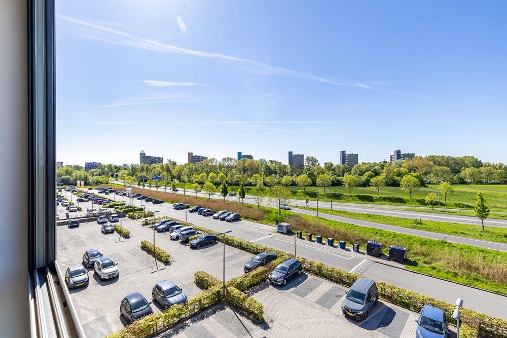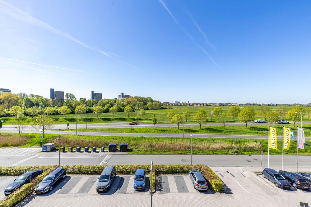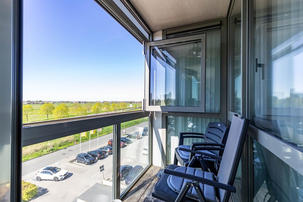 Balkon (ca. 2 m2) op het zuiden met uitzicht op het parkeerterrein, de Friesestraatweg en de weilanden.