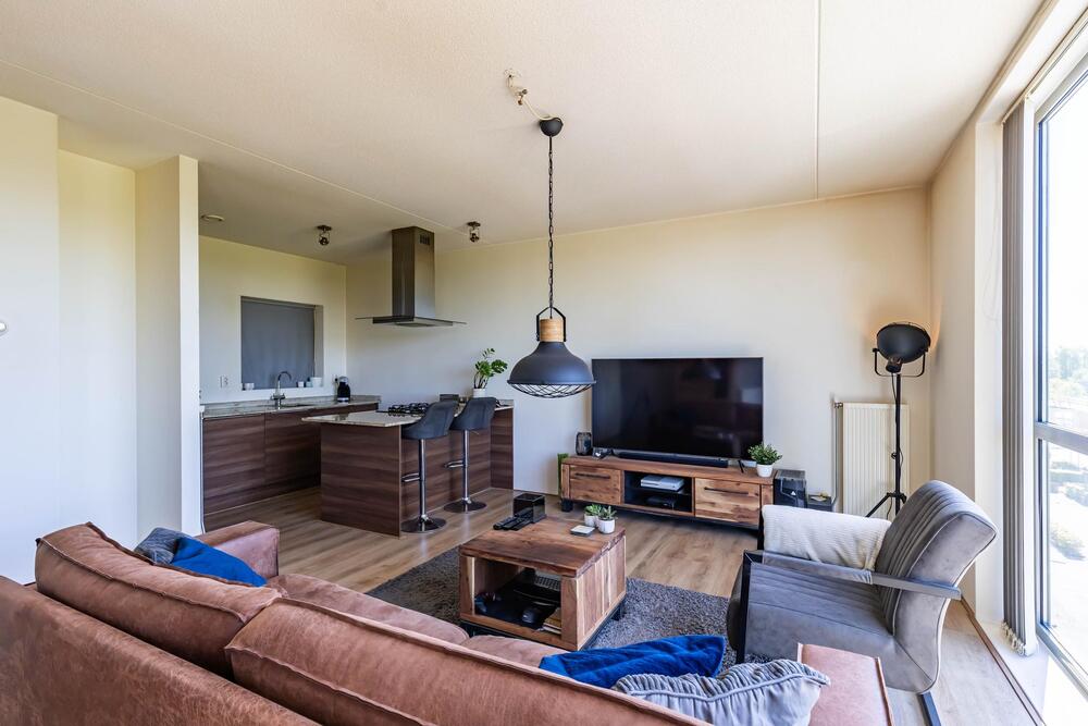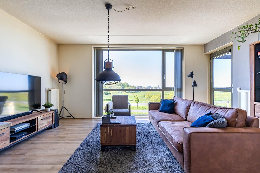 Lichte en gezellig woonkamer (ca. 27 m2, laminaatvloer) met toegang tot het balkon met uitzicht over het voorgelegen gebied.