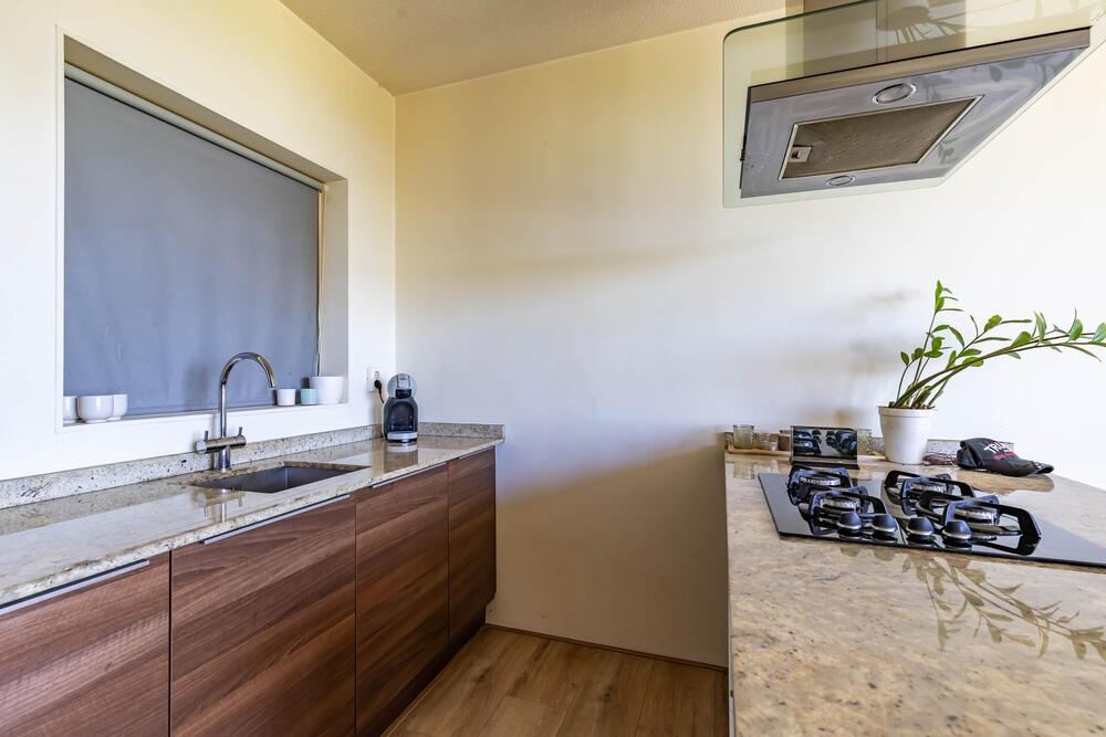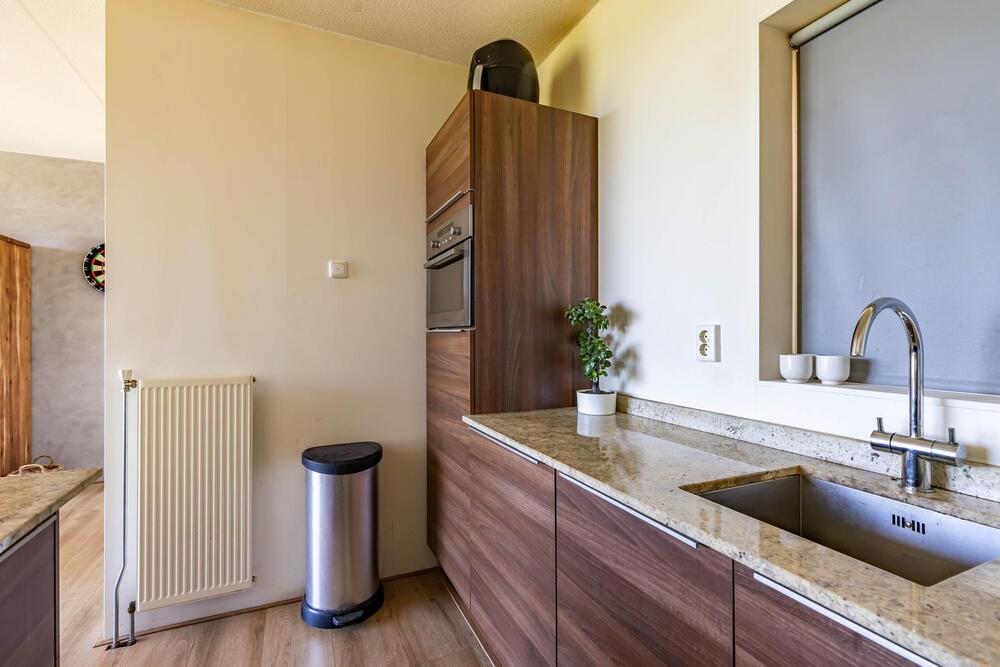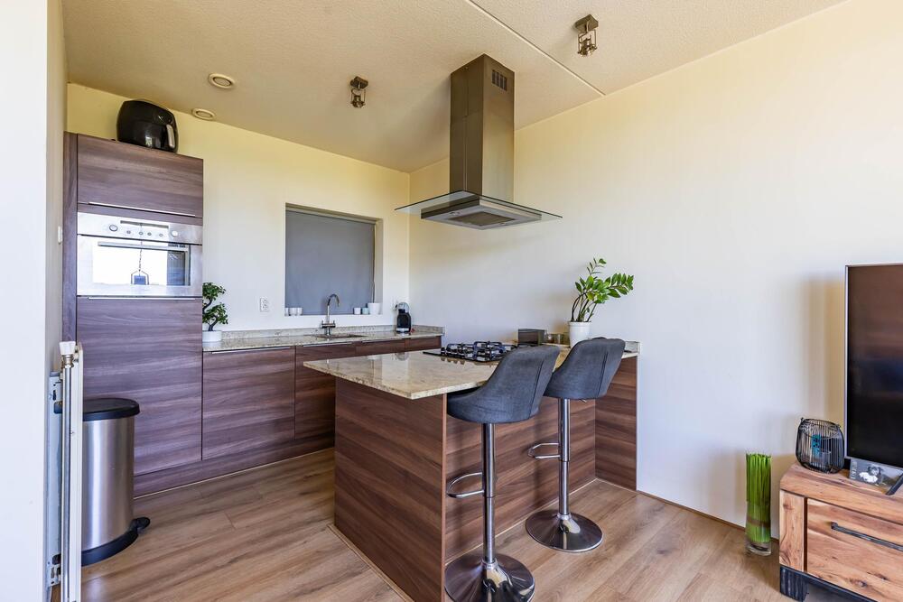 Luxe open keuken (2010) voorzien van kookeiland met gaskookplaat, afzuigkap en bar. Wandmeubel met vaatwasser, koelkast en oven. Het raam in de keuken kijkt uit op het bordes en het atrium.