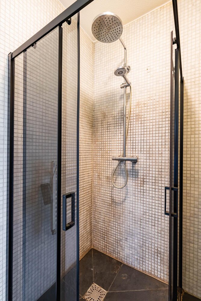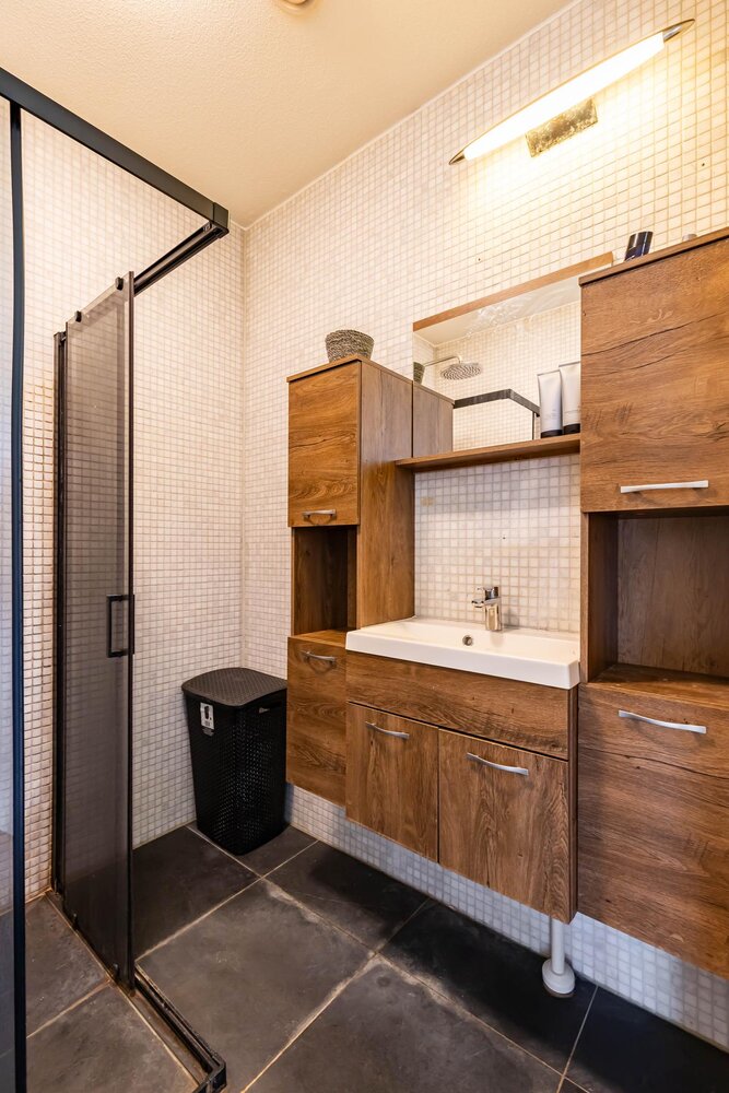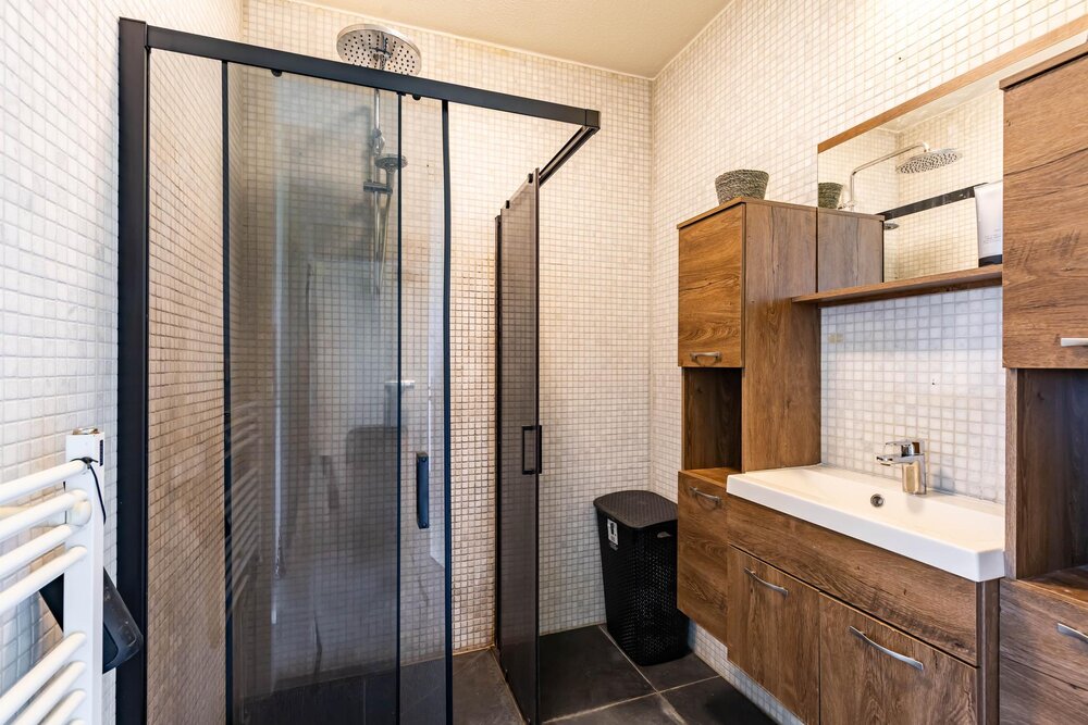 Luxe badkamer (ca. 3m2) met inloopdouche, wastafelmeubel en handdoekradiator.