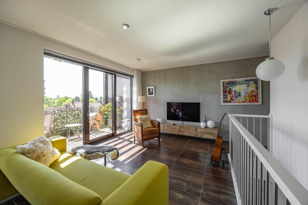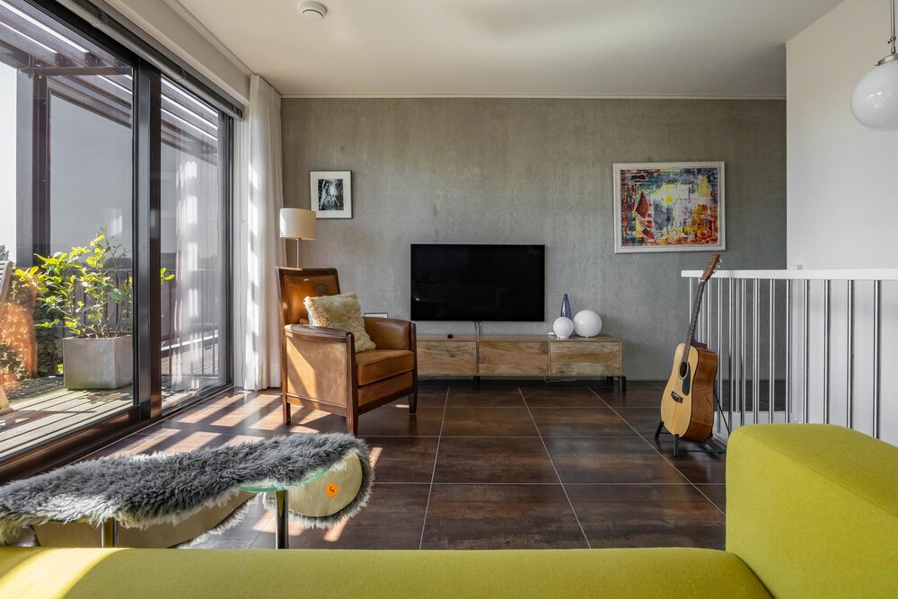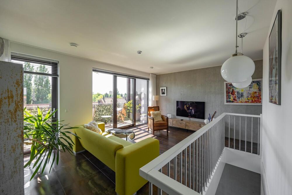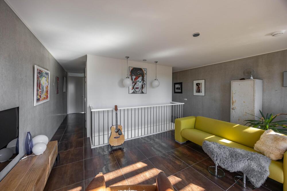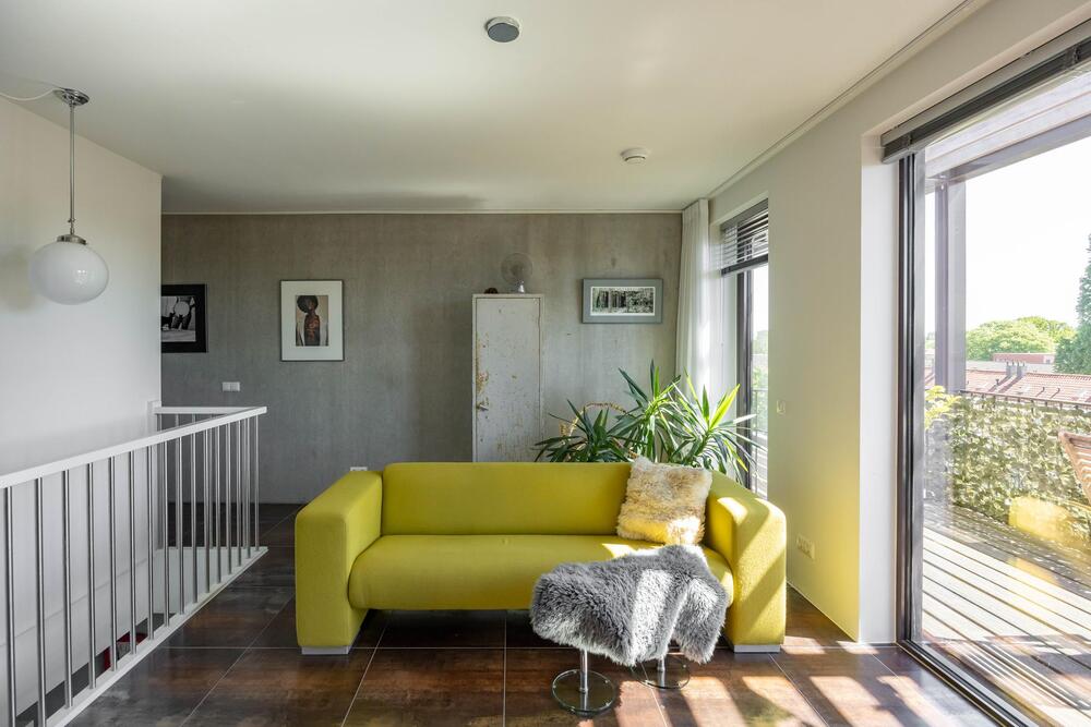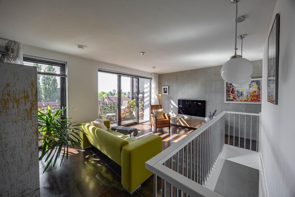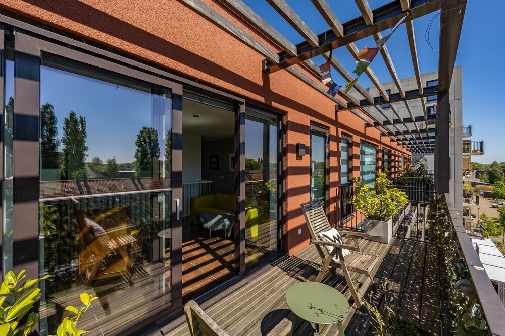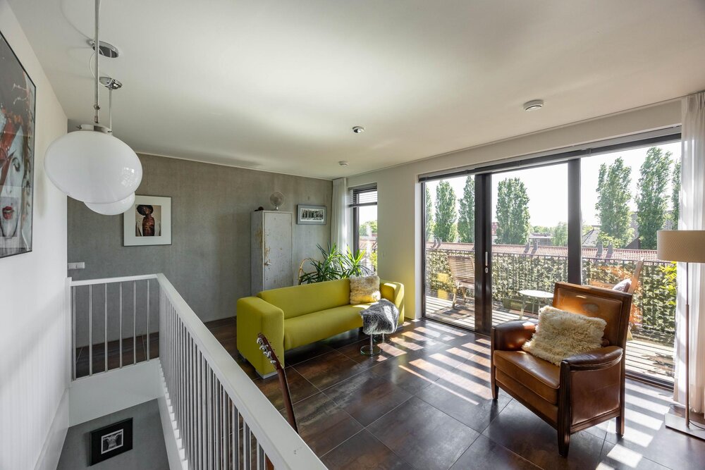 Je komt boven op de ruime overloop. Aan de voorkant van de woning bevinden zich twee slaapkamers (15 en 9 m2). De badkamer (6 m2) bevindt zich in het midden van de woning en is voorzien van dubbele wastafel, ruime inloopdouche en tweede toilet. Aan de achterkant van de woning is een tweede woonkamer (24 m2) met toegang tot het zeer ruime terras/balkon (13 m2) op het zuidoosten.