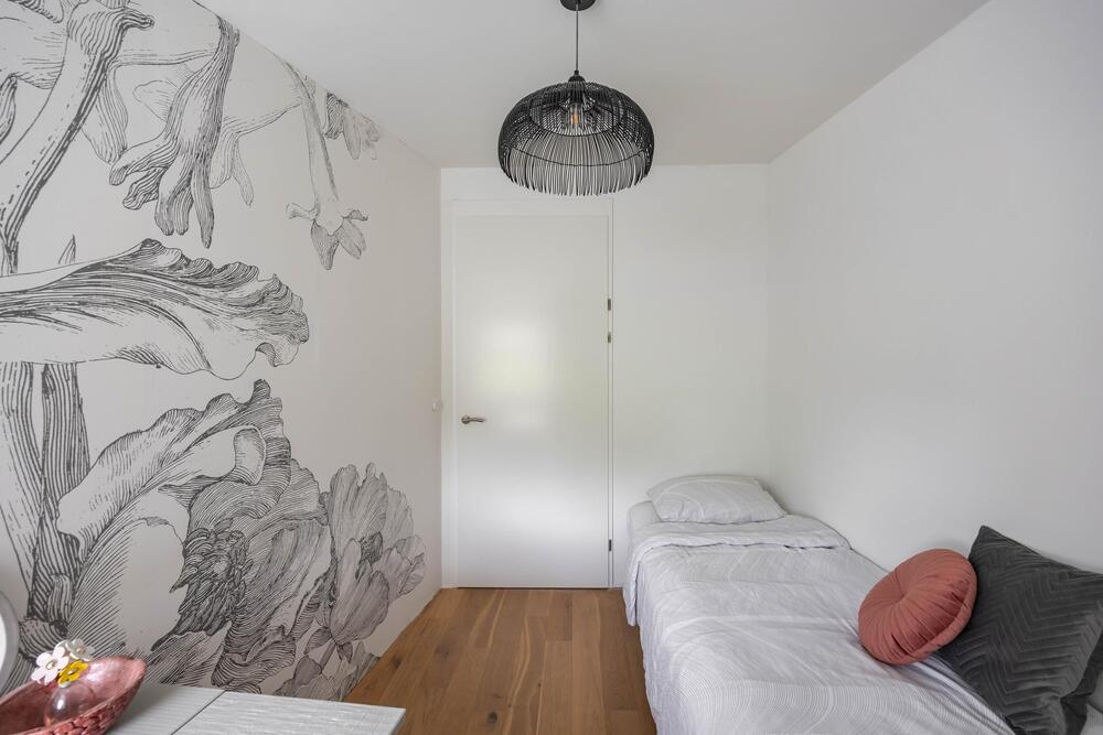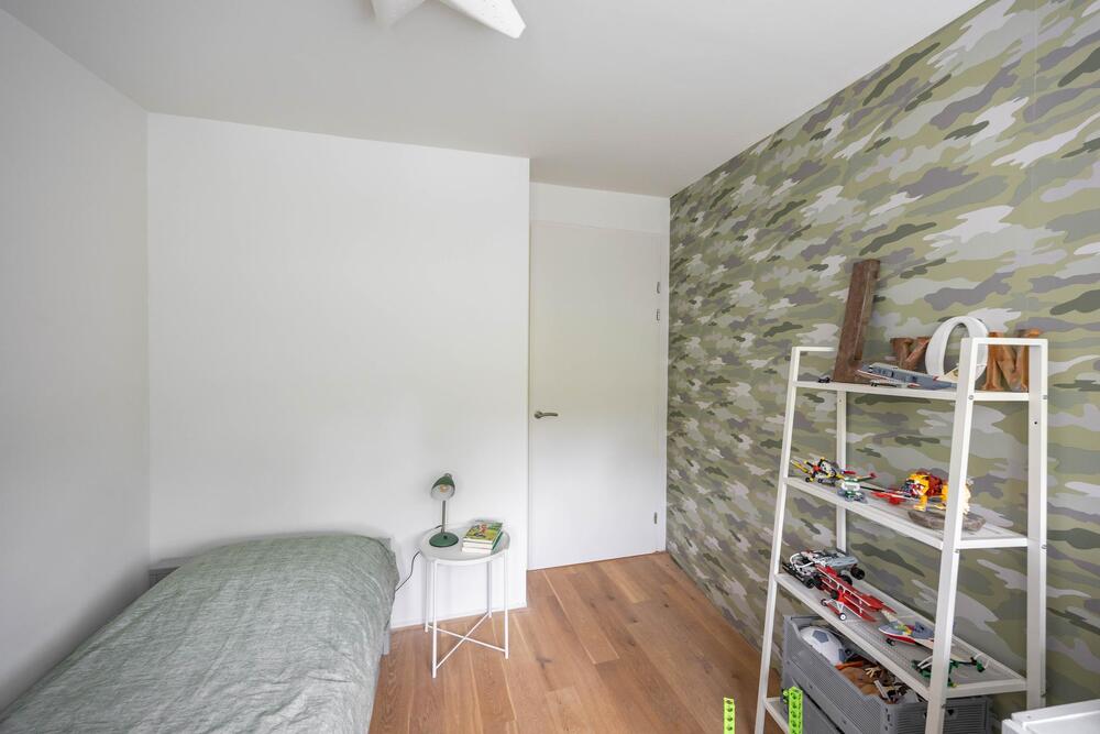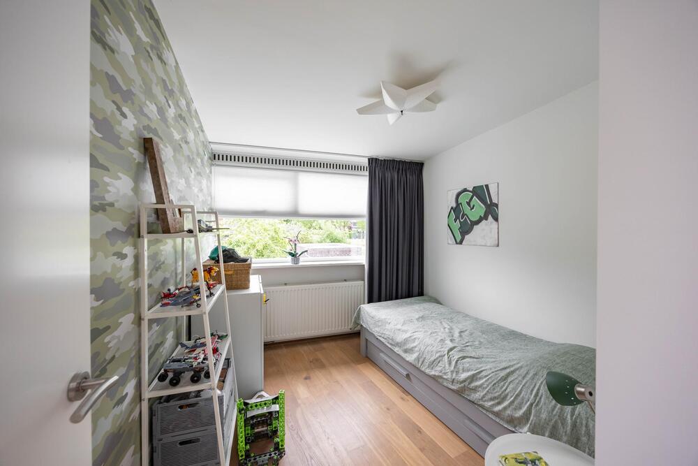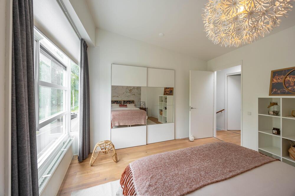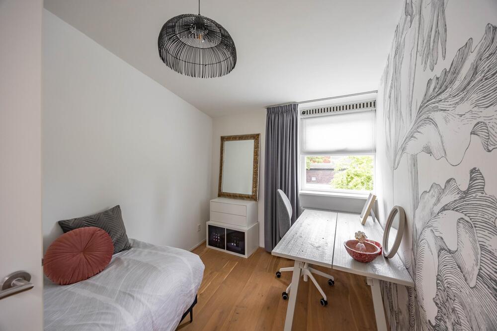 Eerste verdieping: overloop met een lichtkoepel en bergruimte, ruime slaapkamer (19 m2) met inbouwkast en een erker met een hoge raampartij die ruim uitzicht biedt over groen. De twee slaapkamers aan de achterzijde van de woning zijn eveneens licht (9 en 8 m2). De badkamer is voorzien van een douchecabine, toilet en wastafel.