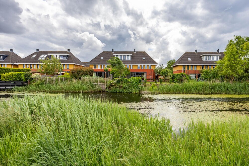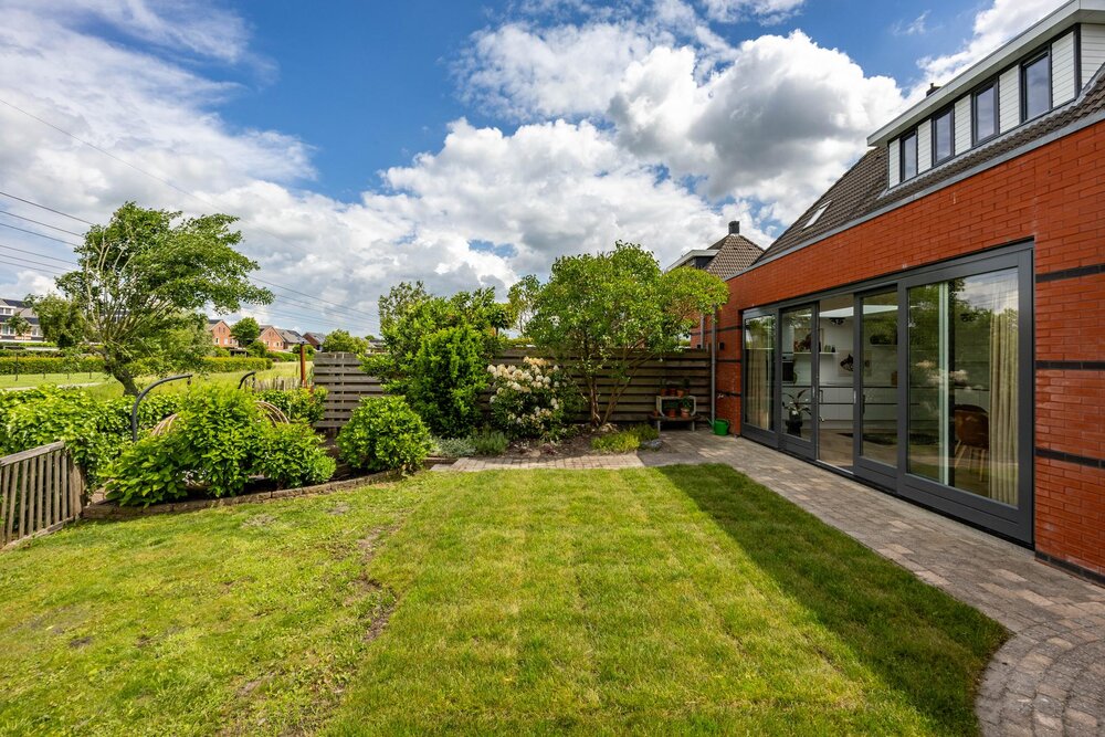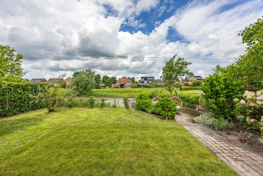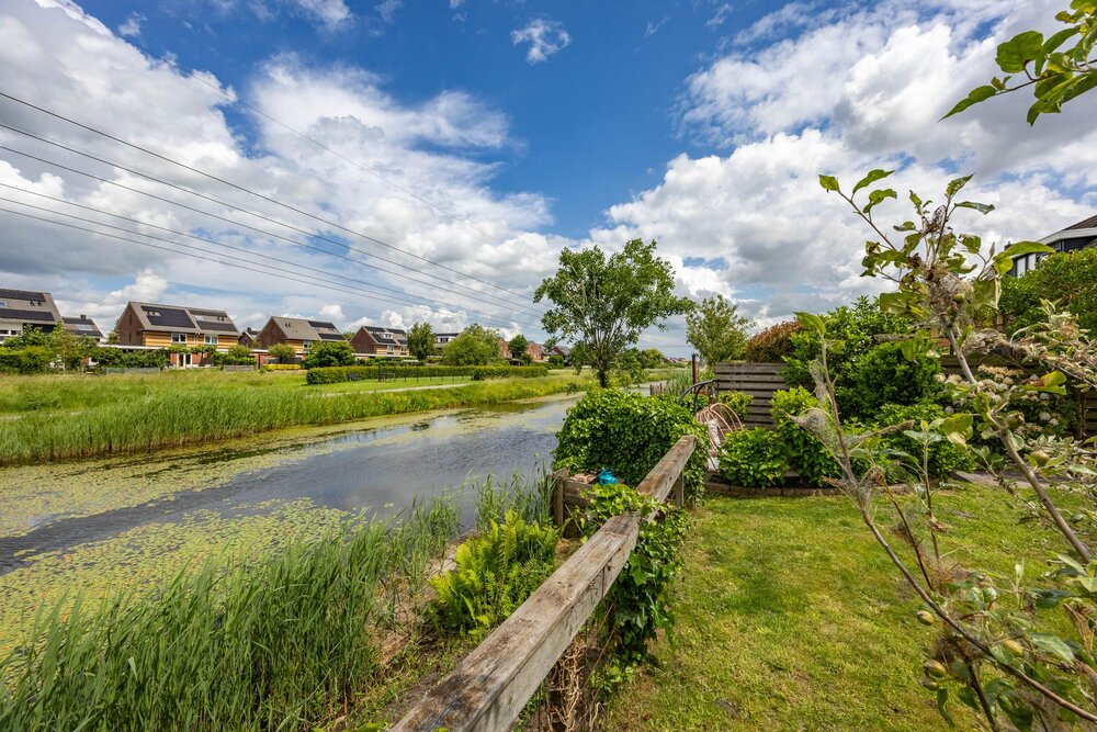 De fraai aangelegde achtertuin beschikt over een terras aan de woning en een verdiepte zitkuil. Hier kun je heerlijk genieten van de zon aan het water, en door de brede groenstrook gelegen achter de woning, met een gevoel van vrij uitzicht. Aan de zijkant van de woning bevindt zich nog een houten berging voor het opbergerg van de tuinspullen.