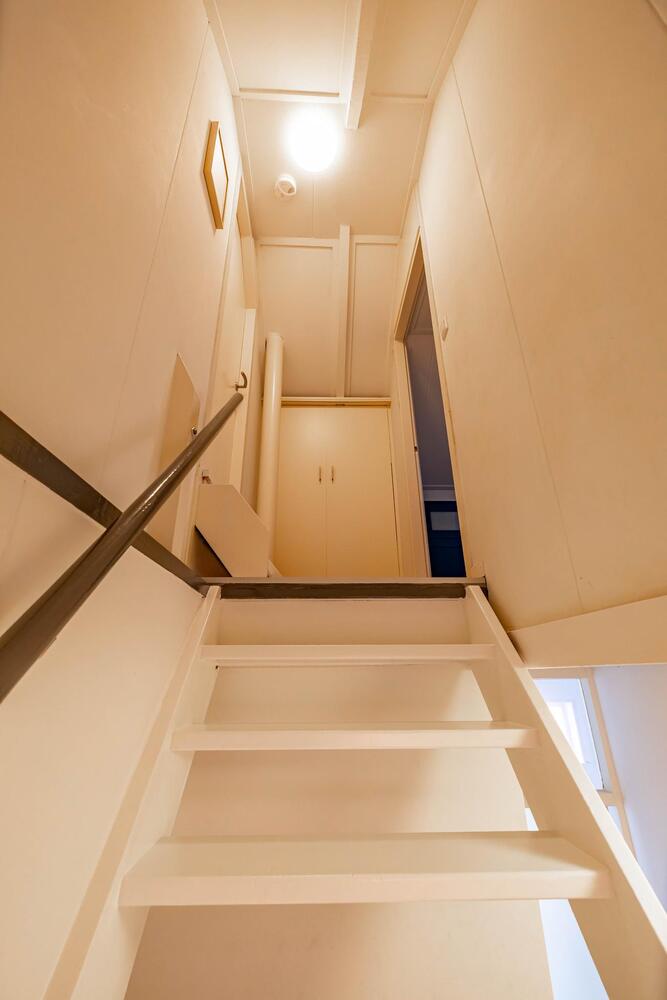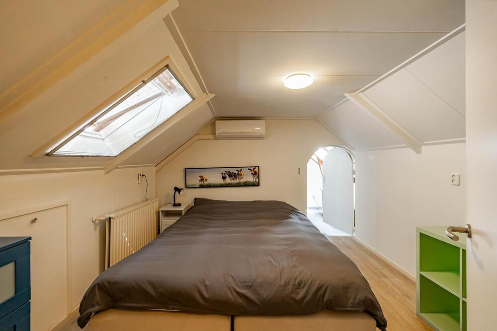 Eerste verdieping: overloopje, links de eerste slaapkamer van ruim 7 m2. Rechts de tweede slaapkamer 11 m2 met dakraam en doorloop naar de derde slaapkamer van ca. 6 m2.