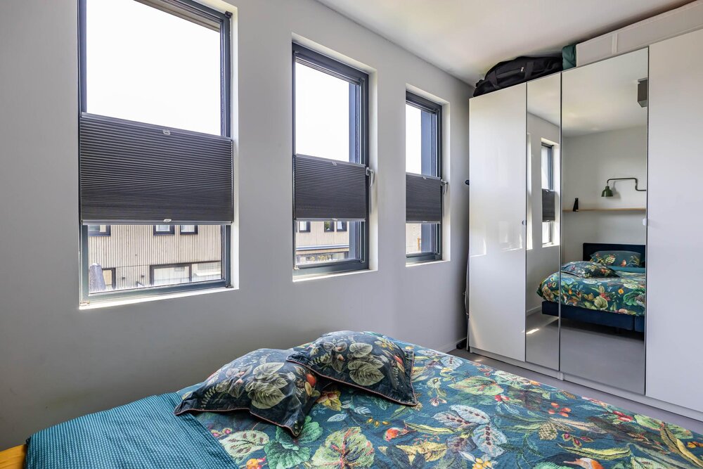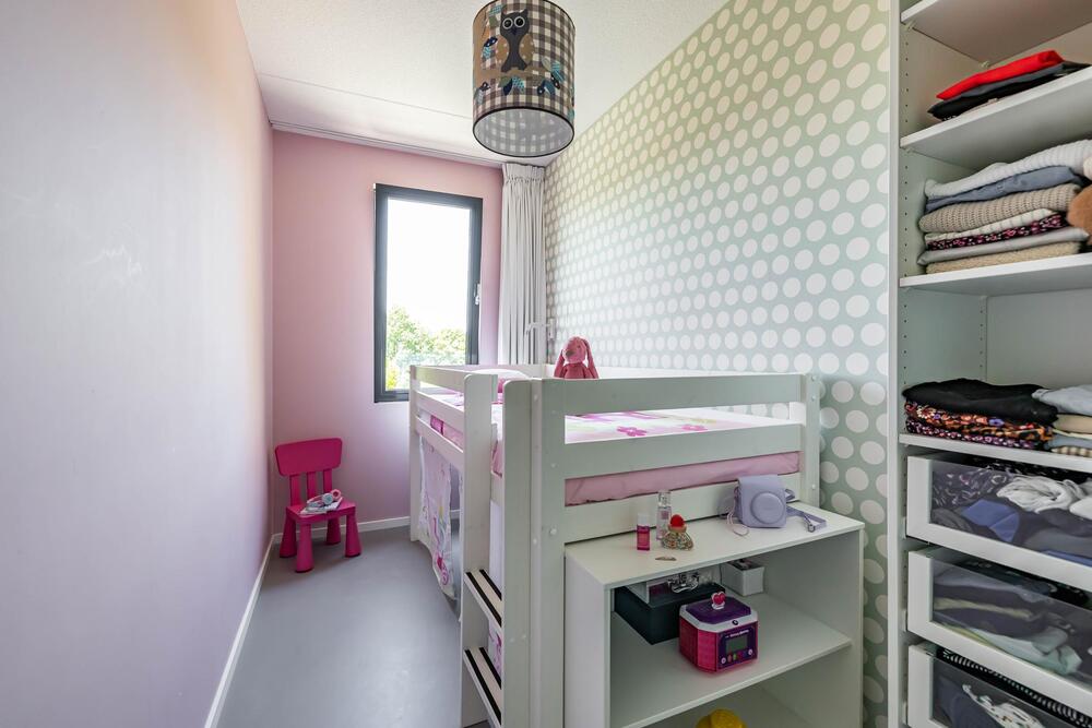 Tweede verdieping: overloop, 3 slaapkamers (10, 7 en 7 m2), technische ruimte (2m2) en een strakke badkamer van 5 m2 met douche, tweede toilet en dubbele wastafel.