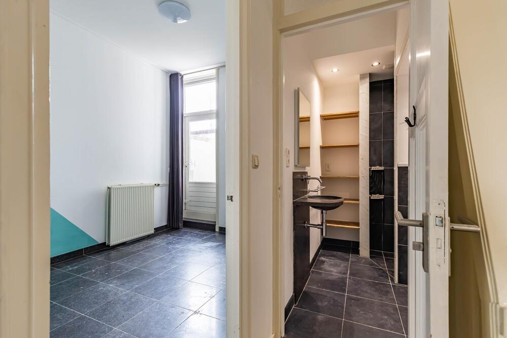 Binnenkomst in de hal. Aan de voorzijde van de woning een handige en multifunctionele ruimte (te gebruiken als bijvoorbeeld kantoorruimte, woonkamer of slaapkamer) van ca. 20m² met een sfeervolle hardstenen schouw. Aan de achterzijde een slaapkamer van ca 11m² met toegang tot het binnenplaatsje. Beide ruimtes zijn voorzien van vloerverwarming met een hardstenen vloer voor extra comfort.