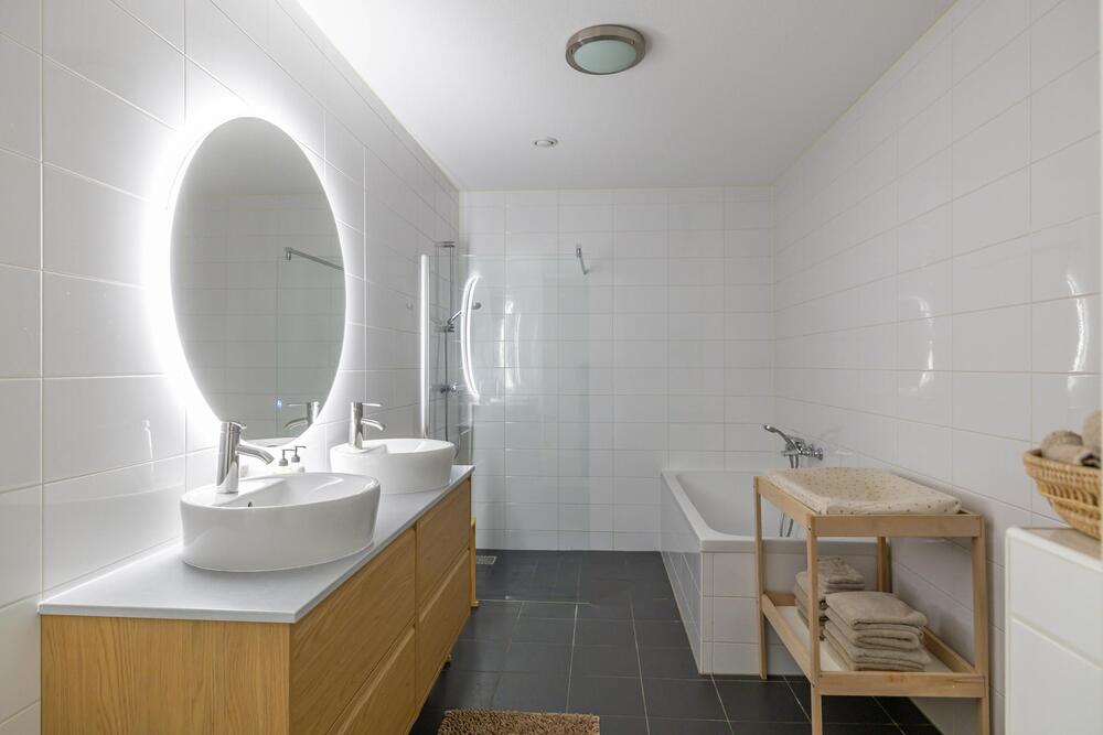 overloop, vier grote slaapkamers (circa 21, 20, 11 en 11m²) en een ruime badkamer met douche, ligbad, wastafel en een tweede toilet.