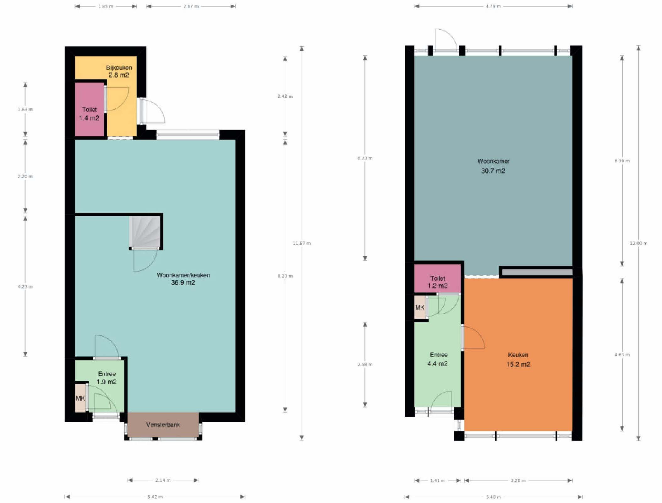Plattegrond met oppervlaktes, maten, ramen en deuren.