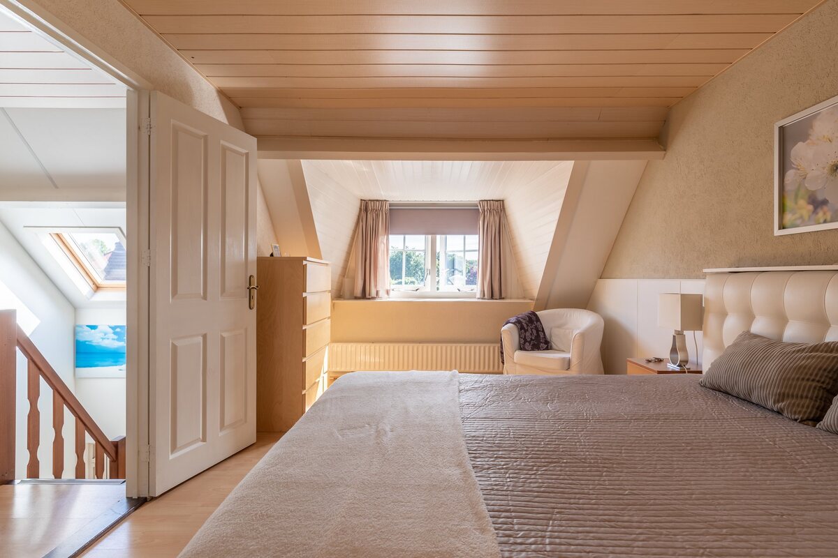 Eerste verdieping: via de overloop (met vide) is er toegang tot drie slaapkamers en een badkamer. De slaapkamers zijn respectievelijk 10,5m², 13m² en 19m² groot. De tweede badkamer is voorzien van een dubbele wastafel, toilet en inloopdouche. Vanuit de grote slaapkamer is er toegang tot nog een vierde slaapkamer ca. 11,6m². Deze kamer kan ook nog dienst doen al werk-/studeerkamer.
